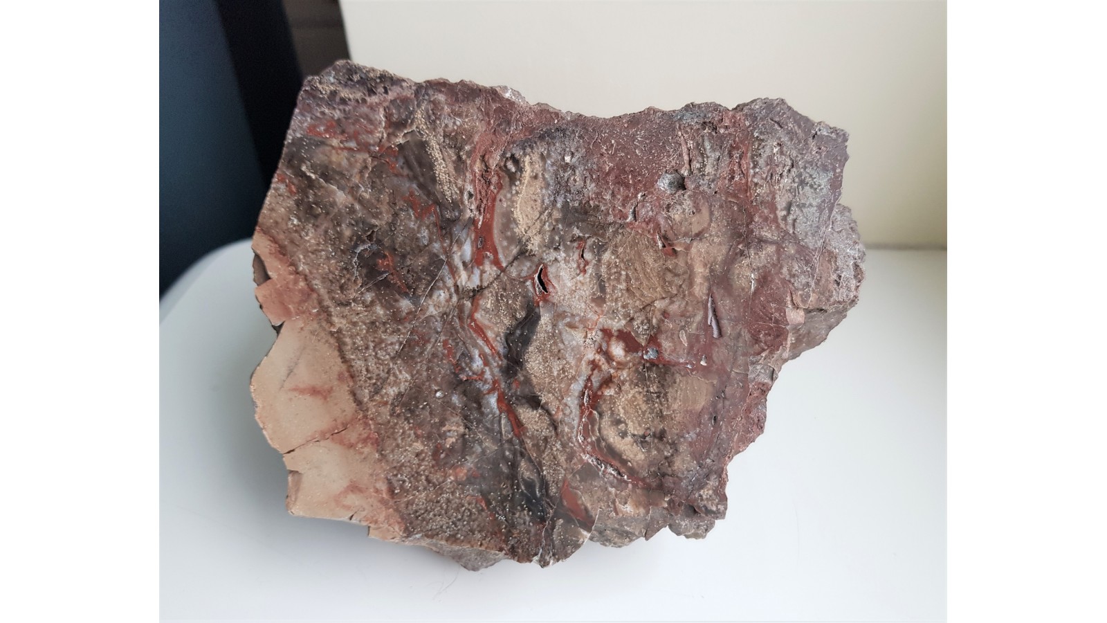Brązowo-czerwony jaspis z historycznej lokalizacji w rowie Czerwieńczyc pomiędzy Nową Rudą a Kłodzkiem. Jaspis z ciekawymi strukturami zatokowymi oraz widoczną strefą brzeżną sekrecji. Jaspisy pochodzą z diabazów. Idealny poler. Nieznane wśrod kolekcjonerów miejsce występowania jaspisu i bardzo rzadko - agatów jako strefy w jaspisach. Strona przeciwna naturalna, nie cięta. Duży, solidny okaz oraz ciekawostka z uwagi na lokalizację.