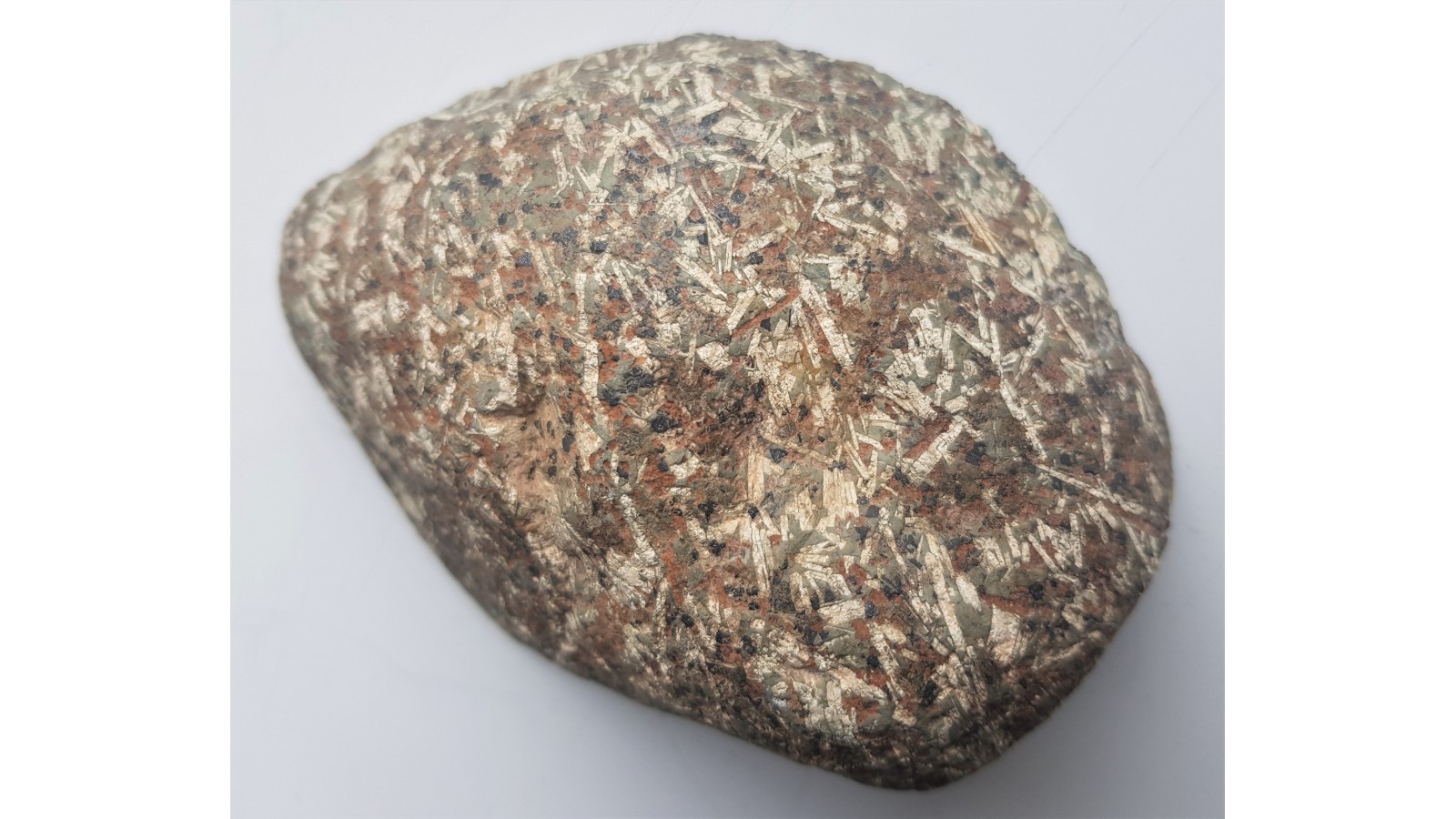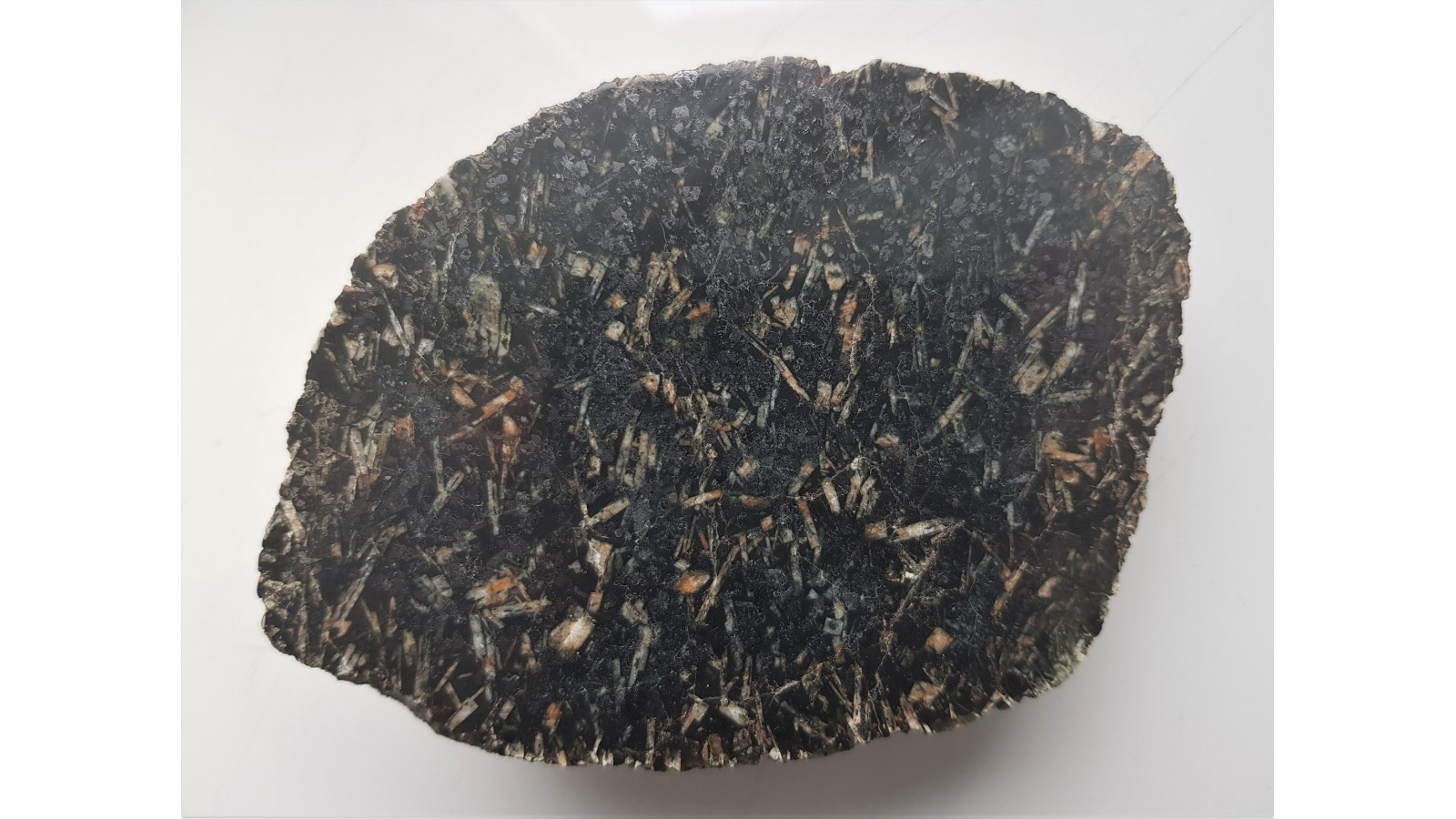 Piękny okaz hiperytu, skały podobnej do diabazu z wyrazistymi, ukierunkowanymi listewkami plagioklazu oraz ciemnymi piroksenami oraz nieprzezroczystymi minerałami żelaza. Skała pierwotnie ze Szwecji, z okolic jez. Vetter, proterozoiczna (900 mln do 1,5 mld lat). Skała atrakcyjna tak na przekroju jak i powierzchni. Strona przeciwna naturalna, nie cięta. Idealny poler. Polecam.