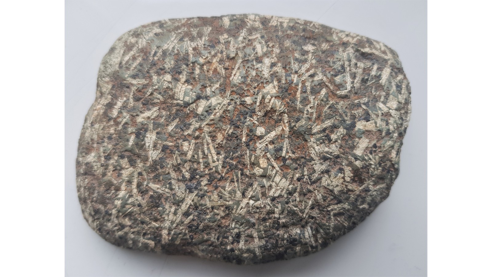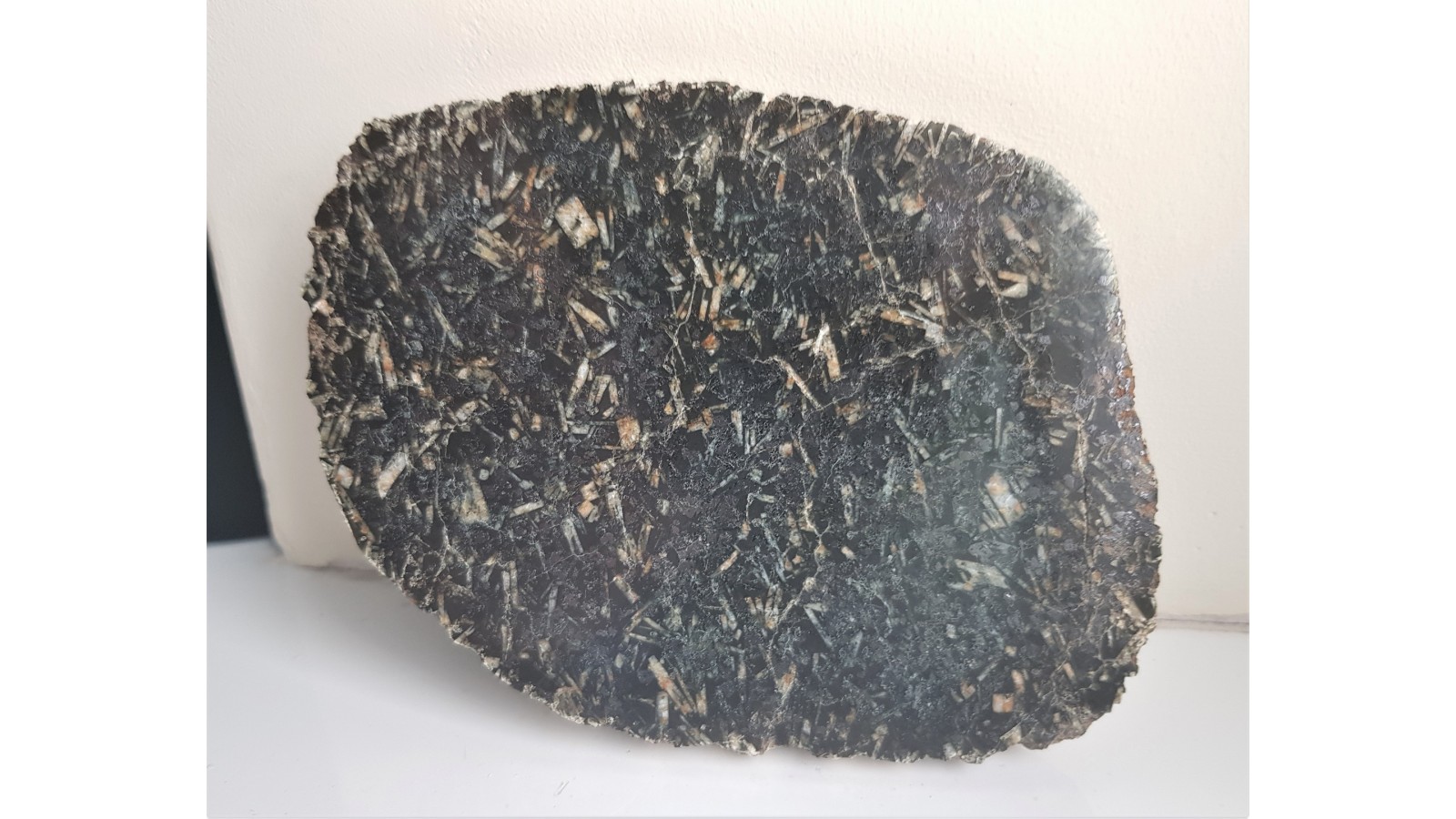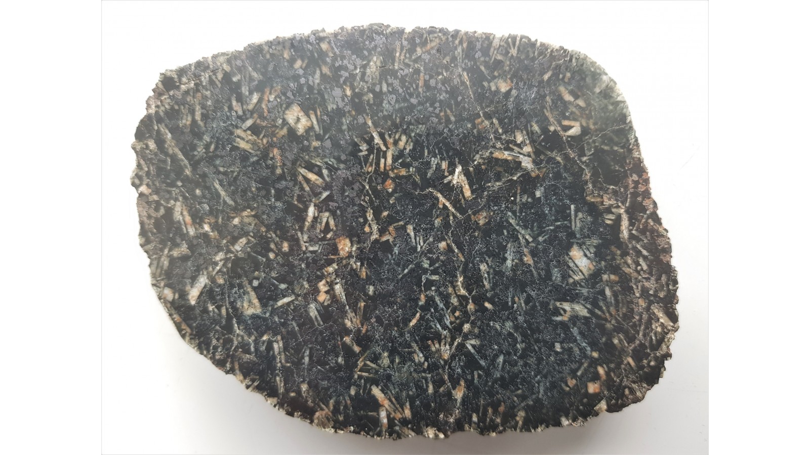 Piękny okaz hiperytu, skały podobnej do diabazu z wyrazistymi, ukierunkowanymi listewkami plagioklazu oraz ciemnymi piroksenami oraz nieprzezroczystymi minerałami żelaza. Skała pierwotnie ze Szwecji, z okolic jez. Vetter, proterozoiczna (900 mln do 1,5 mld lat). Skała atrakcyjna tak na przekroju jak i powierzchni. Strona przeciwna naturalna, nie cięta. Idealny poler. Polecam.