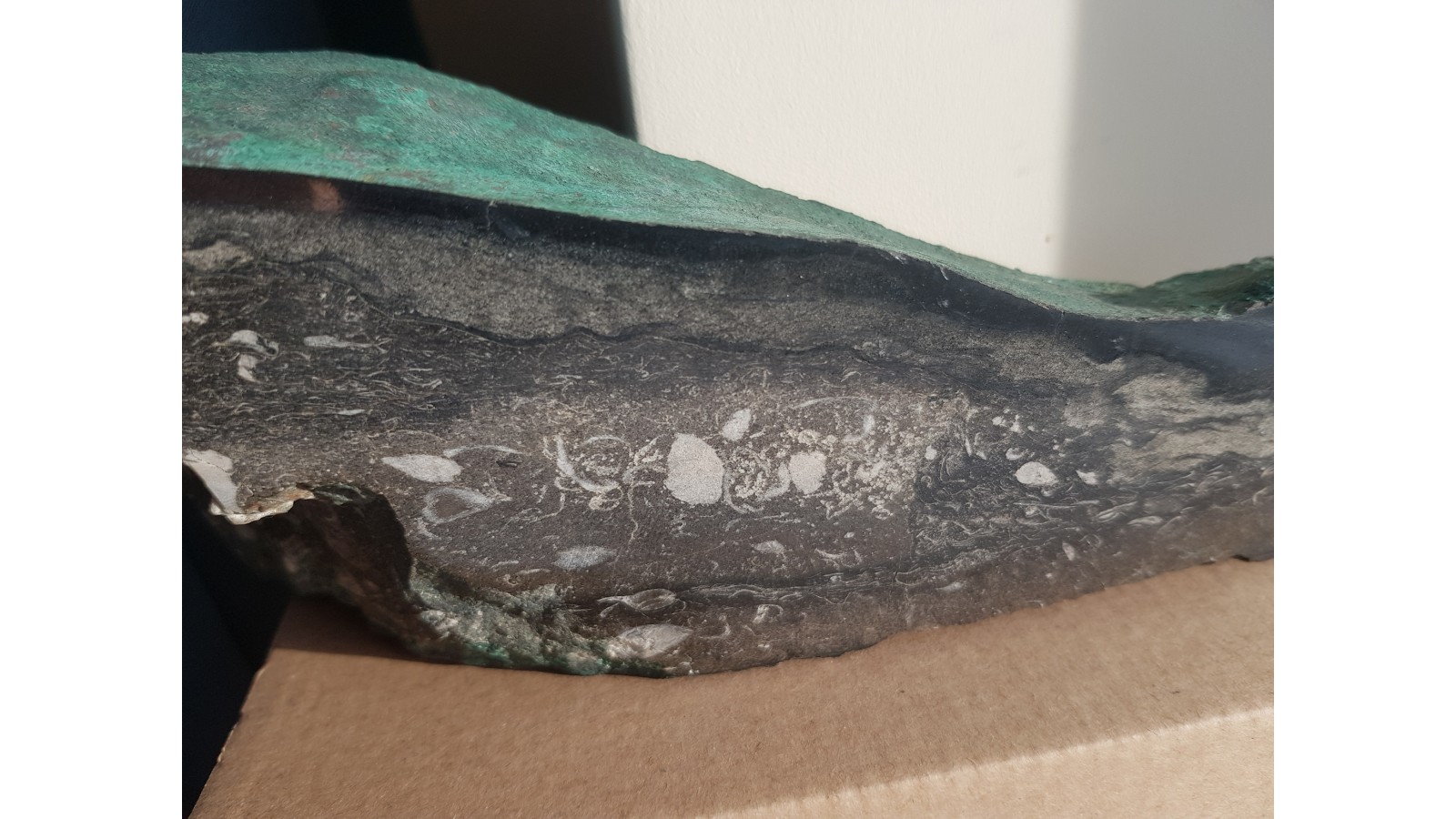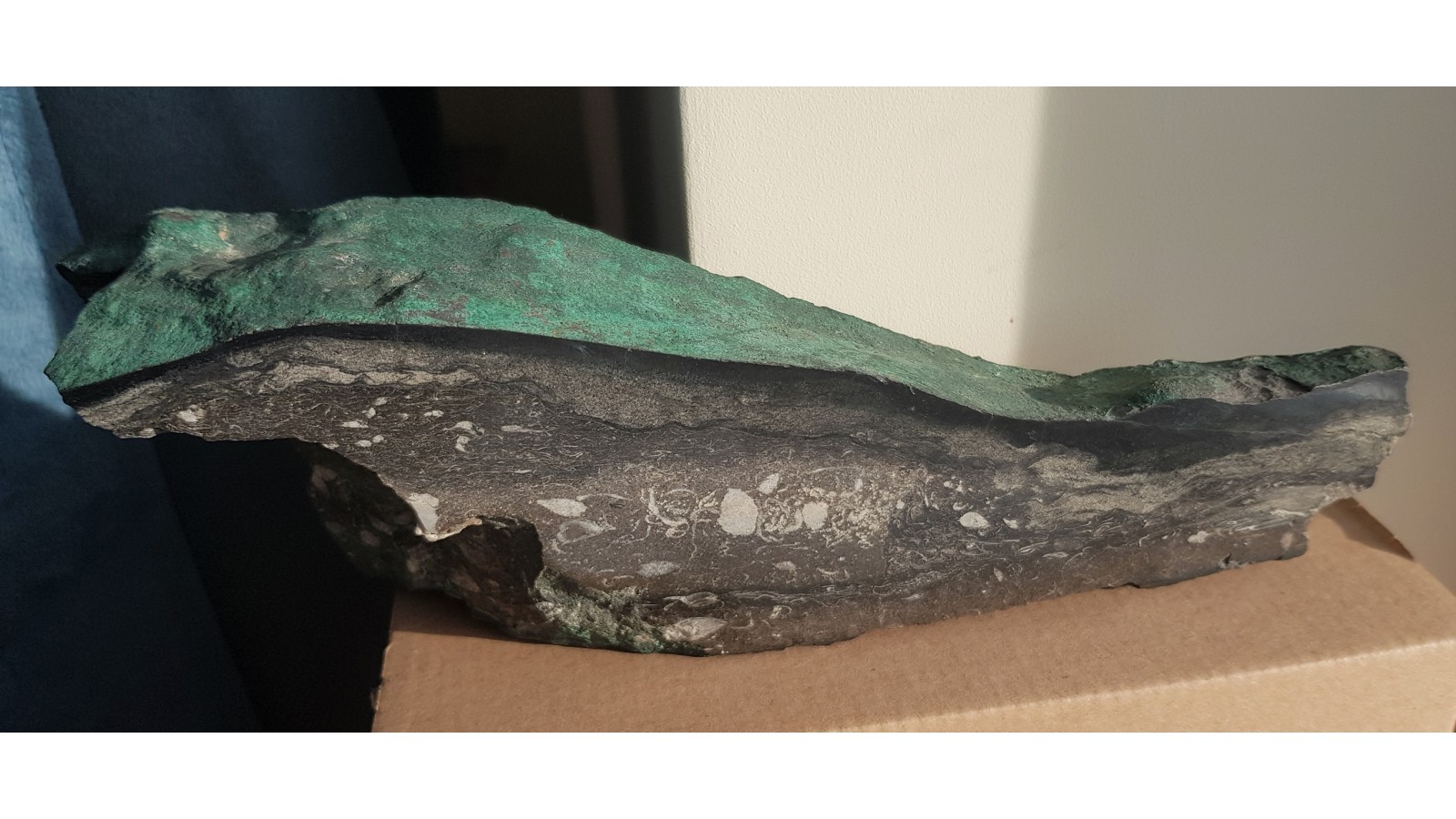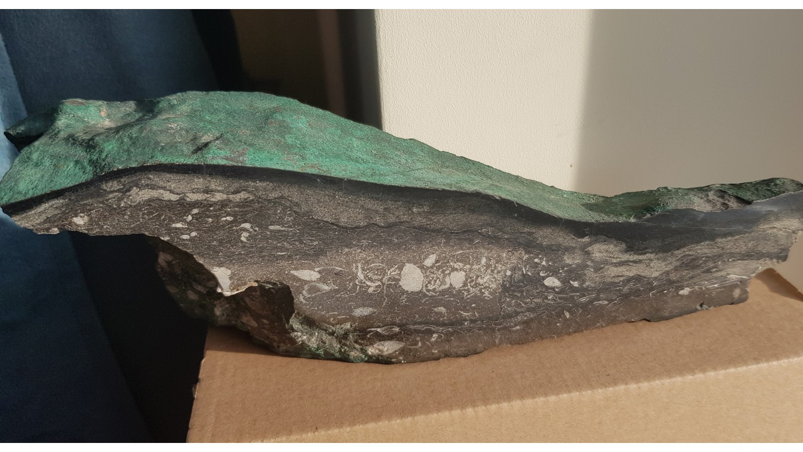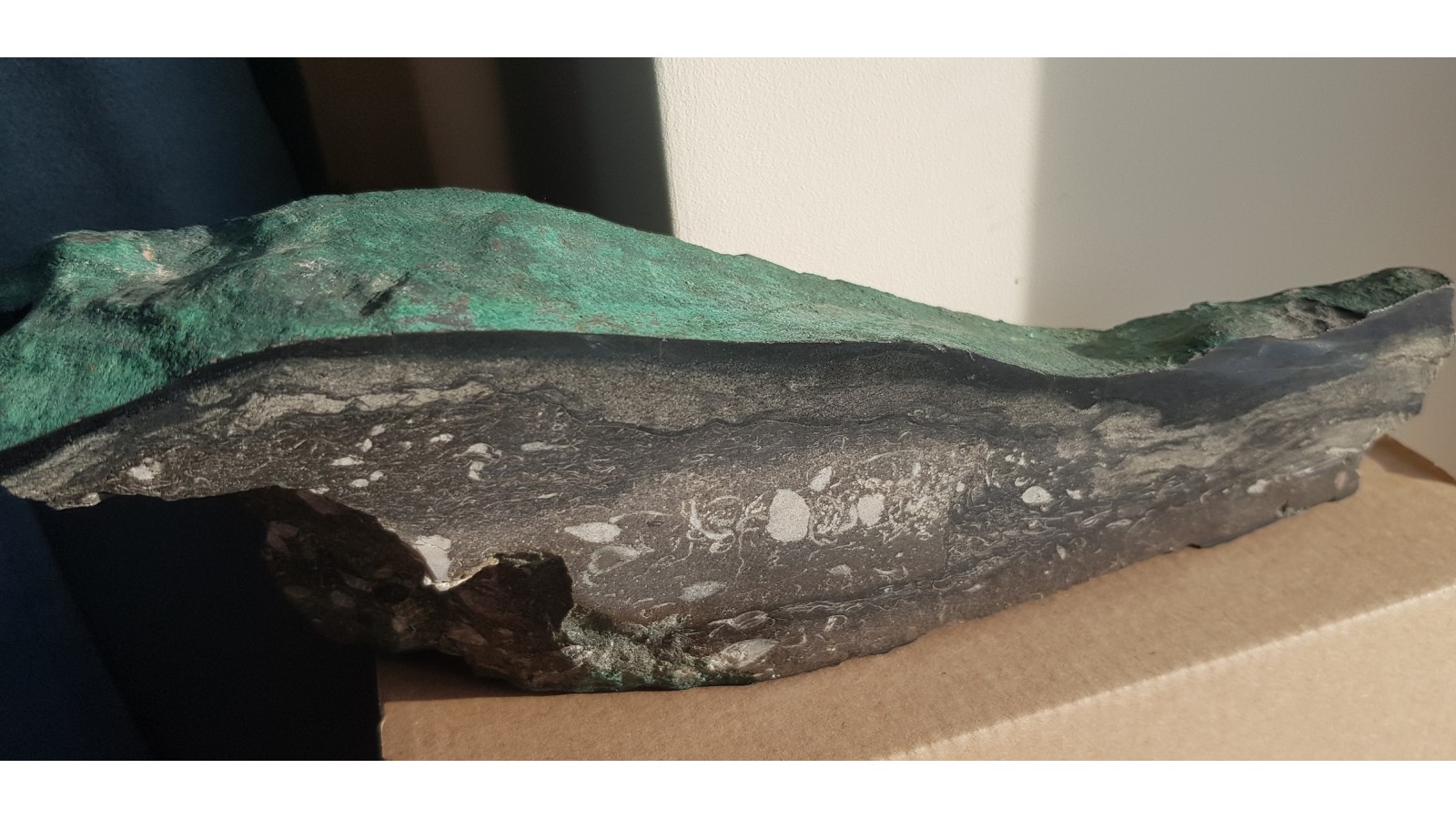 Wyjątkowy okaz z KGHM - duży, polerowany z jednej strony dolomit z przekrojami przez kalcytowe, skamieniale ramienionogi, grubą żyłę chalkozynu pokrytą malachitem. Zyła chalkozynu układa się po górnej powierzchni okazu. Bezpośrednio na niej malachit. Od strony przeciwnej ślady pomarańczowego celestynu. Wyjątkowy okaz obejmujący smieniałości i minerały KGHM. Bardzo efeektowny. Polecam.