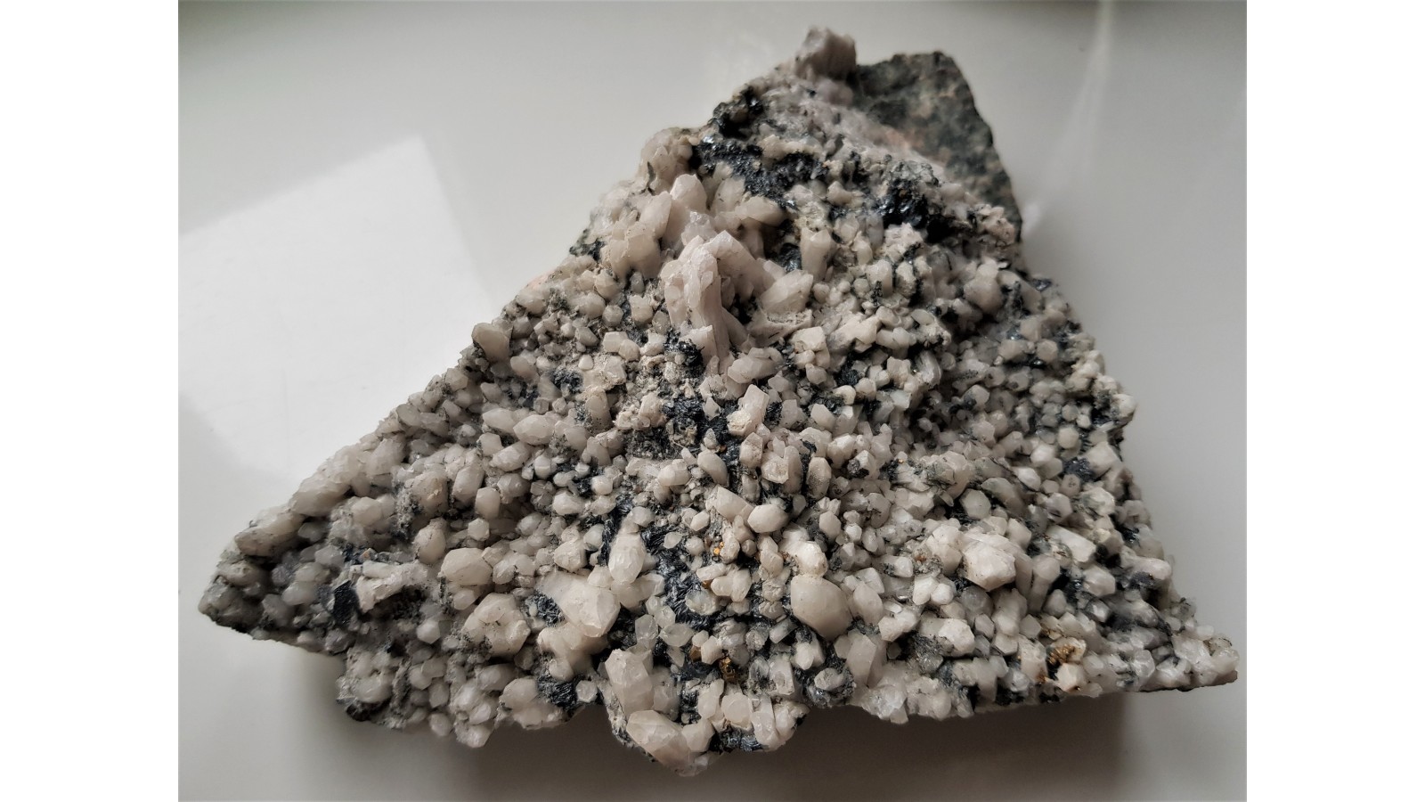 Szczotka prawidłowo wykształconych, niewielkich rozmiarów kwarców mlecznych z minerałami rudnymi (blaszki hematytu oraz kryształy pirytu na kwarcach oraz pomiędzy nimi) z Grabiny k. Strzegomia. Ciekawy okaz okruszcowanej żyły kwarcowej z granitów strzegomskich. Całość estetyczna, metaliczny połysk minerałów rudnych. Całkowicie naturalna, bez cięcia i uszkodzeń. Polecam.