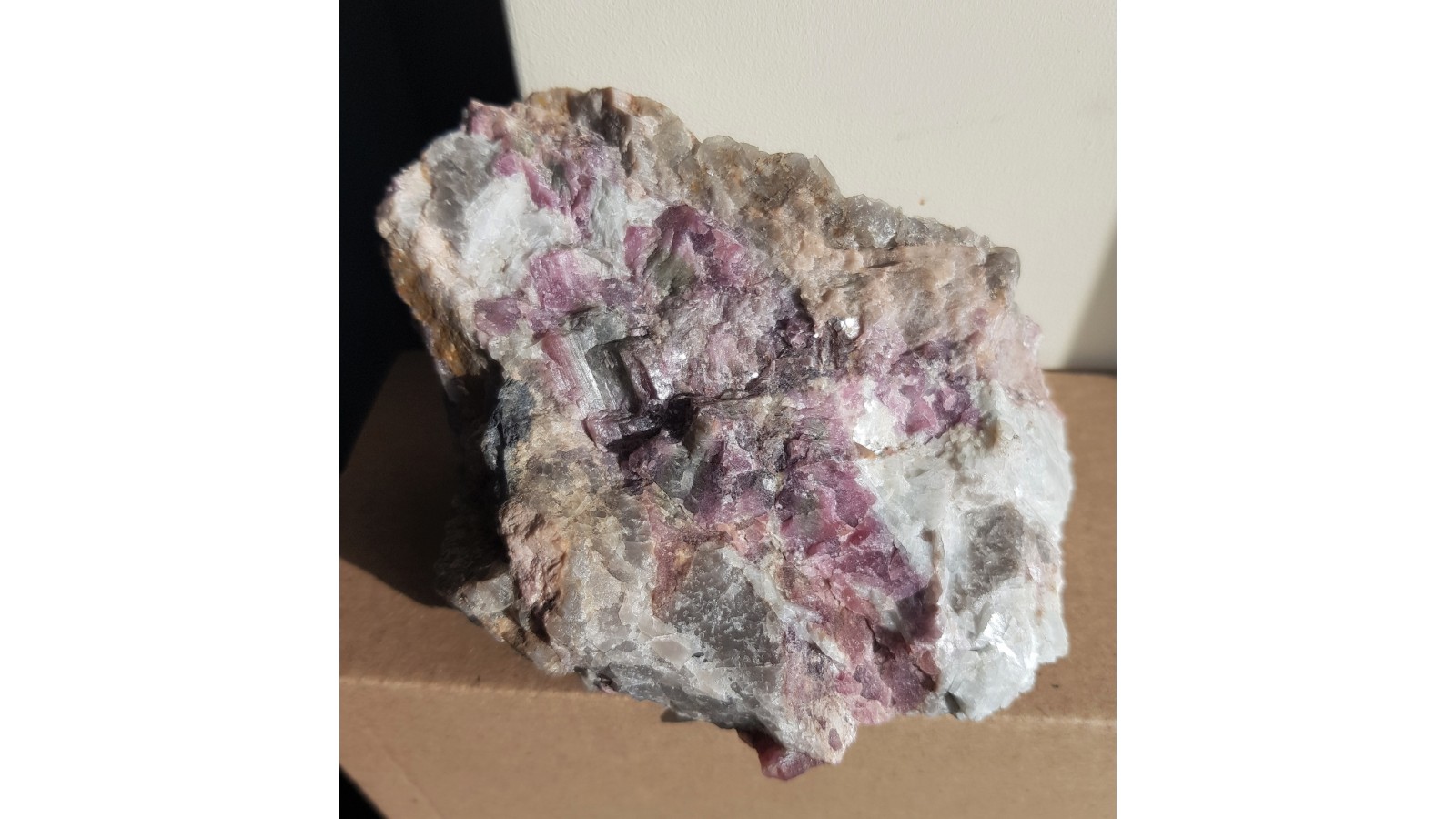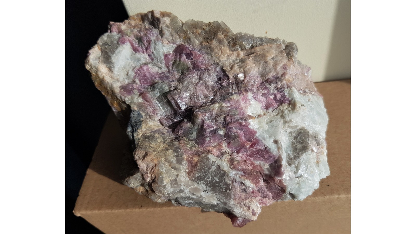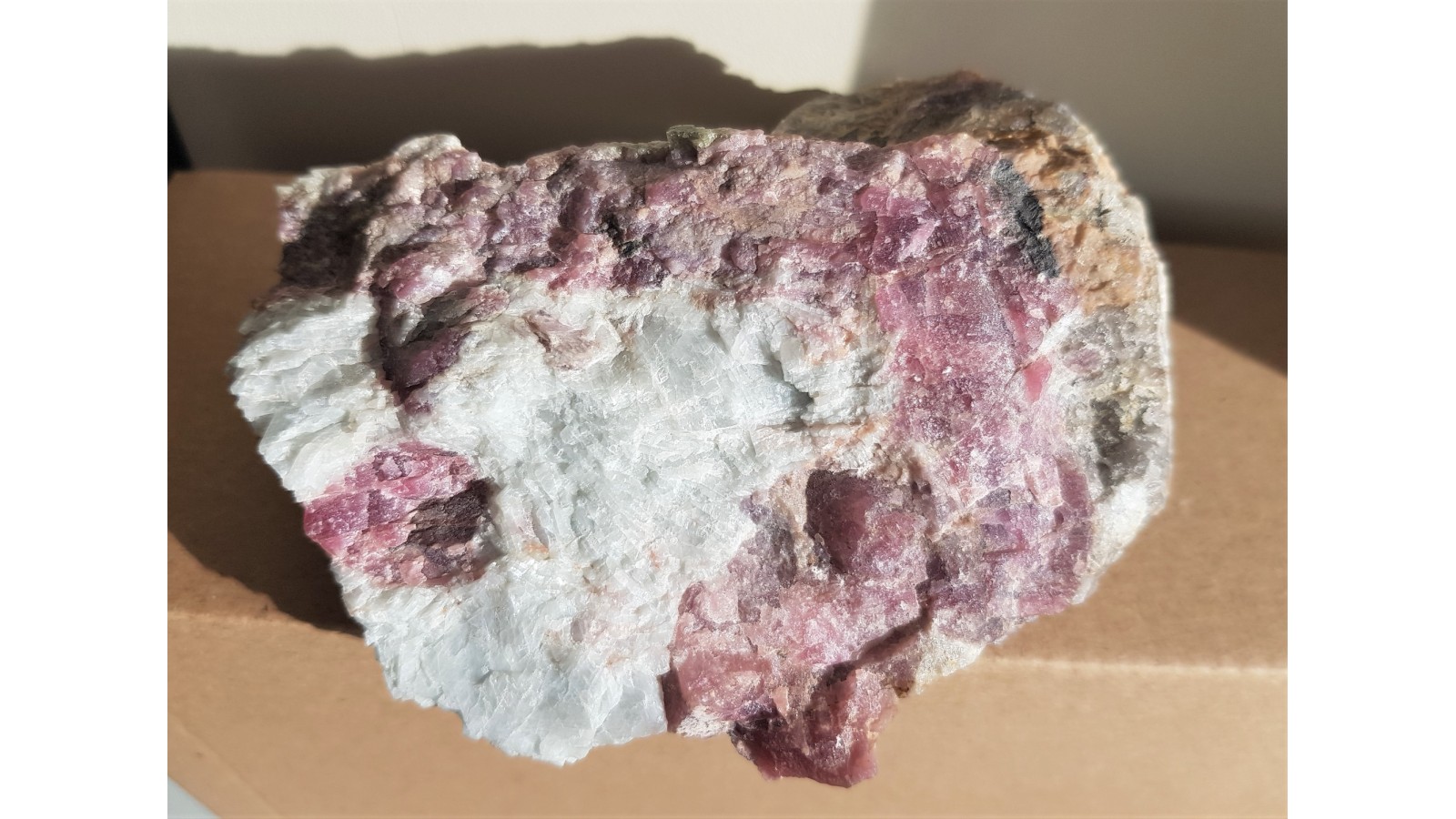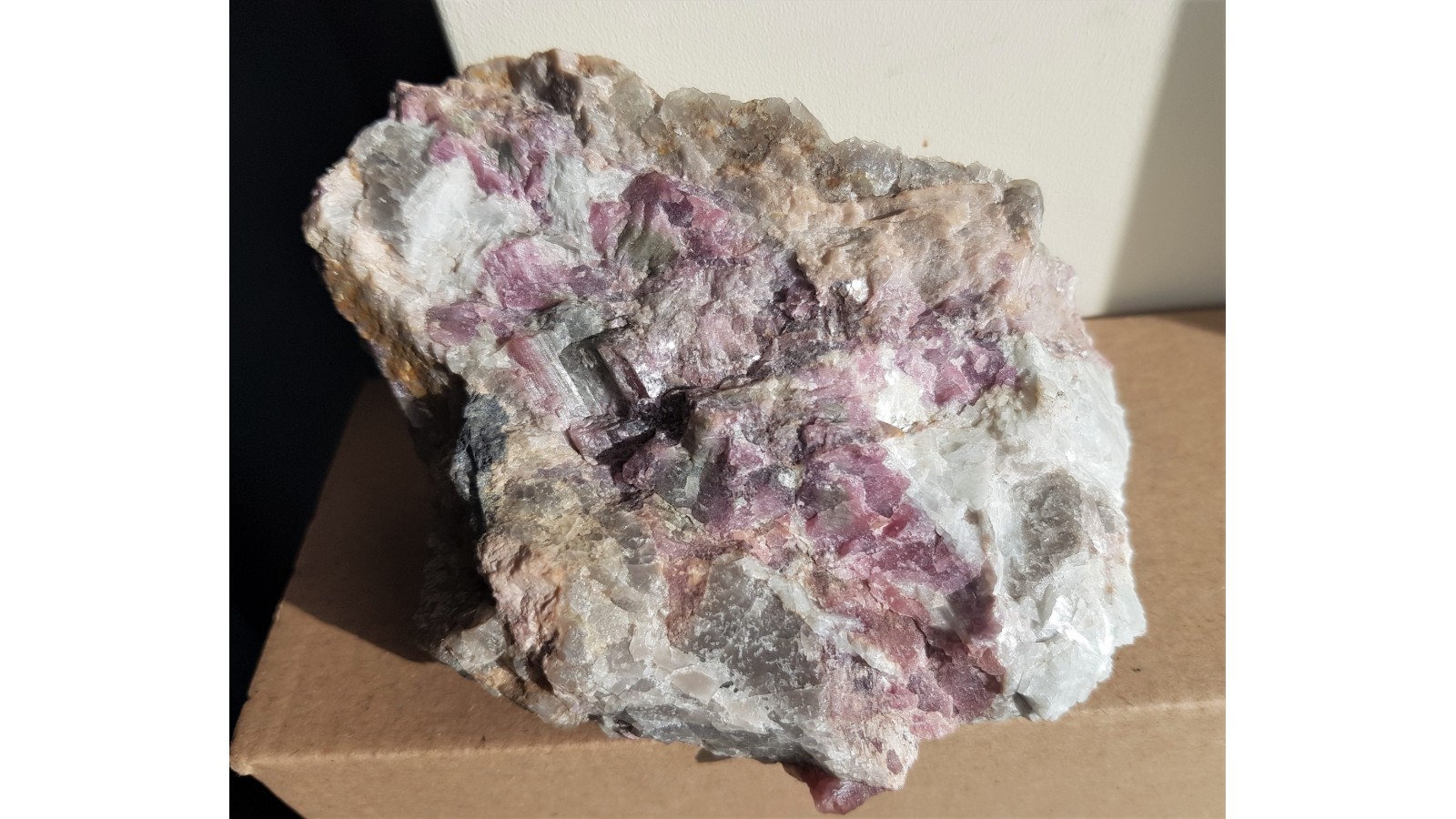 Pokaźny okaz pegmatytu obficie przerośnięty czerwonym turmalinem - elbaitem (turmalin litowy) z Piławy Górnej w Górach Sowich. Piękny, barwny okaz. W niektórych miejscach przekroje turmalinów z zielonym środkiem i czerwoną otoczką. Całość naturalna, nie cięta. Rzadkość mineralogiczna z dotychczas jedynego znanego w polskich Sudetach stanowiska turmalinów litowych. Estetyczna, okazała próbka. Polecam.
