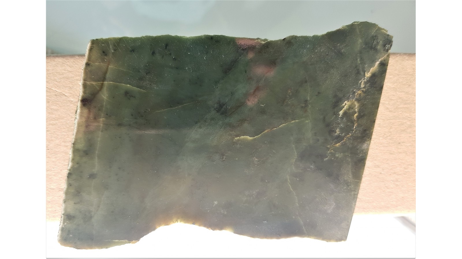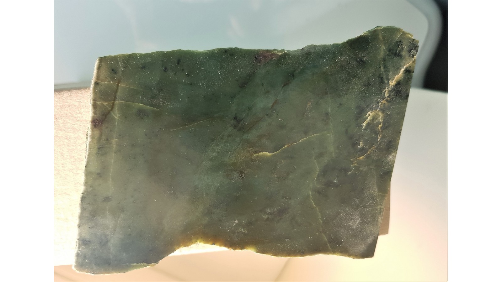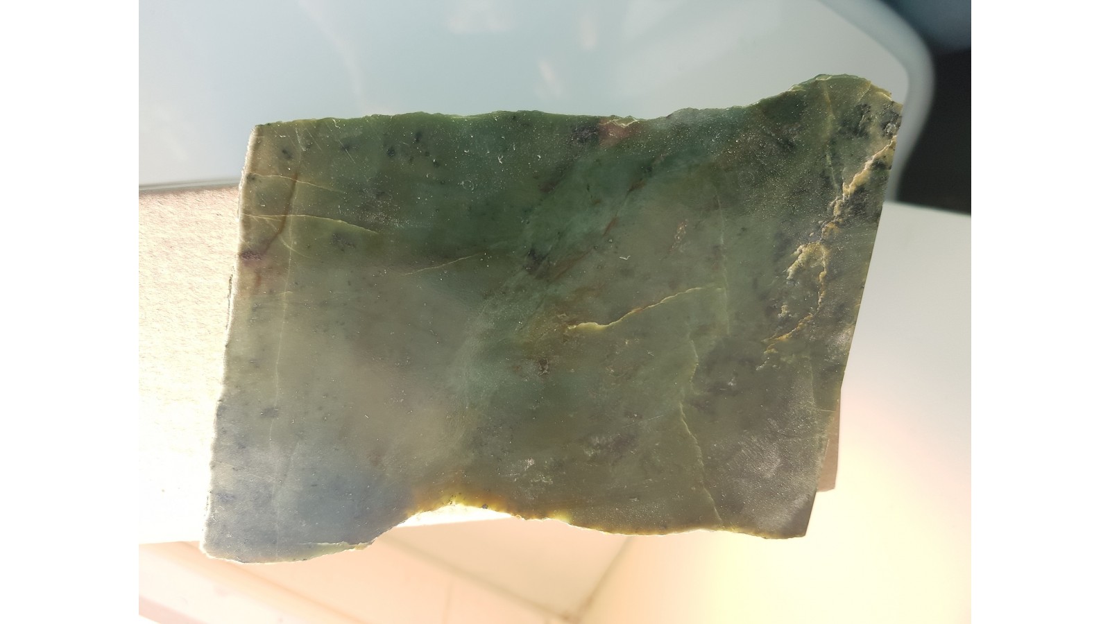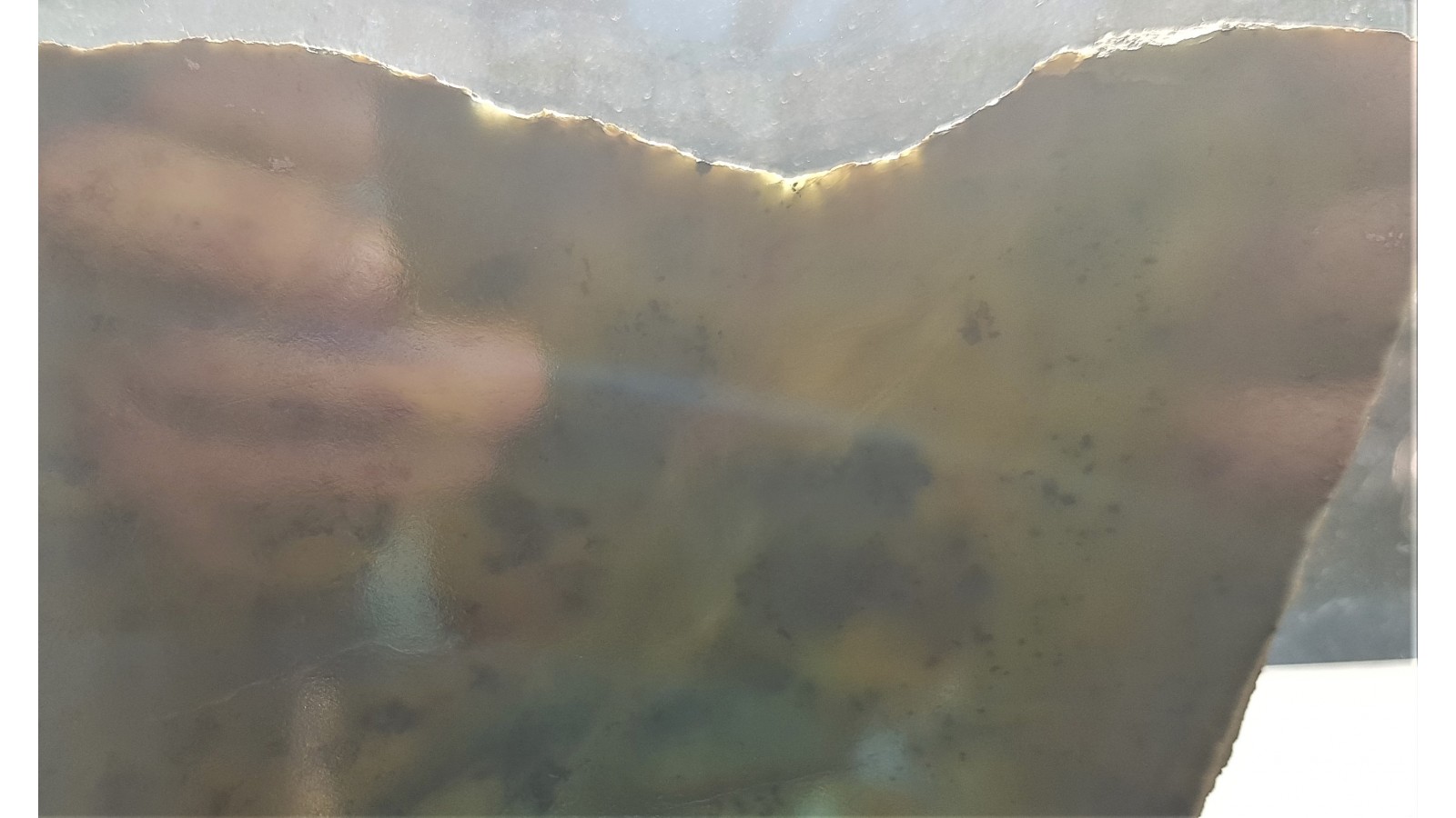 Przeświecająca płytka nefrytu z Jordanowa Śląskiego. Idealny poler, co jest trudne w przypadku tego surowca. Nefryt niespękany, przeświecający, w pięknych, subtelnych odcieniach zieleni. Płytka, strona przeciwna po cięciu. Polecam.