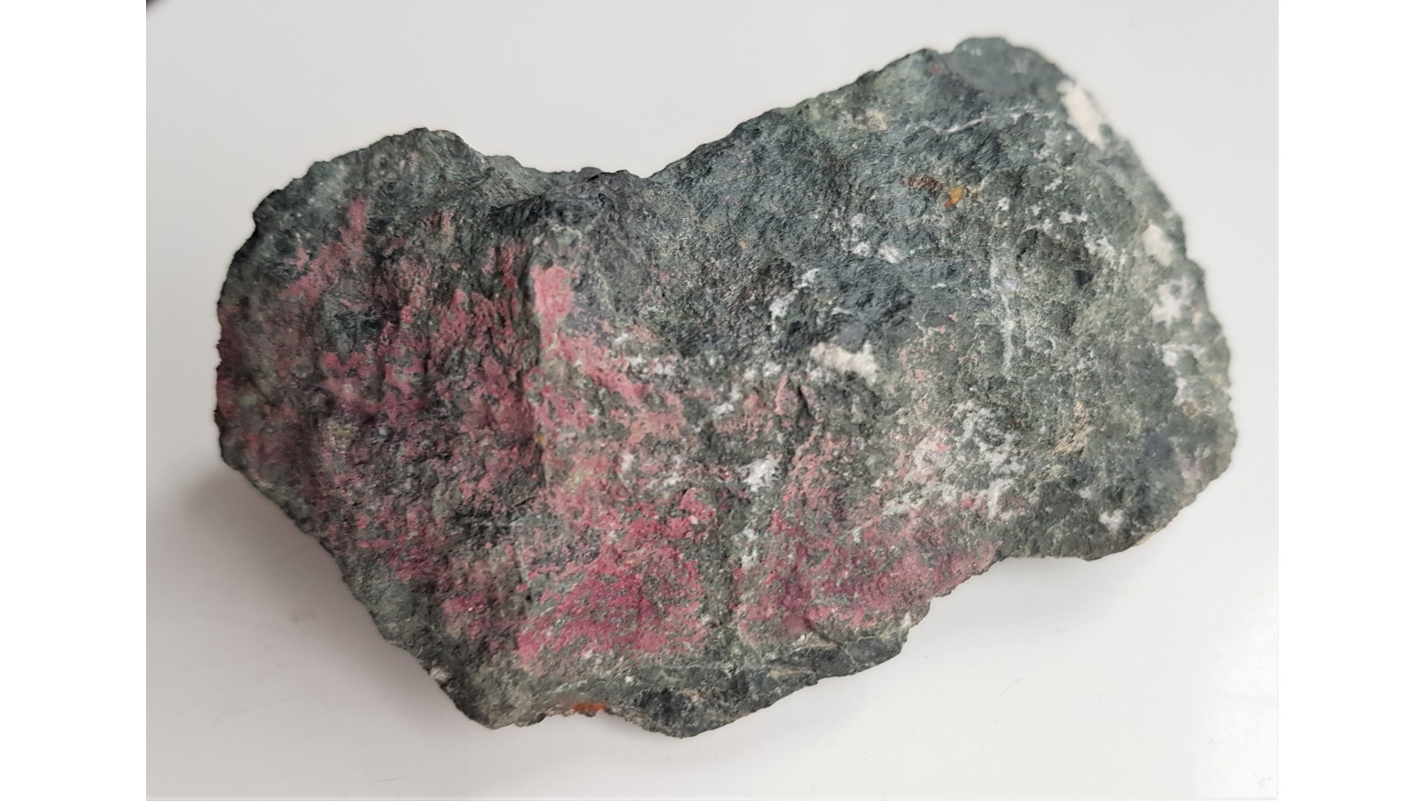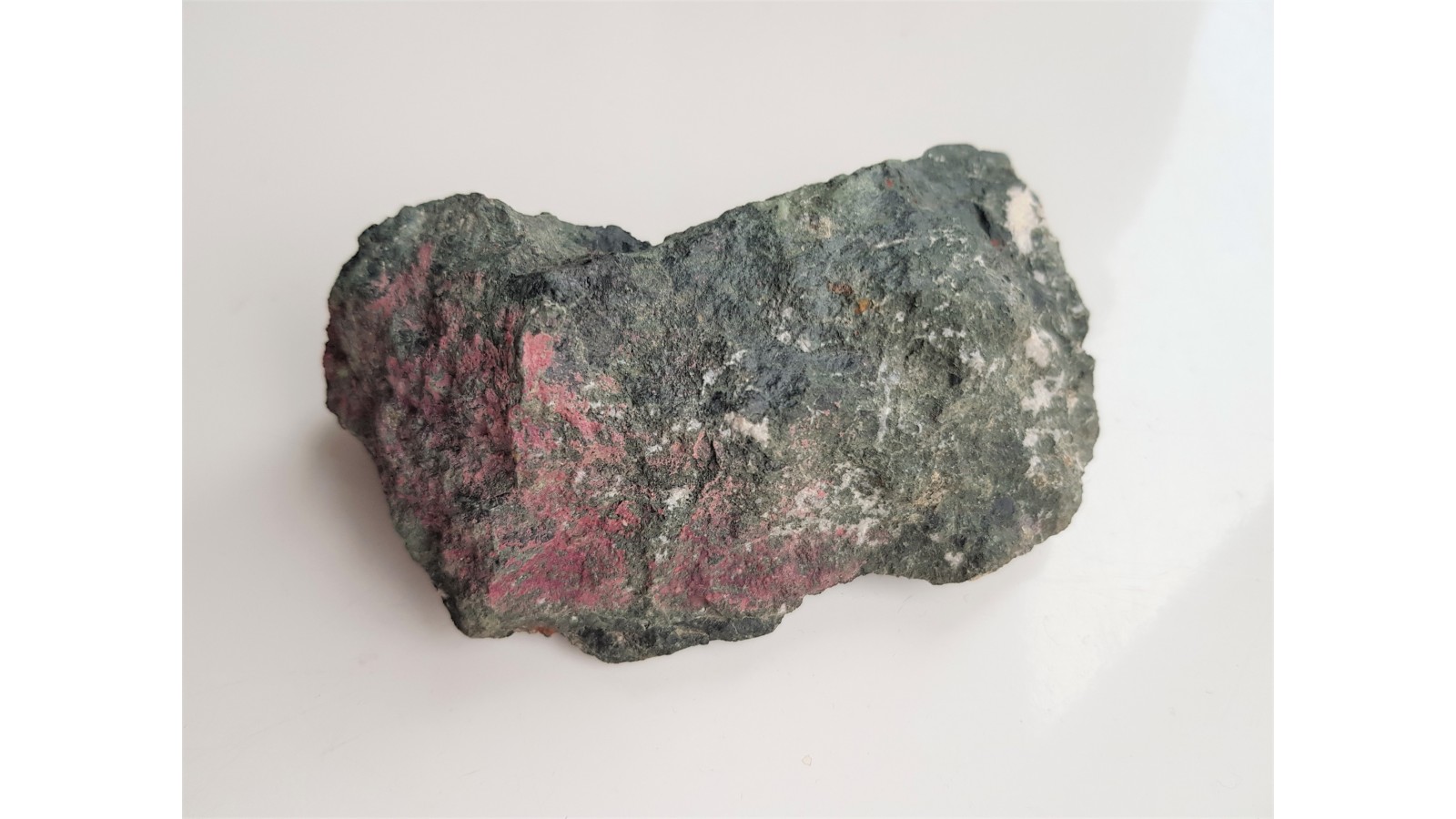 Okaz rzadkiego minerału wtórnego kobaltu - erytrynu oraz stowarzyszonego z nim kottigitu. Obfite powłoki erytrynu w postaci bardzo licznych, drobnych skupień igiełek erytrynu o wyrazistej barwie. Minerał na masywnym łupku amfibolowym, powstały z wietrzenia rozproszonych w skale pierwotnych minerałów rudnych kobaltu. Okaz z rejonu Miedzianki sudeckiej, z dawnych hałd pogórniczych. Rzadkość mineralogiczna w Sudetach. Polecam.