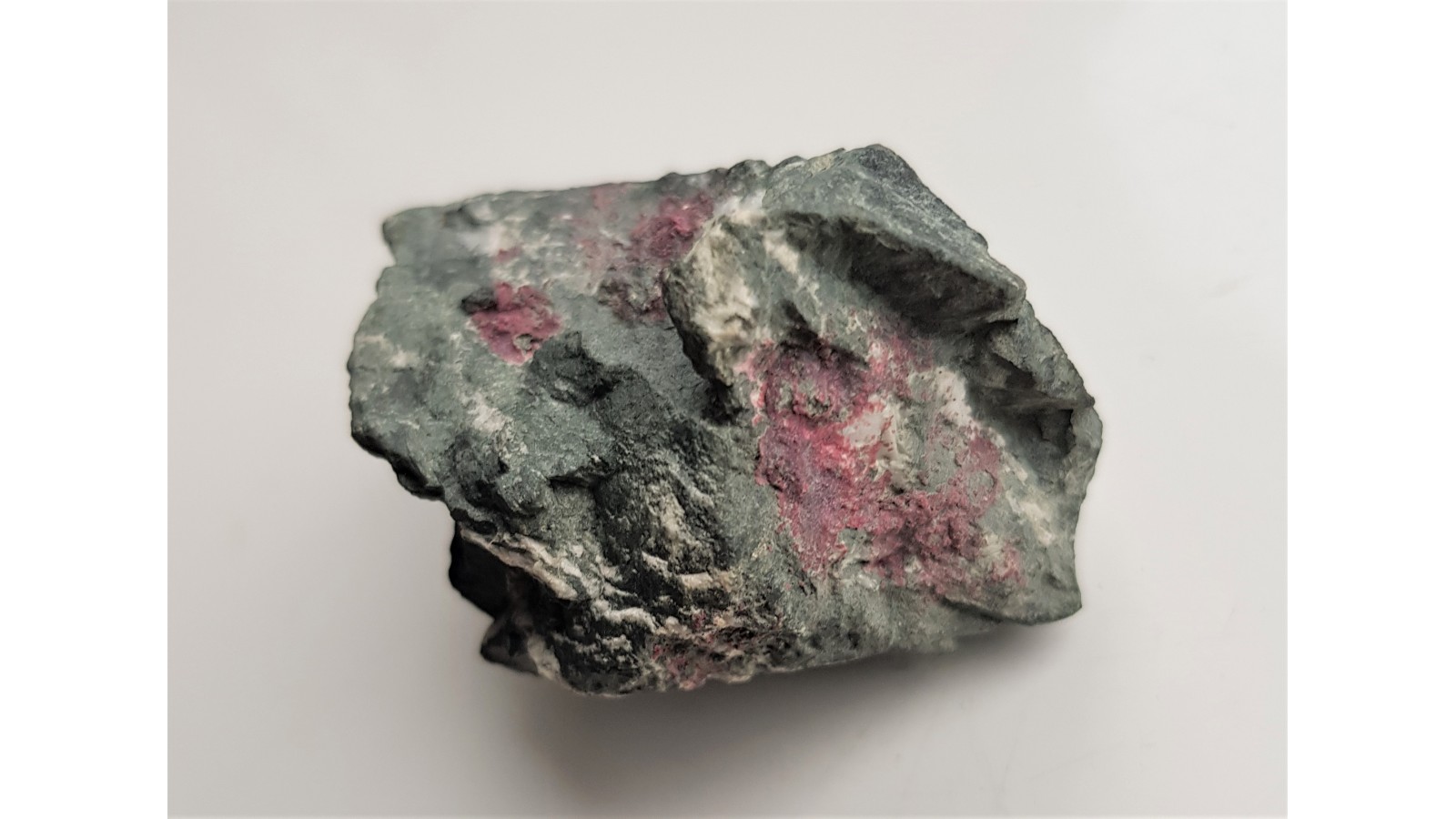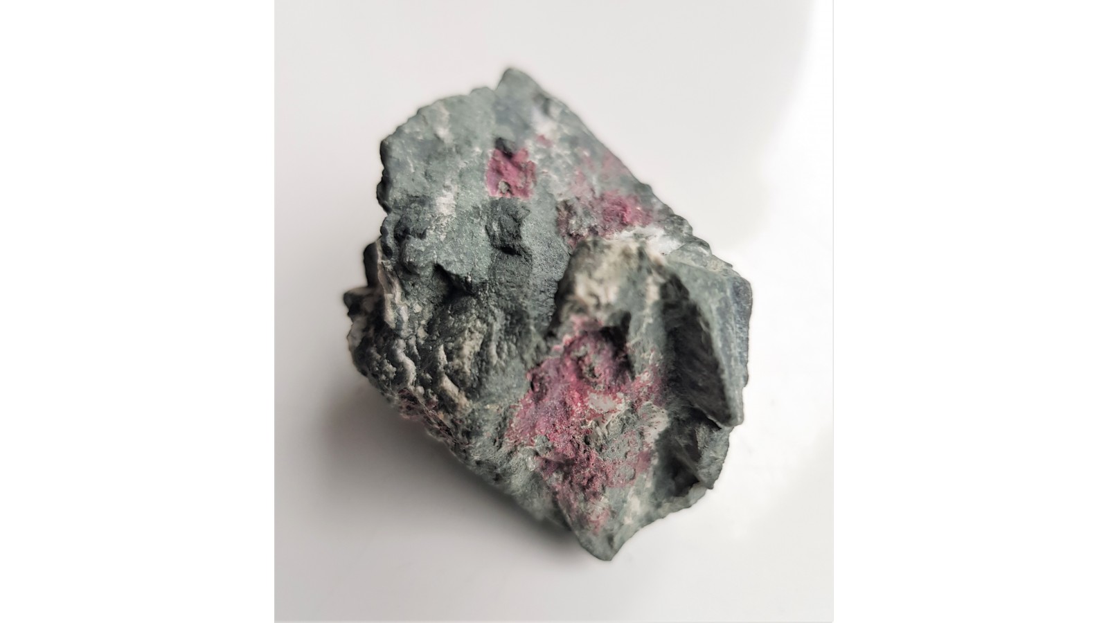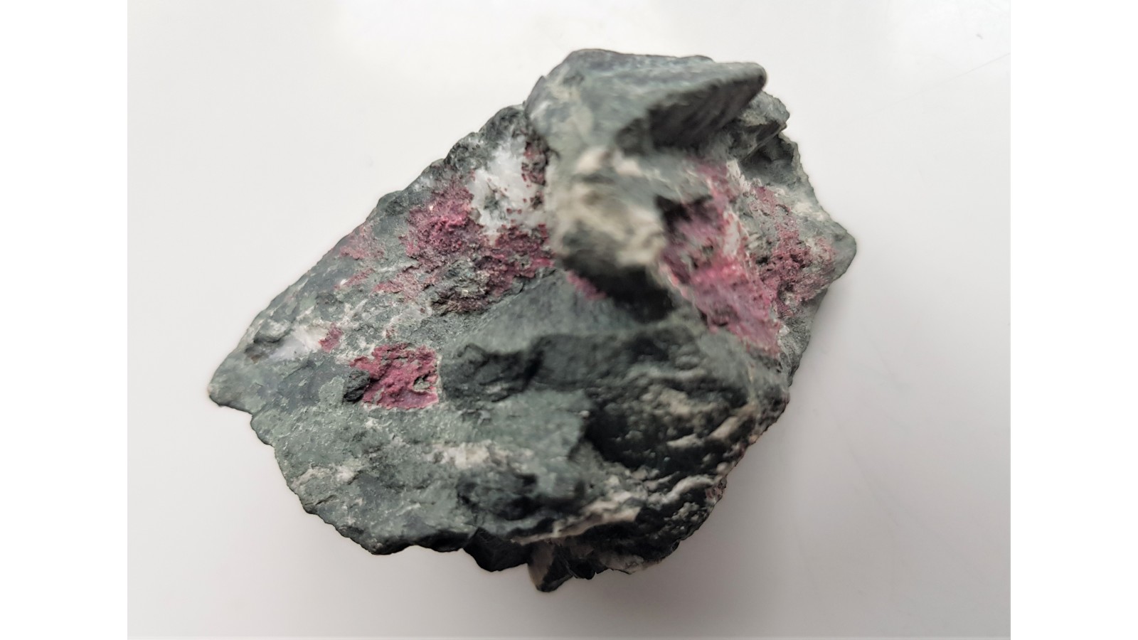 Okaz rzadkiego minerału wtórnego kobaltu - erytrynu oraz stowarzyszonego z nim kottigitu. Obfite powłoki erytrynu w postaci bardzo licznych, drobnych skupień igiełek erytrynu o wyrazistej barwie. Minerał na masywnym łupku amfibolowym, powstały z wietrzenia rozproszonych w skale pierwotnych minerałów rudnych kobaltu. Okaz z rejonu Miedzianki sudeckiej, z dawnych hałd pogórniczych. Rzadkość mineralogiczna w Sudetach. Polecam.