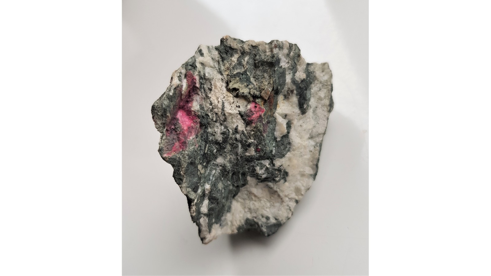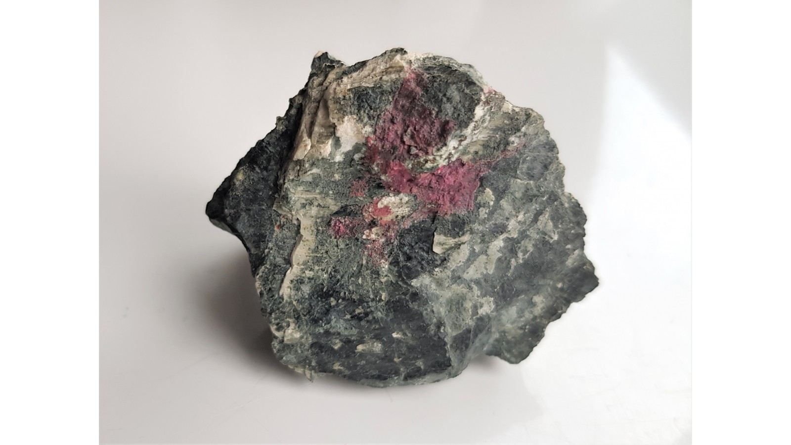 Okaz rzadkiego minerału wtórnego kobaltu - erytrynu oraz stowarzyszonego z nim kottigitu. Obfite powłoki erytrynu w postaci bardzo licznych, drobnych skupień igiełek erytrynu o wyrazistej barwie. Minerał na masywnym łupku amfibolowym, powstały z wietrzenia rozproszonych w skale pierwotnych minerałów rudnych kobaltu. Okaz z rejonu Miedzianki sudeckiej, z dawnych hałd pogórniczych. Rzadkość mineralogiczna w Sudetach. Polecam.