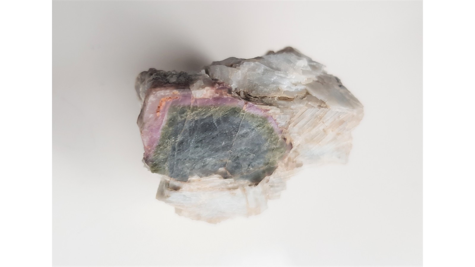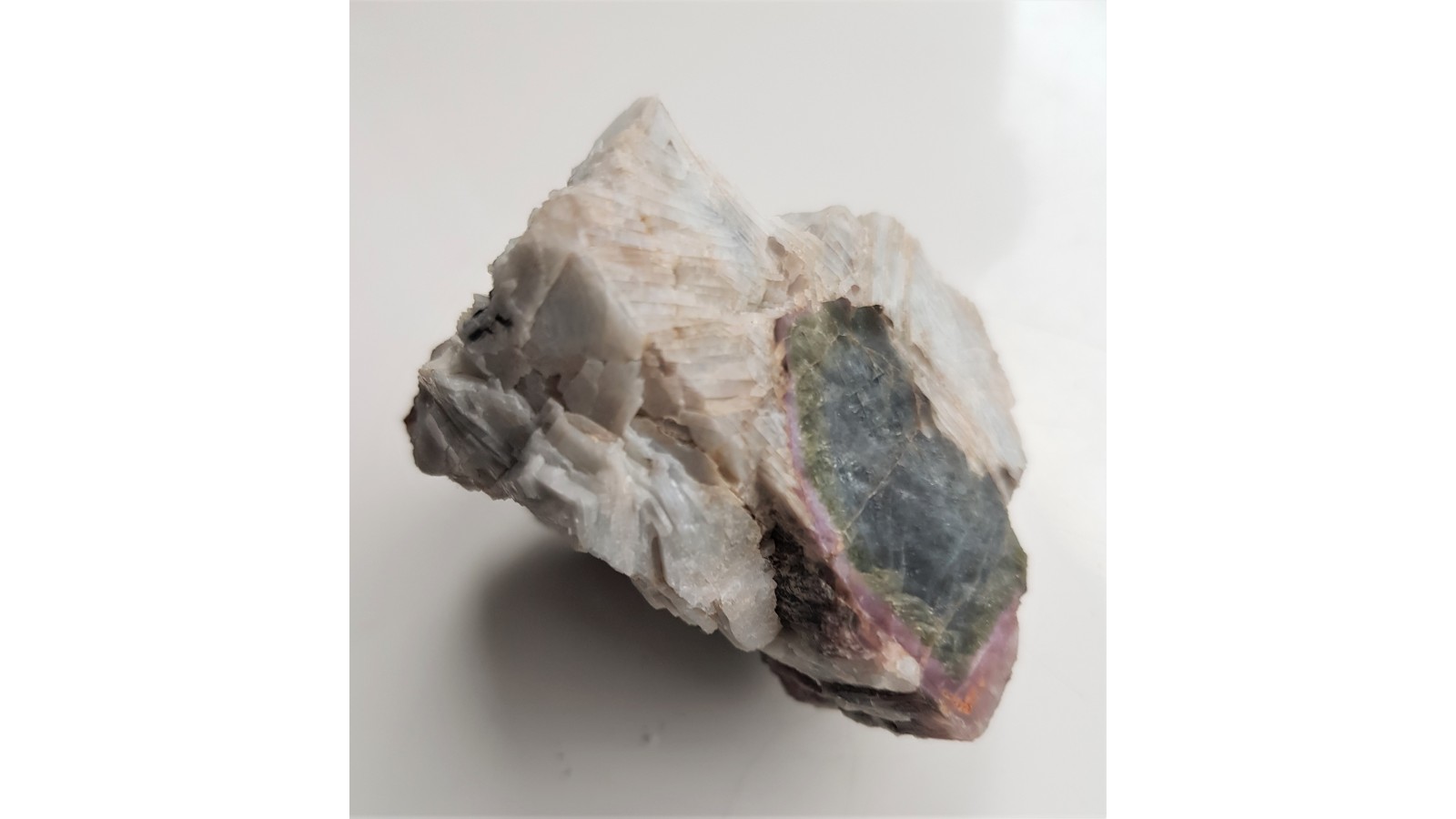 Bardzo estetyczny okaz barwnego elbaitu (turmalin litowy) z Piławy Górnej w Górach Sowich. Na przekroju widoczne jest strefowe zabarwienie - czerwone na zewnątrz i zielonoszare wewnątrz kryształu. Polerowany jednostronnie przekrój całego, nieuszkodzonego kryształu w pegmatycie. Widoczne ścianki kryształu. Całe i nieuszkodzone. Rzadkość mineralogiczna z dotychczas jedynego znanego w polskich Sudetach stanowiska turmalinów litowych. Polecam.