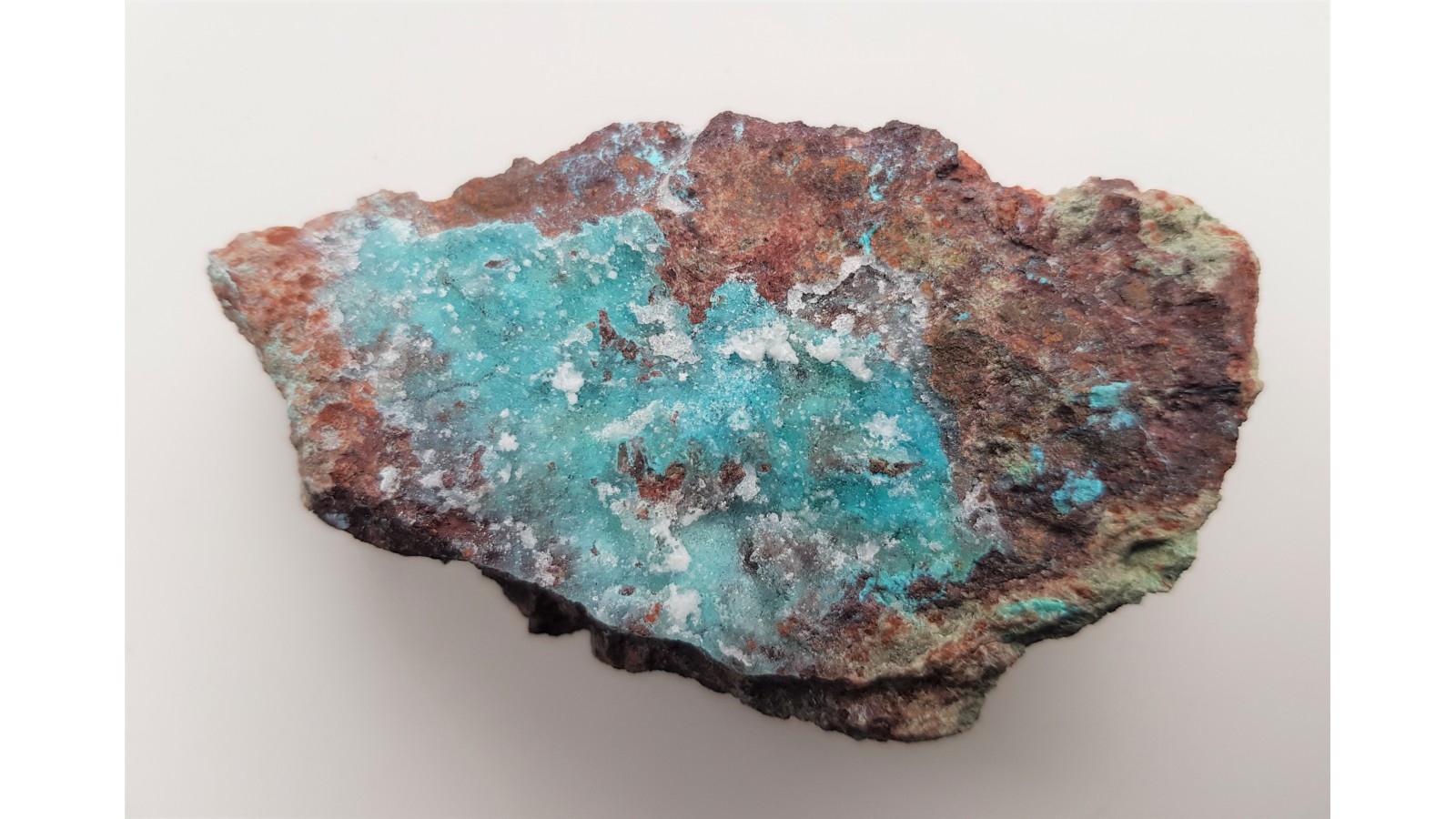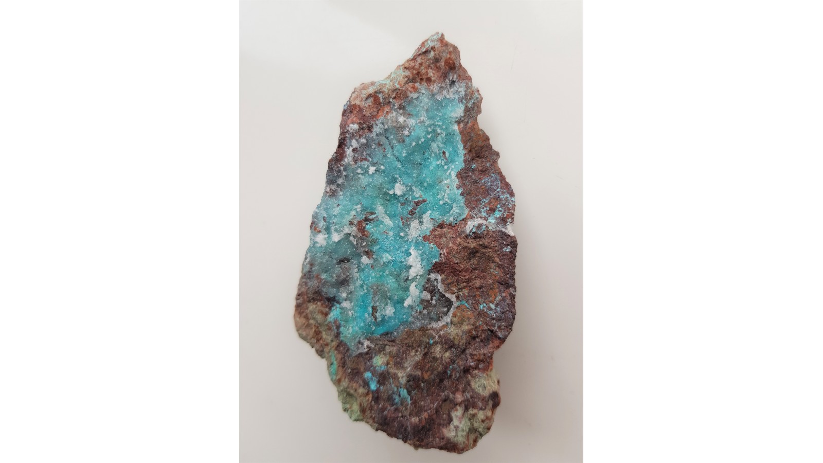 Intensywnie błękitna chryzokoloa pokryta skrzącym się kwarcem na fragmencie żyły rudnej z Rędzin k. Kamiennej Góry. Lokalizacja całkowicie niedostępna, wyekspoloatowana strefa oraz zakaz wstępu do kamieniołomu. Okaz bardzo estetyczny. Polecam.