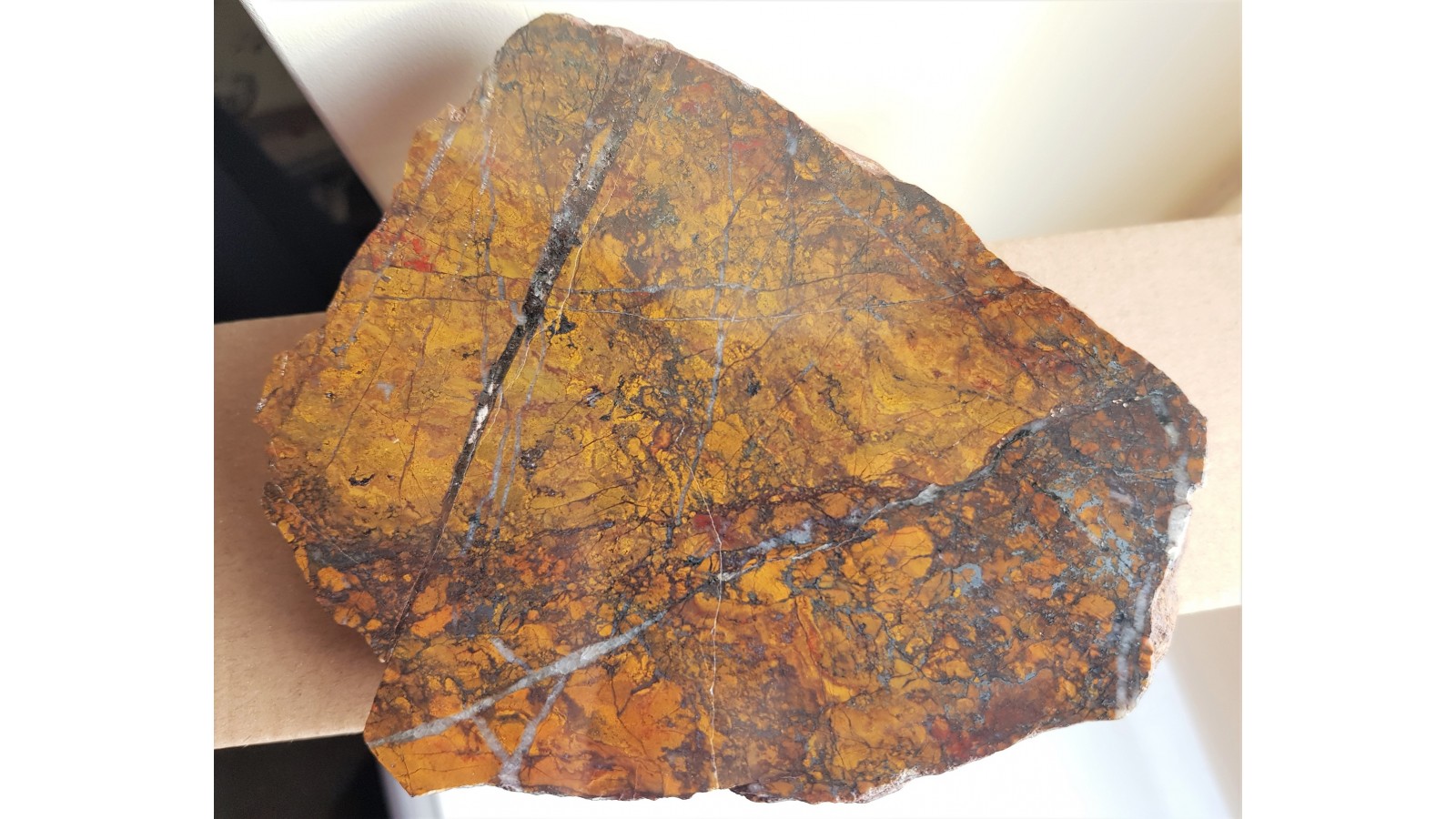 Piękny okaz intensywnie żółtego, ochrowego jaspisu z delikatnym deseniem, pochodzący ze zlepieńców kulmu niecki śródsudeckiej okolic Kamiennej Góry. Idealny poler, strona przeciwna naturalna, nie cięta. Wyrazisty kolor, spory, niespękany okaz. Polecam.