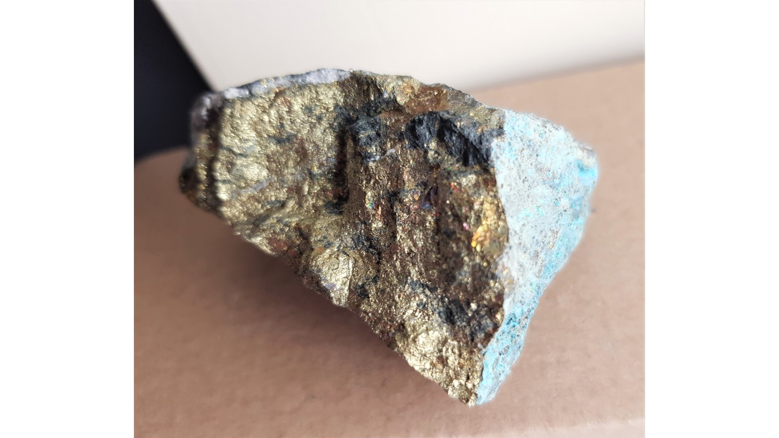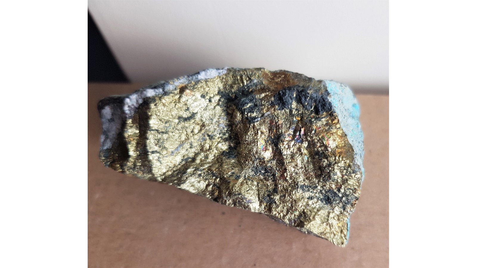 Okaz masywnego chalkopirytu pokrytego błękitną otoczką minerałów wietrzeniowych, głównie chryzokoli. Piękny kontrast złotej barwy z intensywnym błękitem. Okaz z Miedzianki k. Janowic Wlk. Okaz bez obróbki, bez cięcia. Piękna próbka, polecam.