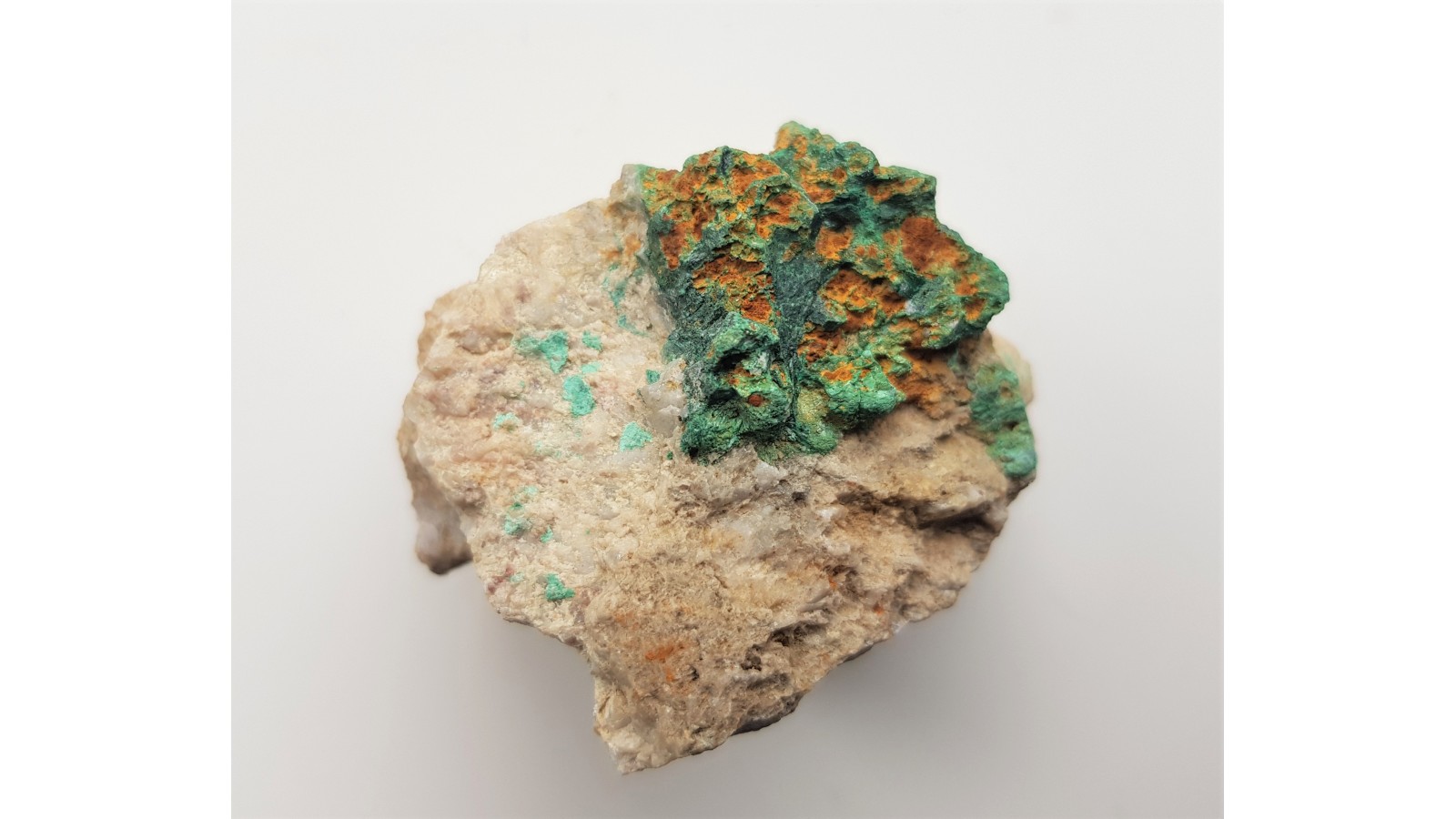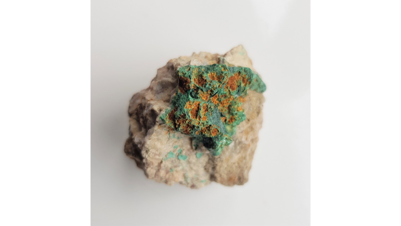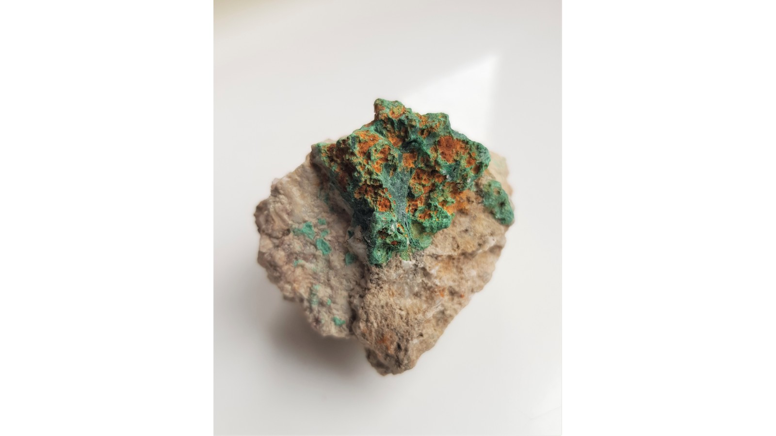Grube naskorupienia malachitu na skale żyłowej z kopalni Dorothea w Janowicach Wlk. (pole złożowe Miedzianki-Ciechanowic). Estetyczny okaz, bez obróbki, cięcia, w pełni naturalny. Lokalizacja wyeksploatowana. Rzadkość, polecam.