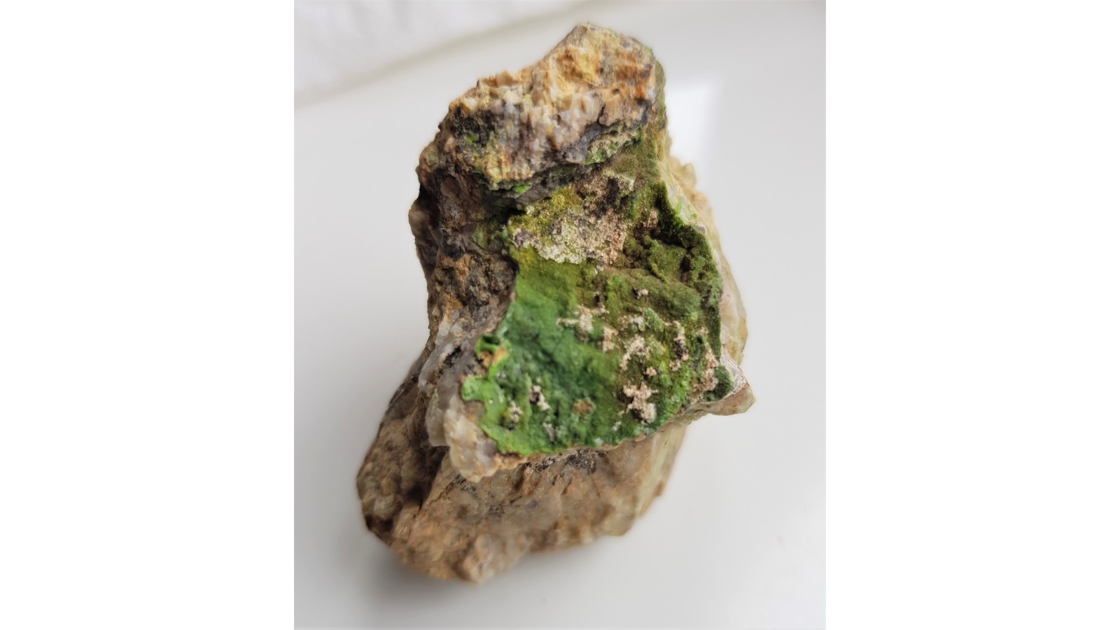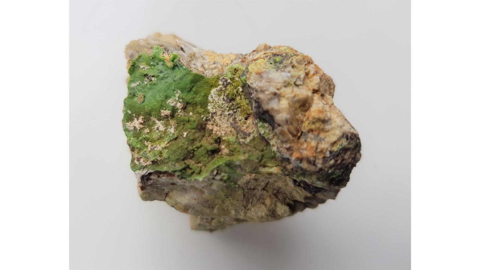 Okaz jaskrawo zabarwionego, krystalicznego piromorfitu z Janowic Wielkich (kop. Dorothea) w Sudetach. Piromorfit na skale żyłowej. Widoczne niewielkie kryształy piromorfitu skrzące się w świetle. Bardzo dobry połysk ścian krysztłów. Piękny, kolekcjonerski okaz. Polecam.