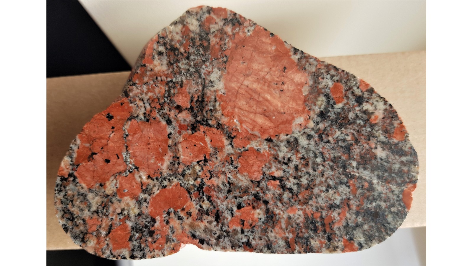 Granit porfirowaty z prakryształami intensywnie czerwonych, dużych skaleni. Prawdopodobnie z Wysp Alandzkich, gdyż dla tej lokalizacji charakterystyczne są intensywnie czerowne barwy różnych odmian granitoidów. Eratyk, Kołobrzeg. Idealny poler, strona przeciwna naturalna - otoczak. Duży i masywny, niespękany okaz bez śladów nadwietrzenia. Polecam.
