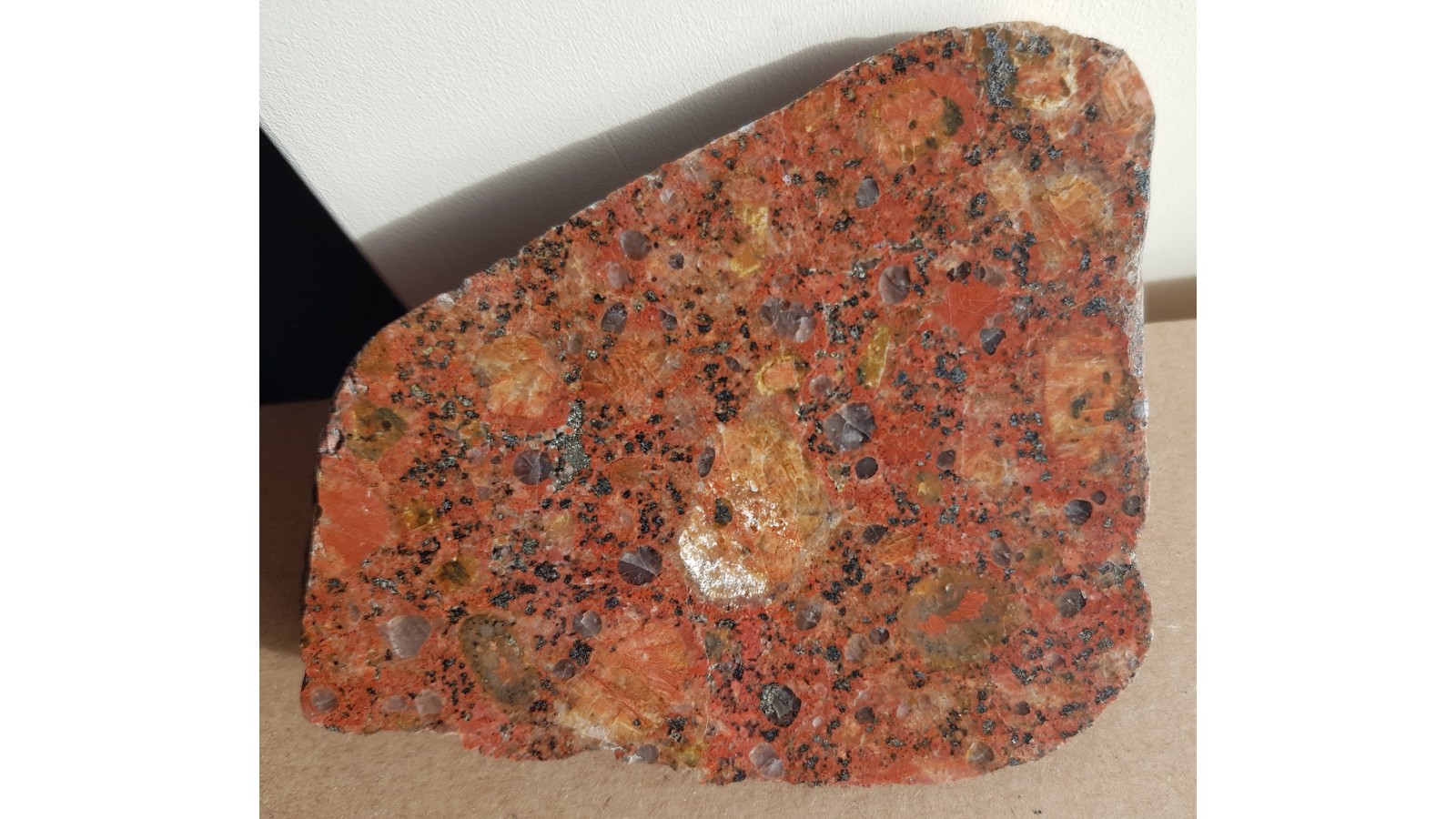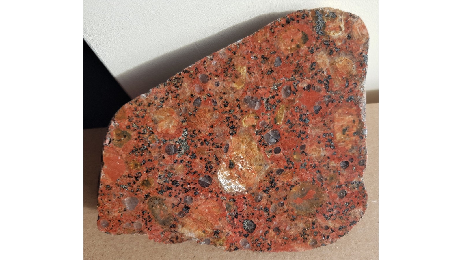 Granit typu rapakiwi ze skaleniami wykazującymi efekt iryzacji, schillerescencji. Także obwódki na skaleniach, budowa zonalna. Prawdopodobnie z Wysp Alandzkich, na których występują tak czerowne granity ja i granity rapakiwi. Eratyk, Kołobrzeg. Idealny poler, strona przeciwna naturalna - otoczak. Duży i masywny, niespękany okaz bez śladów nadwietrzenia. Polecam.