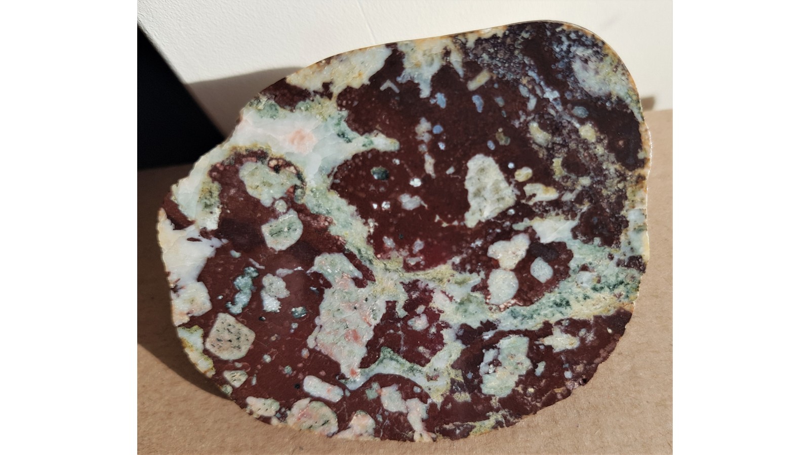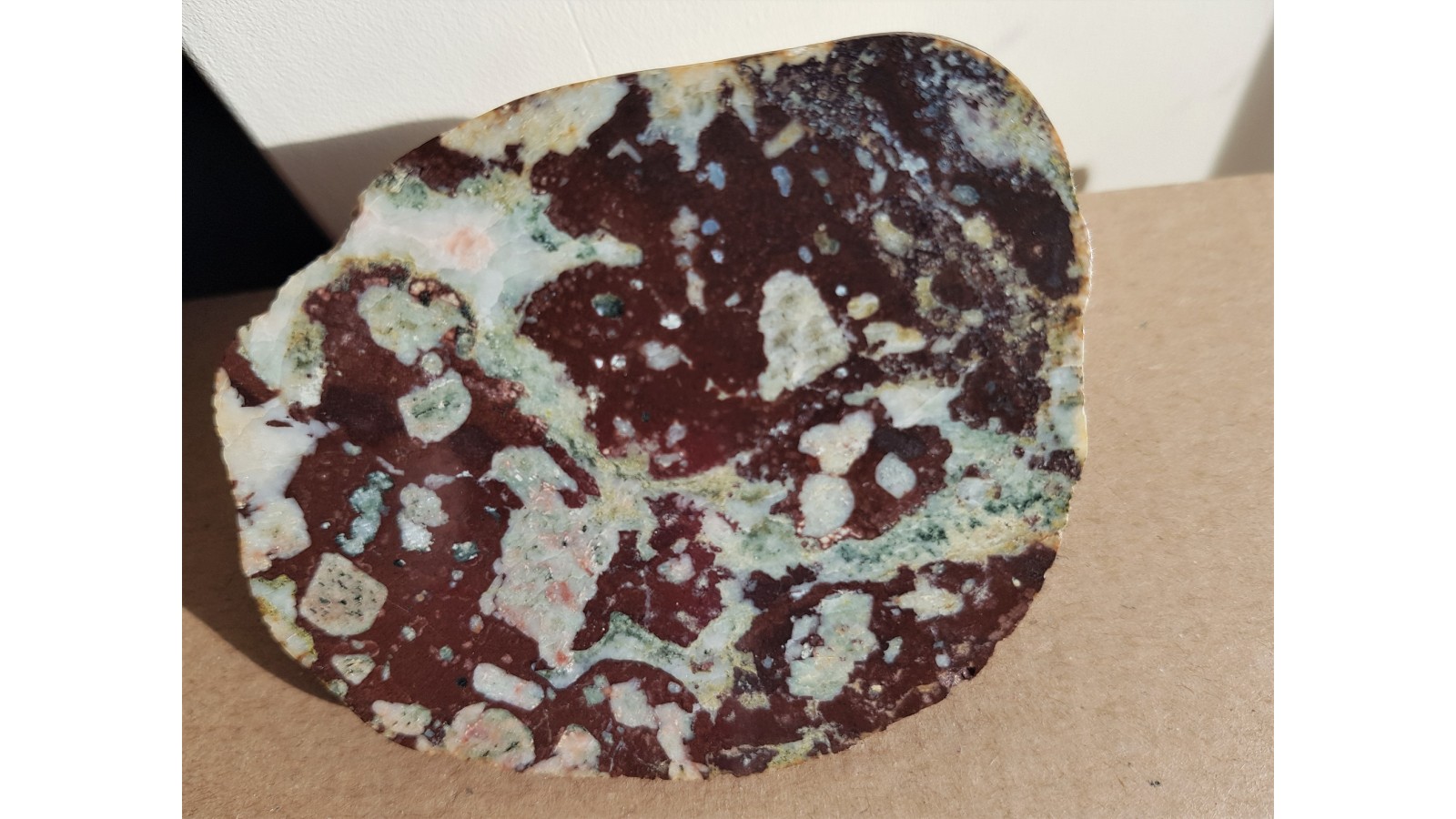Migdałowiec z obszaru bałtyckiego. Jasne strefy to zarówno prakryształy skaleni jak i zapełnione pustki pogazowe. W pustkach pogazowych obok kwarcu i kalcytu także zielone chloryty, chlorophaeit. Wiek migdałowców z obszaru bałtyckiego oceniany jest na 1,6 mld lat. Bardzo ozdobna skała. Eratyk, Kołobrzeg. Idealny poler, strona przeciwna naturalna - otoczak. Masywny, niespękany okaz bez śladów nadwietrzenia. Polecam.