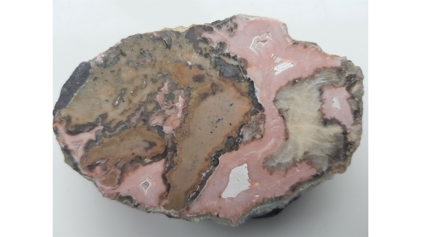 Różowobiały agat z Lubiechowej ze strefami kalcytowymi oraz fragmentami skały. Okaz polerowany, strona przeciwna naturalna, nie cięta. Dosyć duży, estetyczny okaz bez istotnych wad i spękań. Polecam.