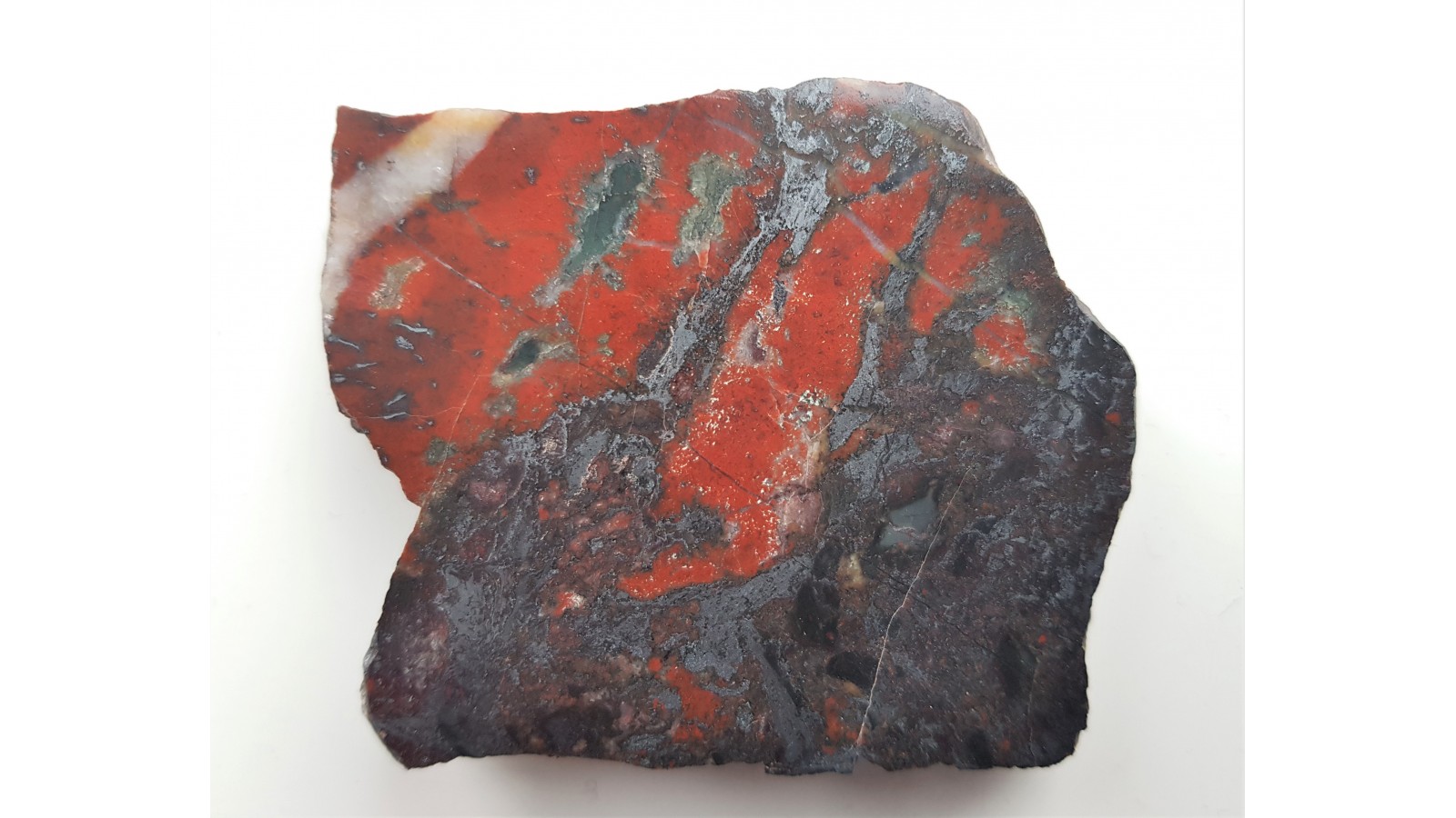 Okaz jaspisu barwy krwistoczerwonej, żywoczerwonej jako wydzielenia w jego ciemniejszej, brunatnej odmianie z obfitym hematytem widocznym na zgładzie. Okaz ze zlepieńców kulmu niecki śródsudeckiej okolic Starych Bogaczowic. Idealny poler, strona przeciwna naturalna, nie cięta. Okaz kontrastowy, niespękany. Polecam.