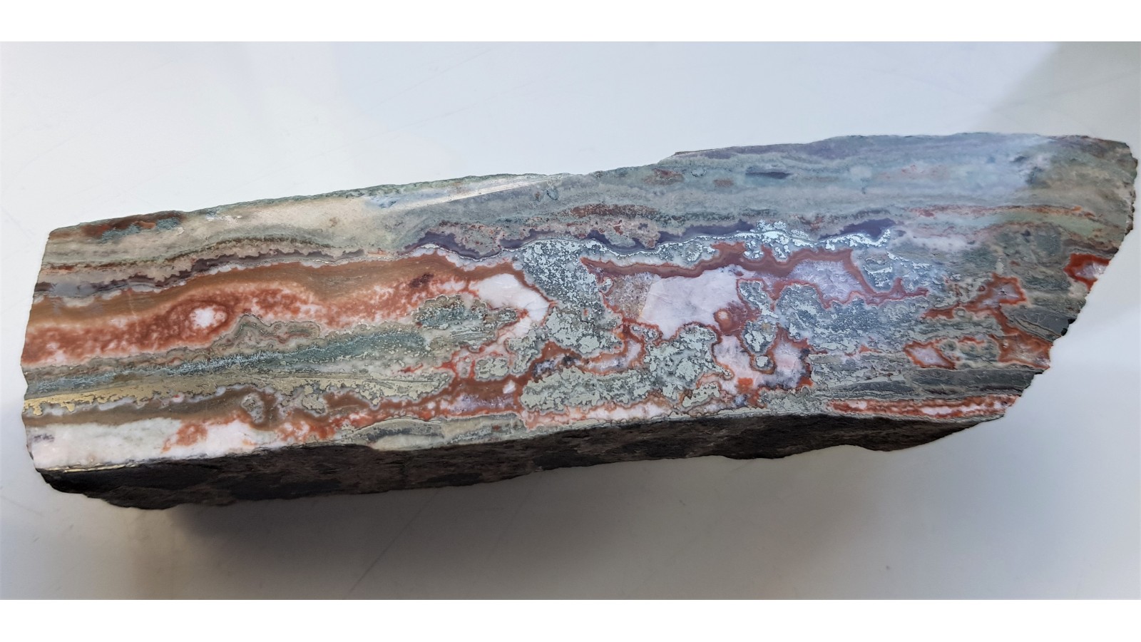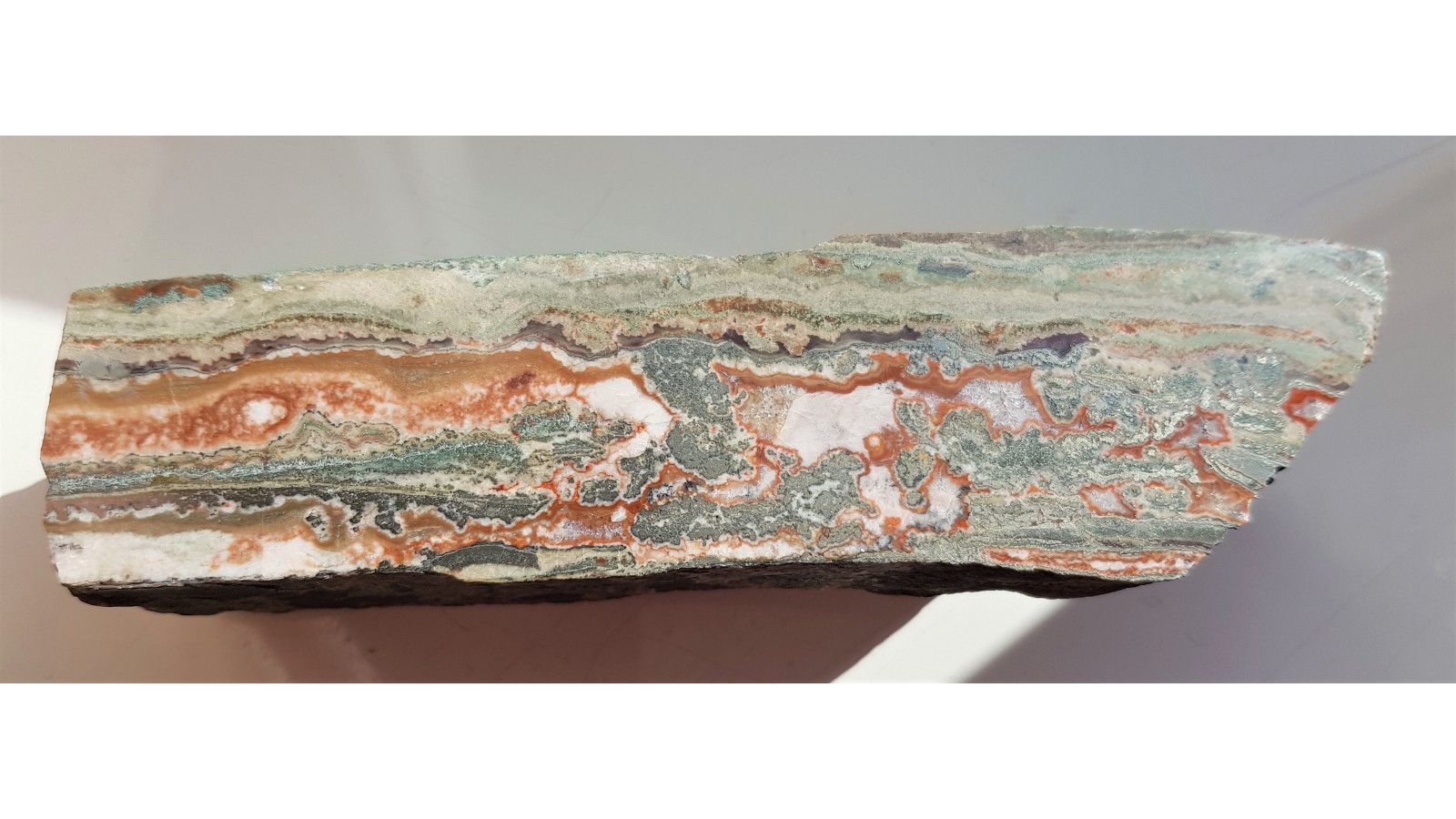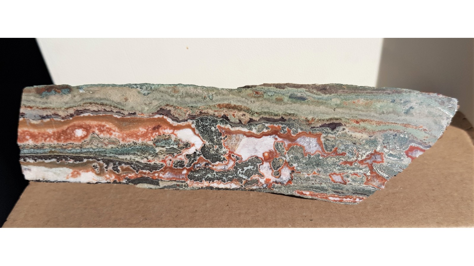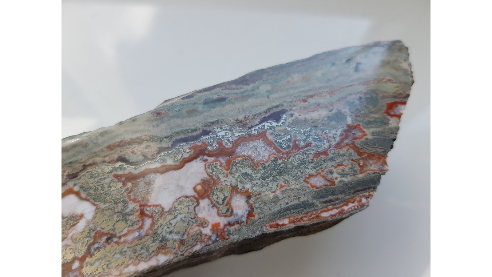 Niezwykły agat żyłowy z Borówna obficie impregnowany pirytem. Okaz polerowany jednostronnie, strona przeciwna naturalna. Cały przekrój żyły. Piryt w postaci dendrytowych impregnacji, doskonale widocznych na zgładzie. Agaty z tak czytelnymi impregnacjami kruszców należą do rzadkich okazów. Polecam.