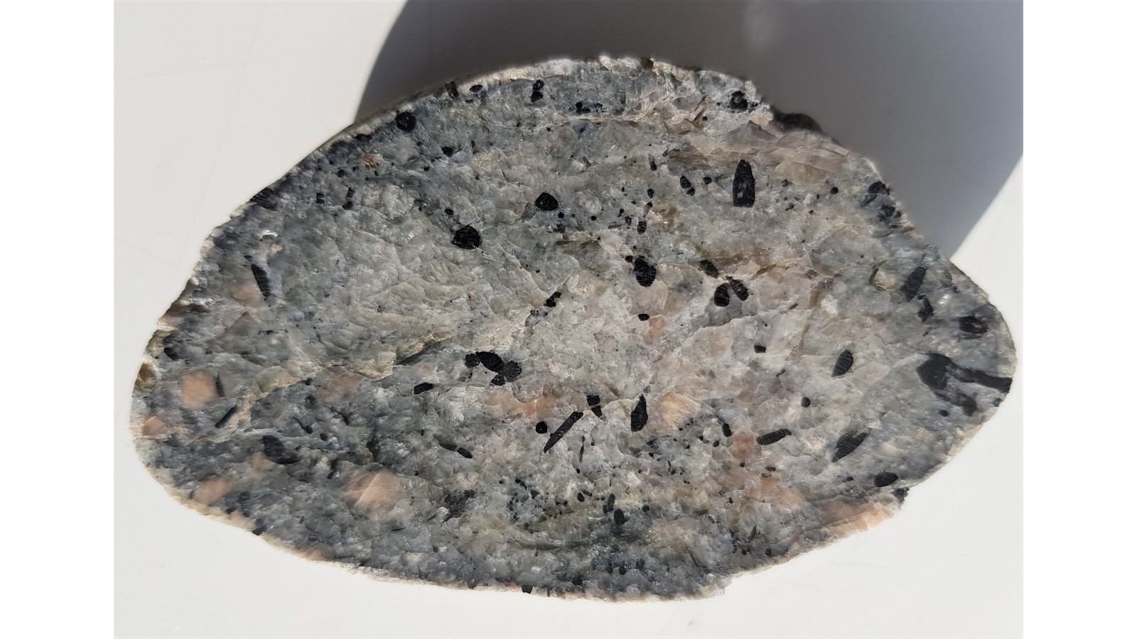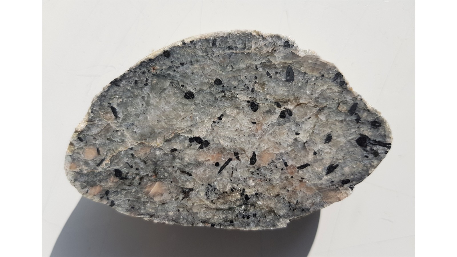 Polerowany okaz skały kwarcowo-łyszczykowej z igiełkowo wykształconymi kryształami brązowych turmalinów. Skała przypomina w większym stopniu grejzen niż pegmatyt. Wykazuje lekko kierunkową teksturę podkreśloną układem jasnych, zielonawych łyszczyków. Skała ozdobna. Idealny poler. Eratyk z Dźwirzyna. Polecam.