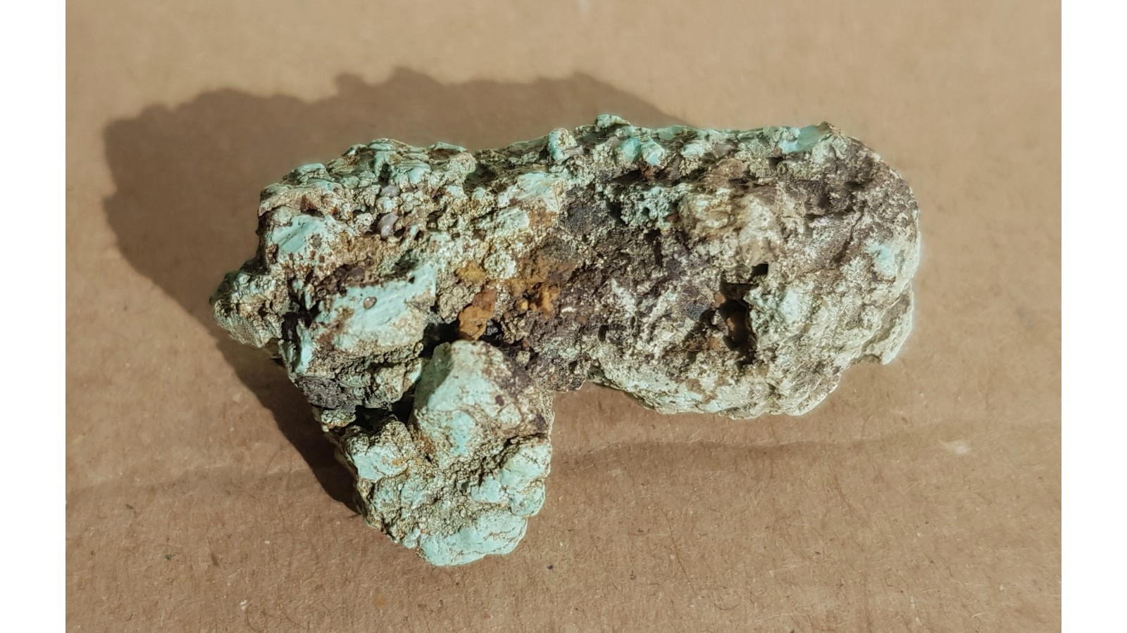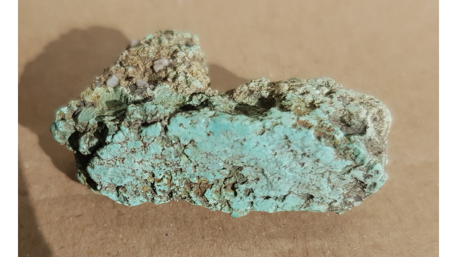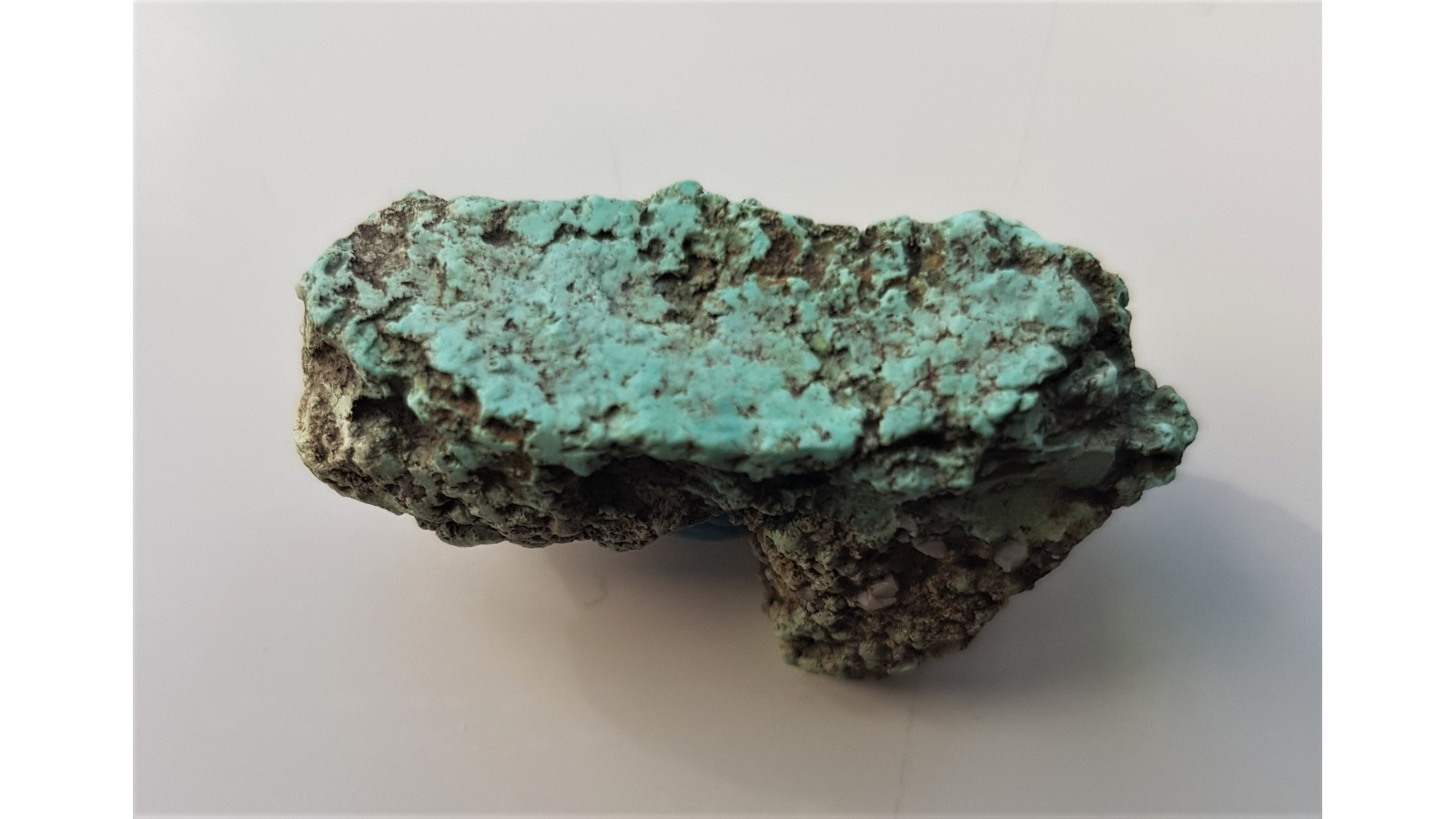Okaz bardzo ładnie zabarwionego turkusu z wystąpienia łupków krzemionkowych na Wzgórzu Lisiec k. Strzegomia. Jest to niewielka konkrecja (bądź sekrecja) o naturalnych kształtach, bez obróbki. Niewieki okaz, lecz z doskonałą barwą i bardzo charakterystycznym dla turkusu groniastym wykształceniem skupienia. Rzadkość w kolekcjach minerałów sudeckich, polecam.