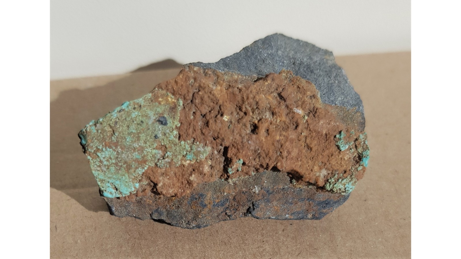 Okaz bardzo ładnie zabarwionego turkusu z wystąpienia łupków krzemionkowych na Wzgórzu Lisiec k. Strzegomia. Jest to wypełnienie żyły w łupkach krzemionkowych wśród żelazistej substancji mineralnej. Całość zwarta, masywna, niespękana. Niewieki okaz, lecz z doskonałą barwą, na skale oraz z bardzo charakterystycznym dla turkusu groniastym wykształceniem skupienia. Rzadkość w kolekcjach minerałów sudeckich, polecam.