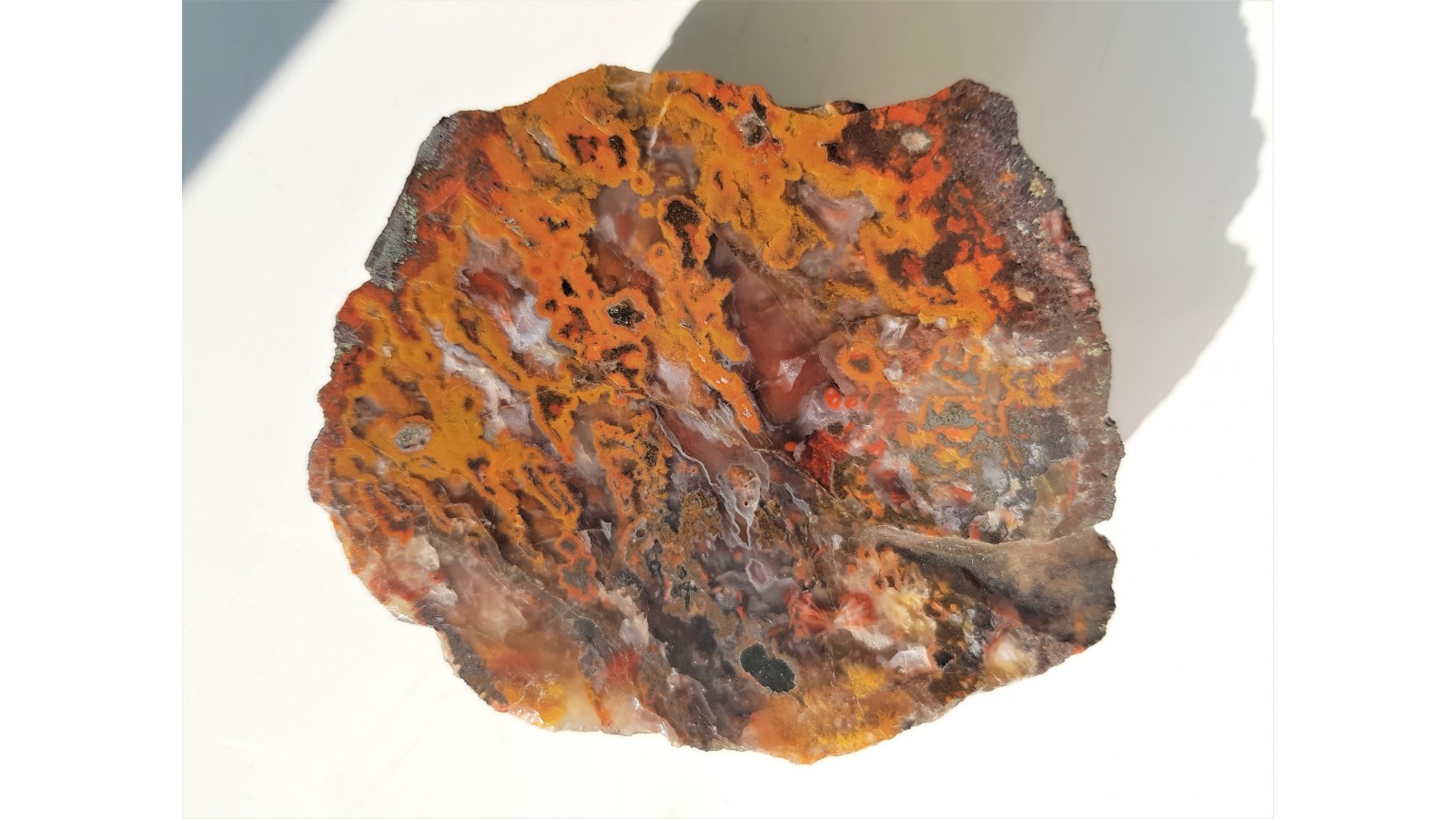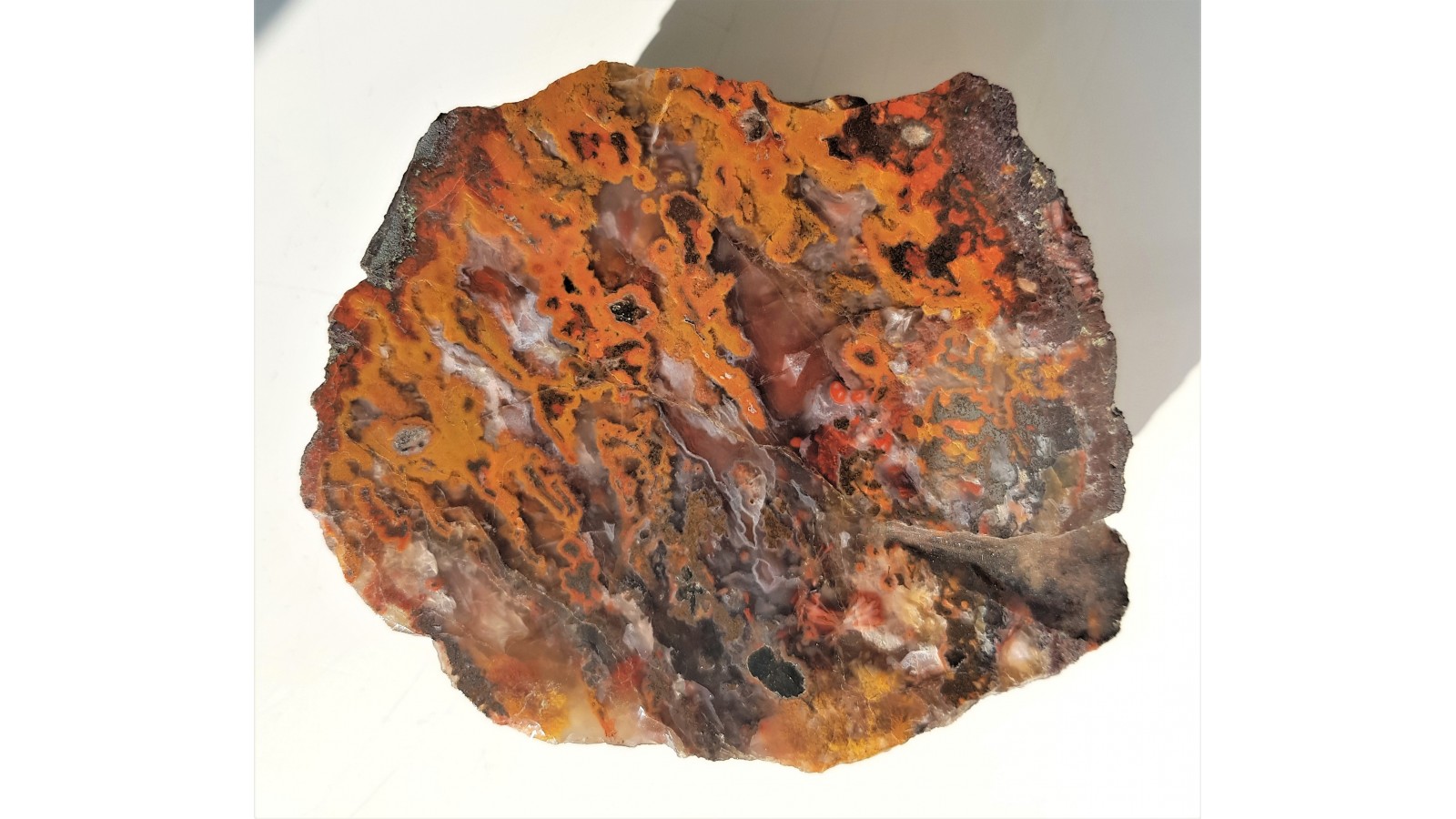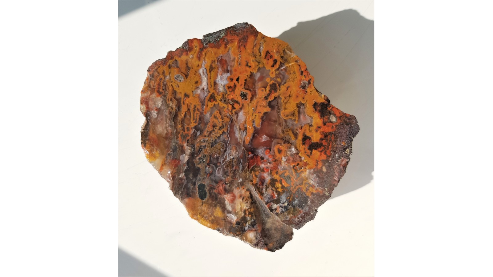 Niezwykły, pseudostalaktytowy agat z Suszyny k. Kłodzka. Solidny, duży okaz. Na przekroju widoczne intensywnie rude pseudostalaktyty w przezroczystym chalcedonie. Bardzo estetyczny i wyrazisty okaz. Strona przeciwna naturalna, nie cięta. Niezwykły okaz sprzed około 20 lat. Polecam.