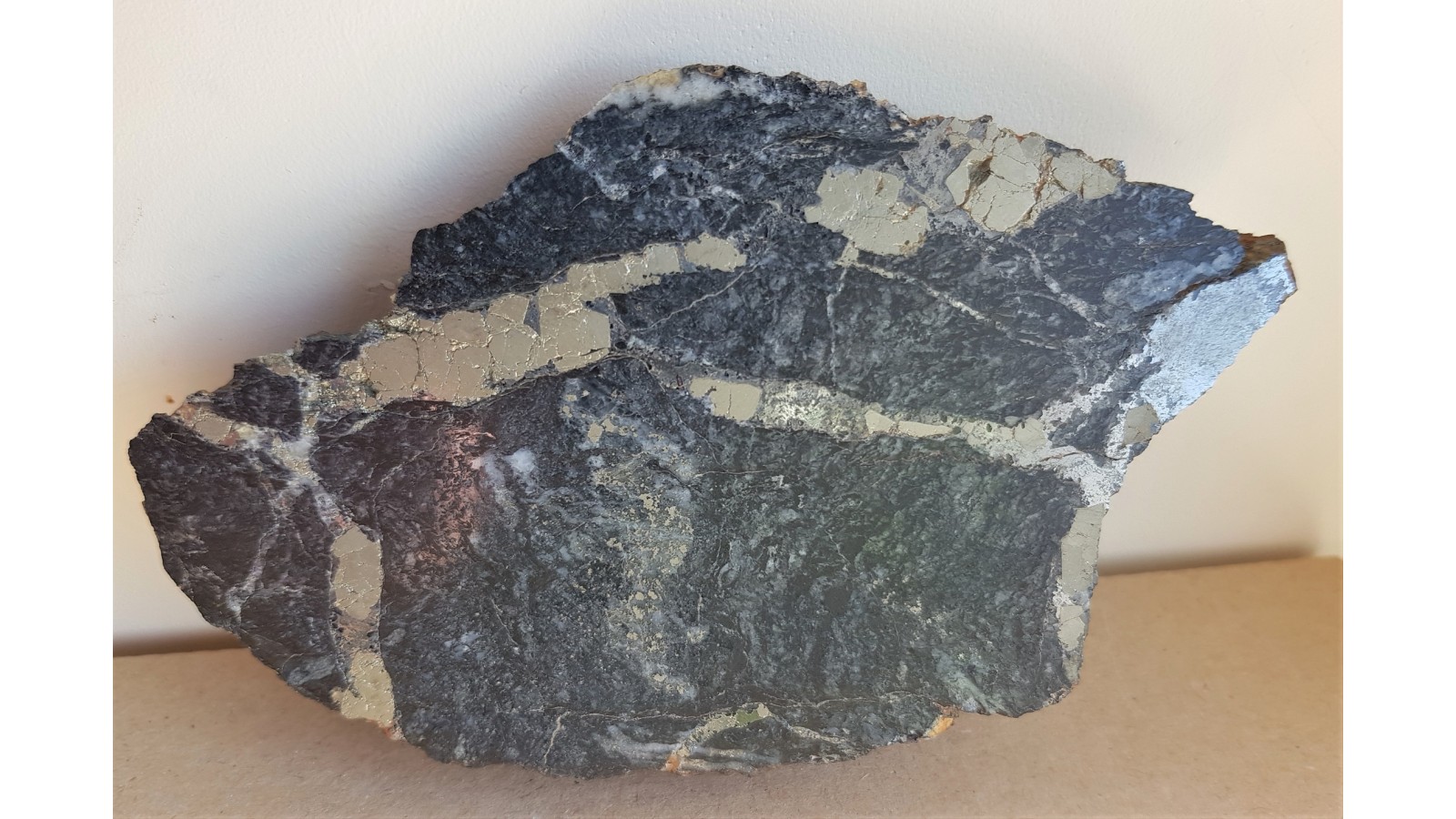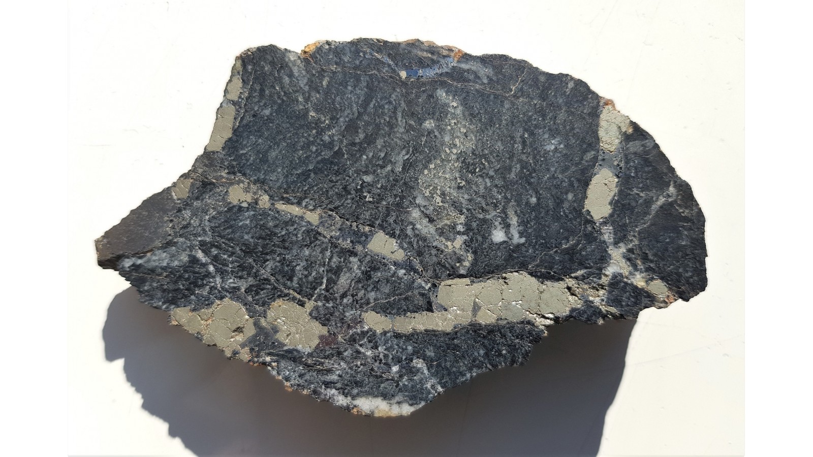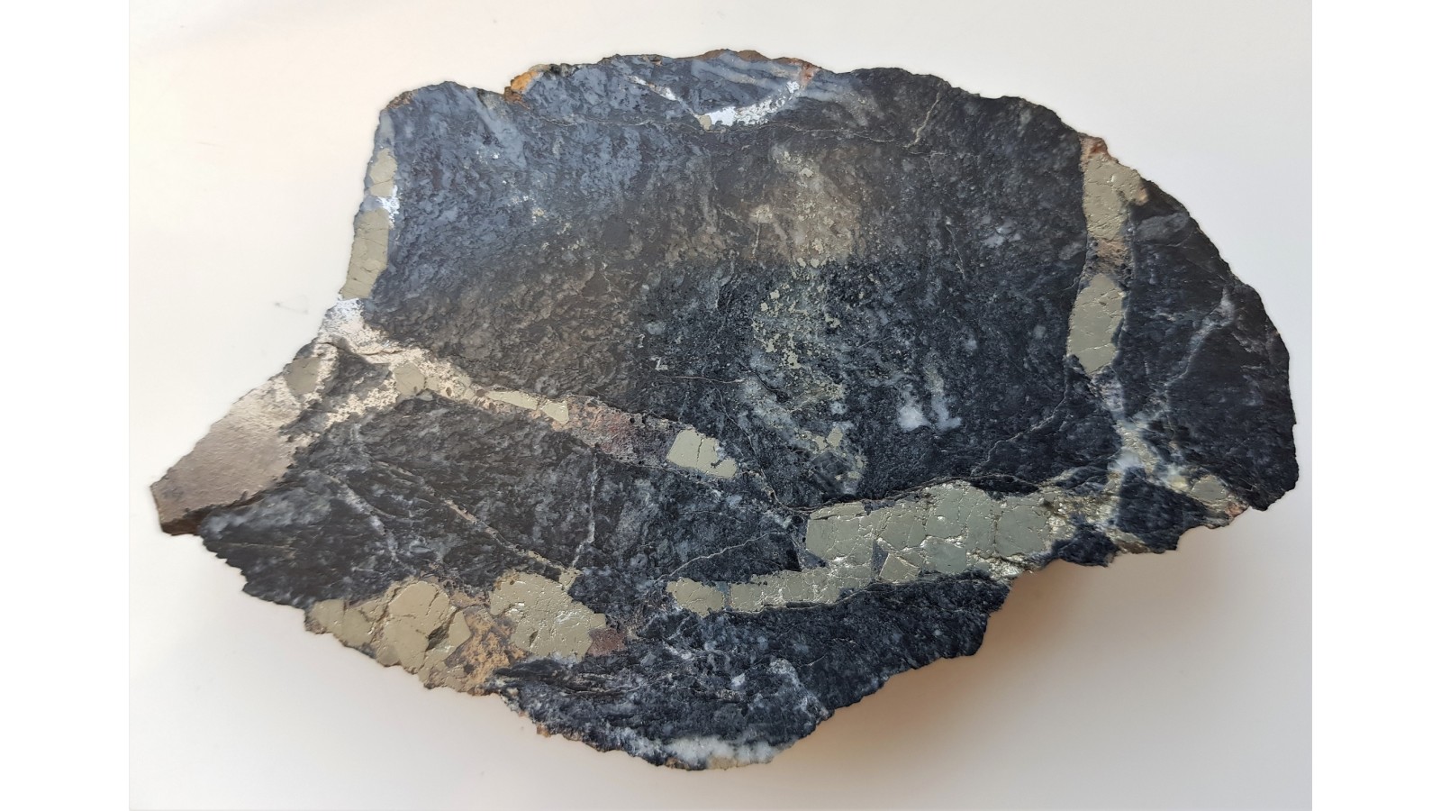 Żyłki kruszcowe o charakterze sztokwerkowym (siatka przecinających się żyłek) w masywnym, okruszcowanym, czarnym łupku radzinowickim ze Starej Góry. Żyłki kruszcowe głównie z arsenopirytem oraz pirytem. Okaz polerowany jednostronnie, doskonały kontrast pomiędzy jasnymi minetałami kruszcowymi i niemal czarną skałą macierzystą. Strona przeciwna naturalna, bez cięcią. Na niej widoczny cały kryształ pirytu. Okaz sprzed wielu lat, świetny poler, estetyczny, sporej wielkości. Polecam.