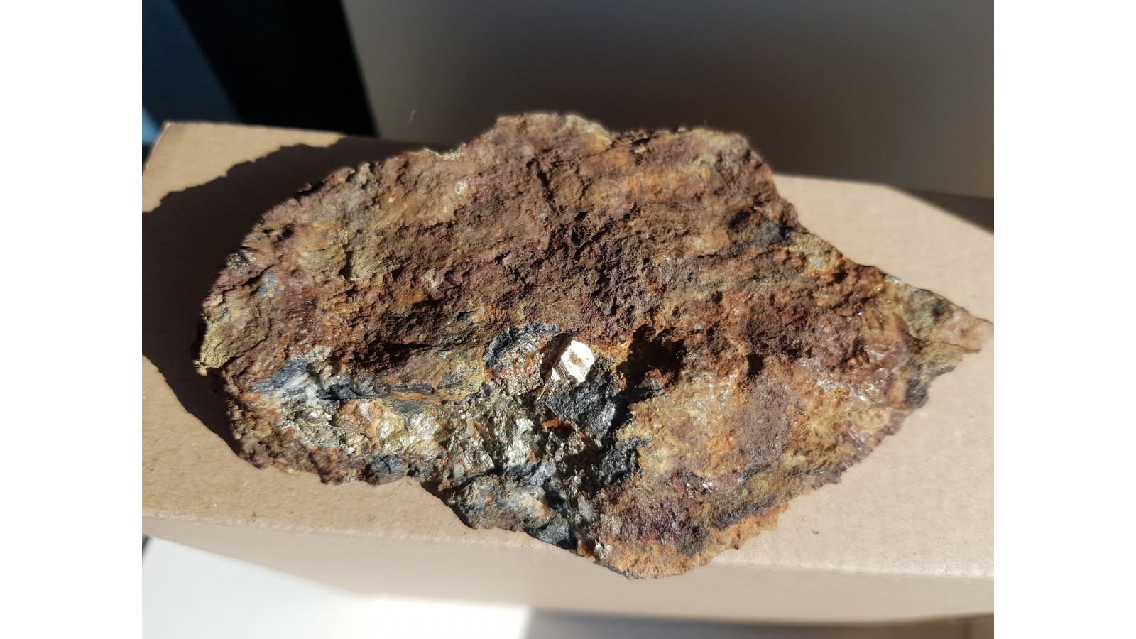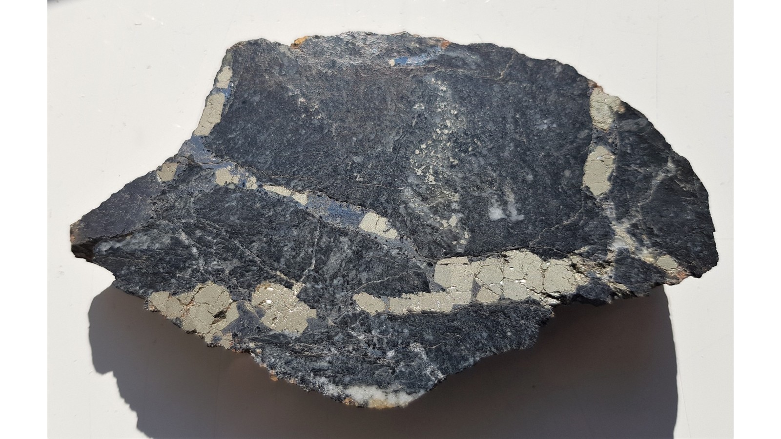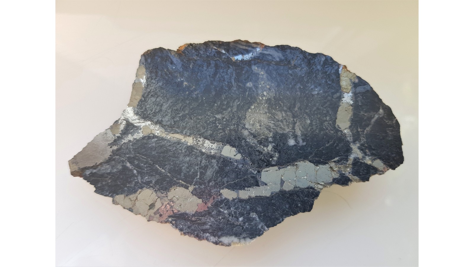 Żyłki kruszcowe o charakterze sztokwerkowym (siatka przecinających się żyłek) w masywnym, okruszcowanym, czarnym łupku radzinowickim ze Starej Góry. Żyłki kruszcowe głównie z arsenopirytem oraz pirytem. Okaz polerowany jednostronnie, doskonały kontrast pomiędzy jasnymi minetałami kruszcowymi i niemal czarną skałą macierzystą. Strona przeciwna naturalna, bez cięcią. Na niej widoczny cały kryształ pirytu. Okaz sprzed wielu lat, świetny poler, estetyczny, sporej wielkości. Polecam.