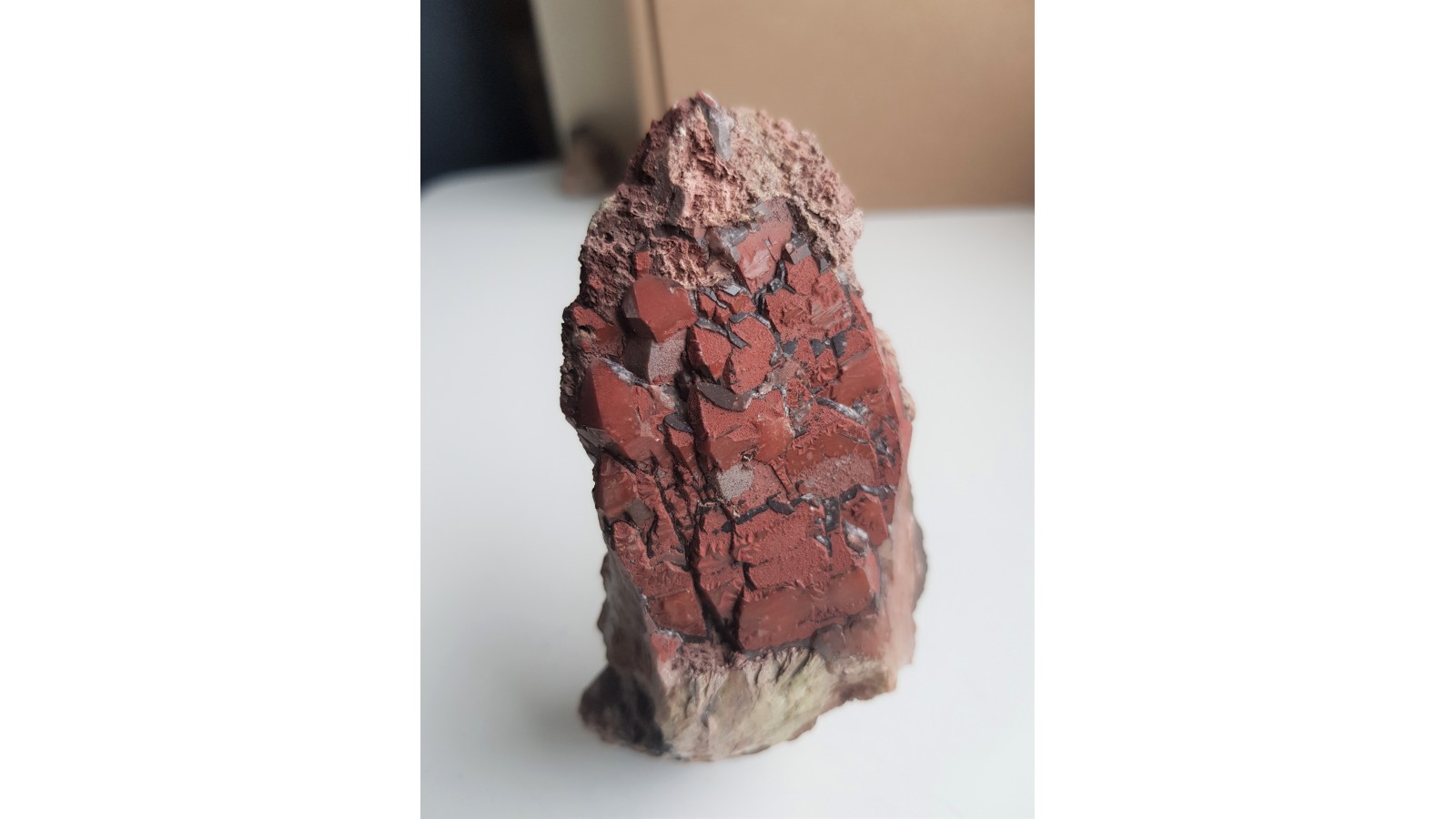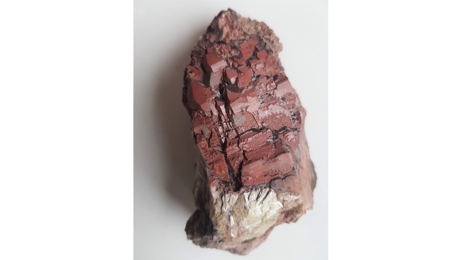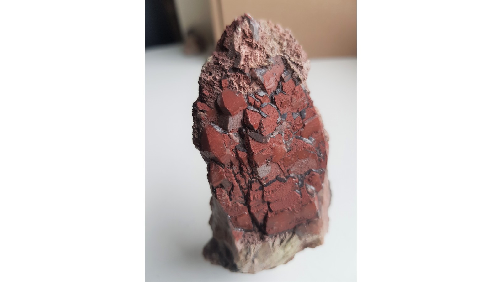 Narastający na pegmatycie, wykształcony jako zrost wielu błyszczących, nieuszkodzonych kryształów, intensywnie zabarwiony na kolor czerwony kwarc żelazisty z Rudaw Janowickich. Okazy te są cenione z uwagi na piękny kolory spowodowany narastaniem czerwonego hematytu na jednej z generacji (wewnątrz) kryształów kwarcu. Polecam.