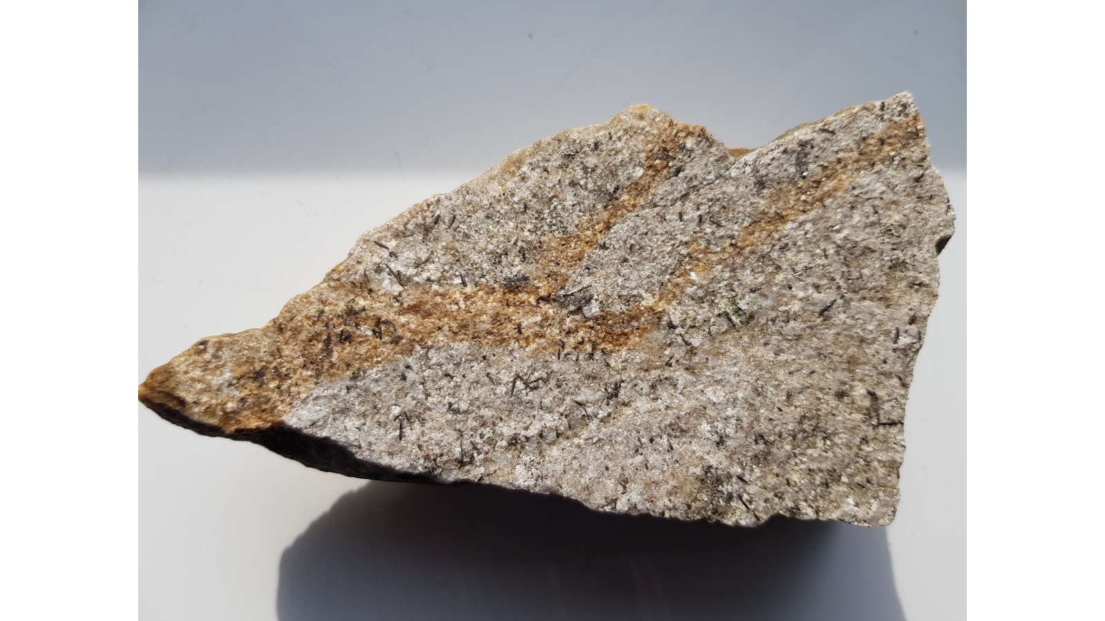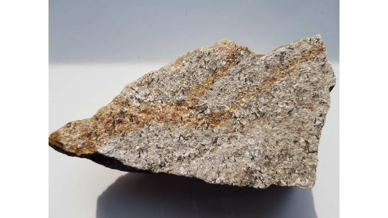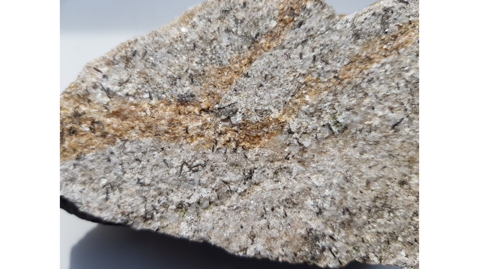 Okaz masywnego kwarcytu z okolic góry Gromnik k. Romanowa (Wzgórza Strzelińskie) z licznymi, igiełkowatymi kryształami turmalinu barwy brązowej. Kryształy przeświecające będź przezroczyste, choć niewielkie (ok. 0,5 cm). Kryształy na powierzchni foliacji kwarcytów. Geneza jest związana nie z procesami metamorfizmu, jak w przypadku łupków z Jegłowej, lecz z oddziaływaniem kontaktowym granitoidów strzelińskich. Kwarcyty lokują się na kontakcie z masywem granitoidowym. W strefie kontaktowej notuje się wzbogacenie w minerały takie jak turmalin, w strefach zluźnień otaczającej skały metamorficznej. Kryształy o silnym połysku, wyraźna bawrwa brązowa. Ciekawostka lokalna. Polecam.