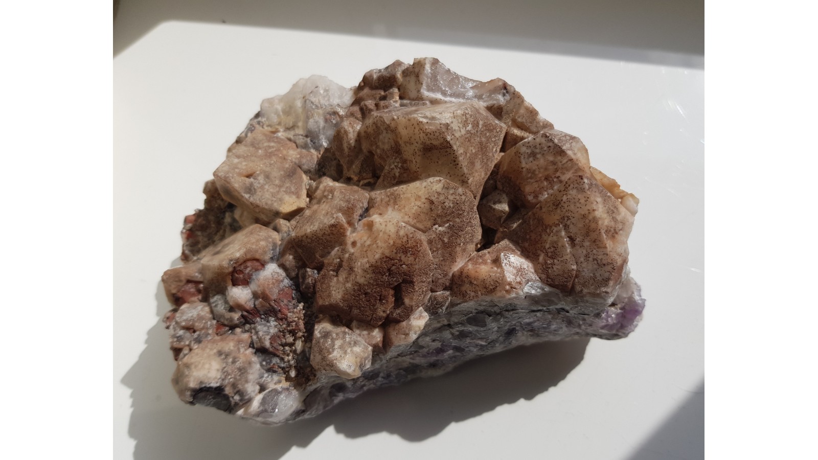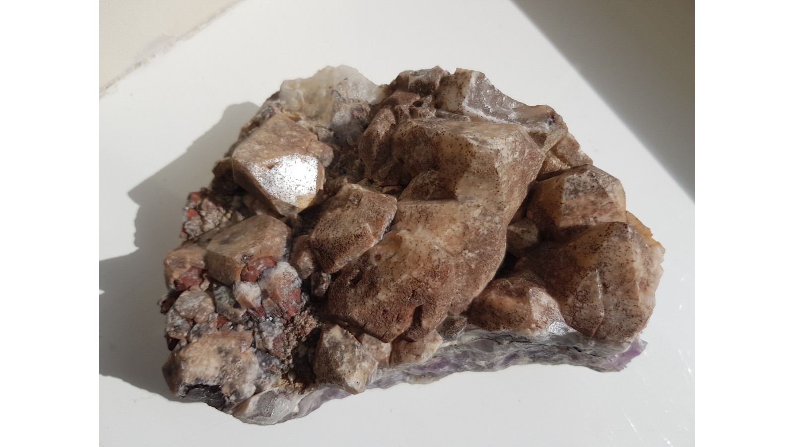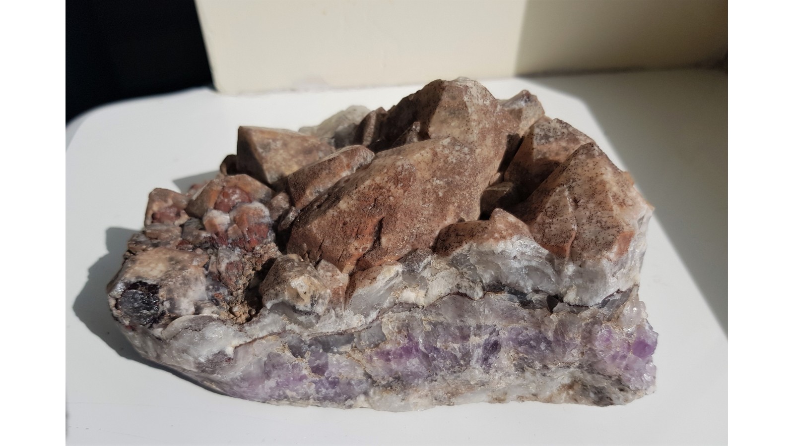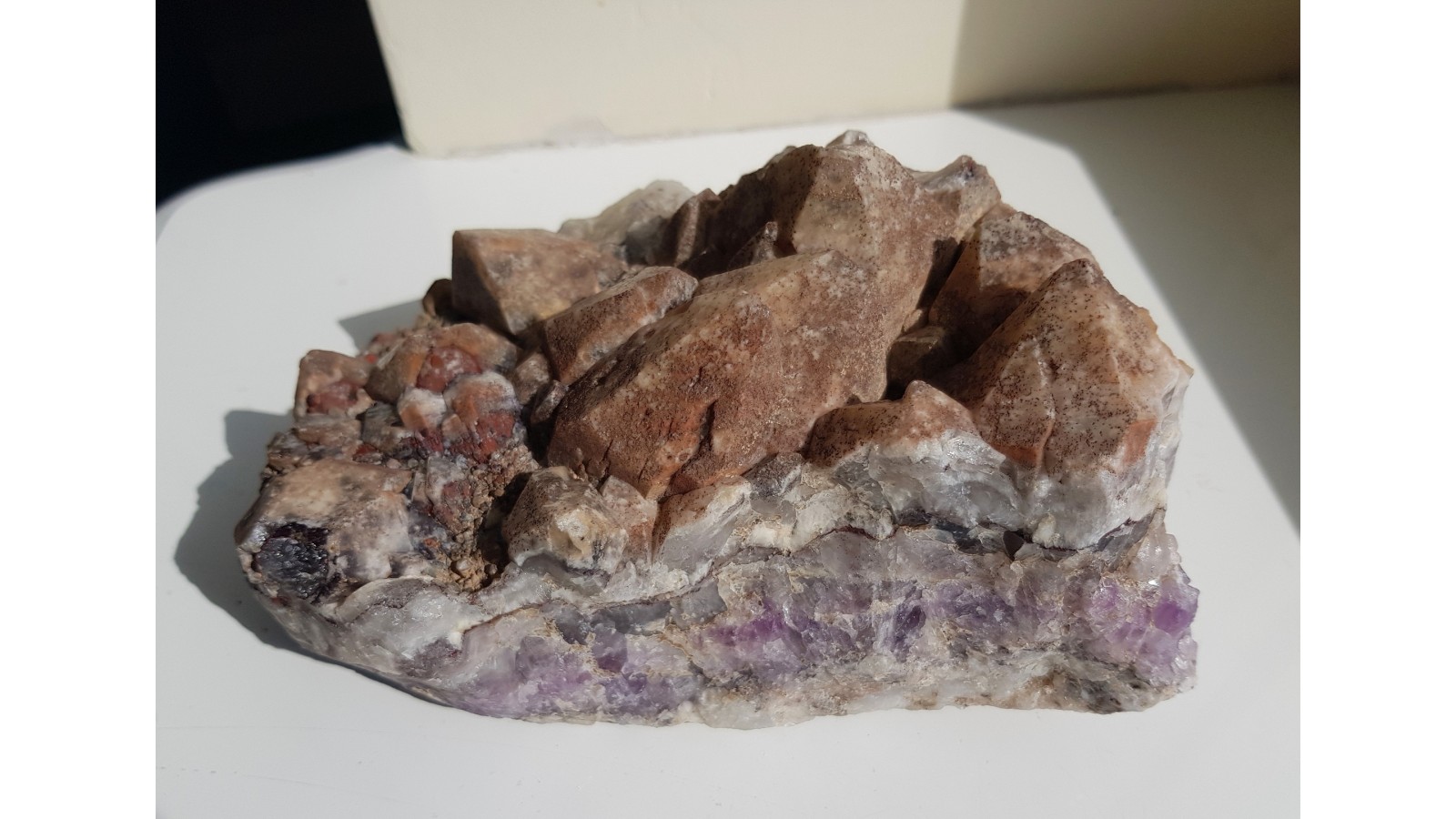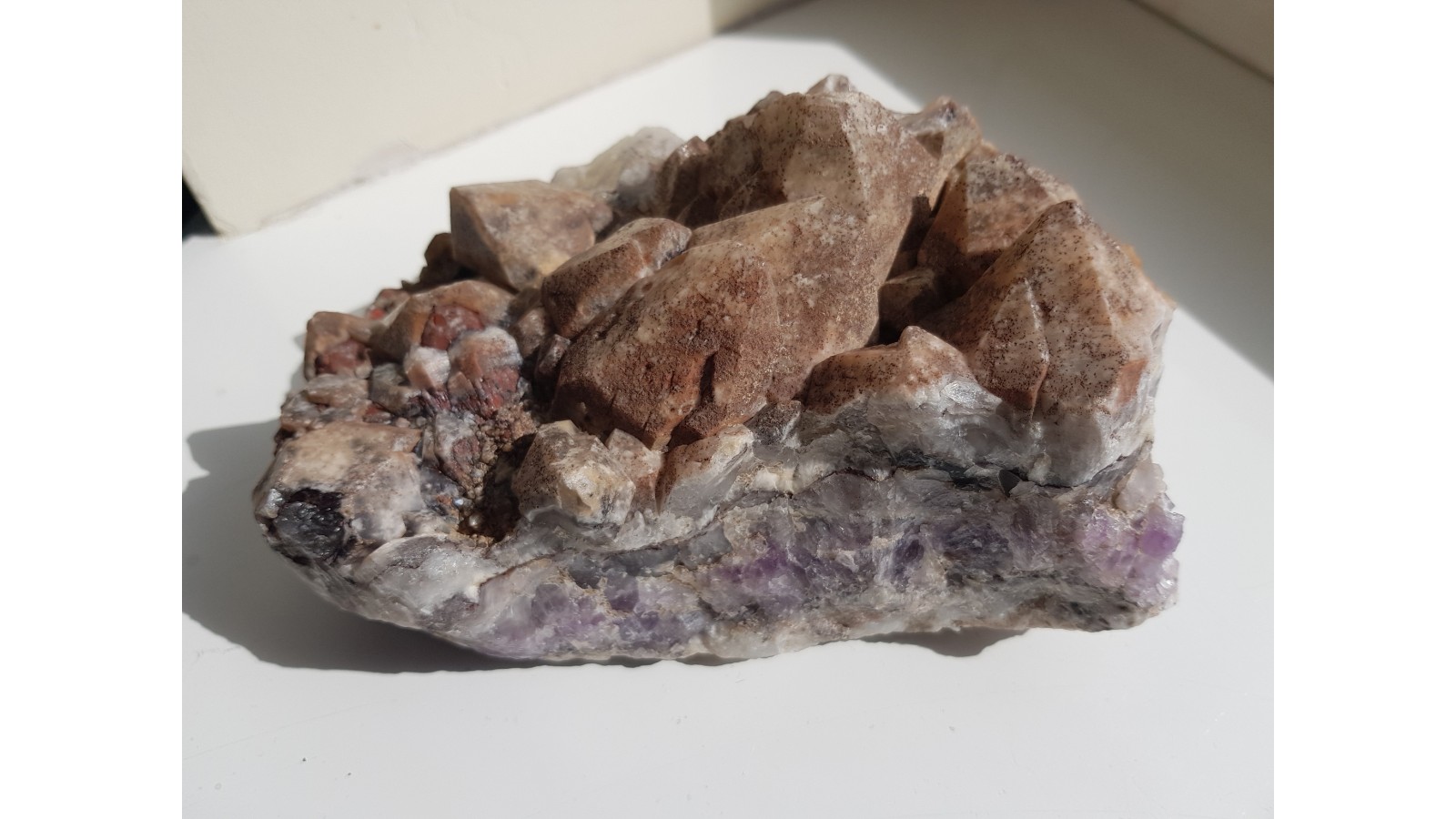 Piękna szczotka ametystowa z ostatnią generacją kwarcu mlecznego, lecz poprzednie są kwarcem żelazistym oraz ametystem (ametyst widoczny na przekroju). Szczotka bez istotnych uszkodzeń. Te, których można się dopatrzyć nie mają wpływu na estetykę okazu. Bardzo duże kryształy kwarcu. Całość wyjątkowej jakości. Bez obróbki, tj. cięcia czy szlifu. Lokalizacja tzw. Trzy Jawory, Jagniątków. Polecam.