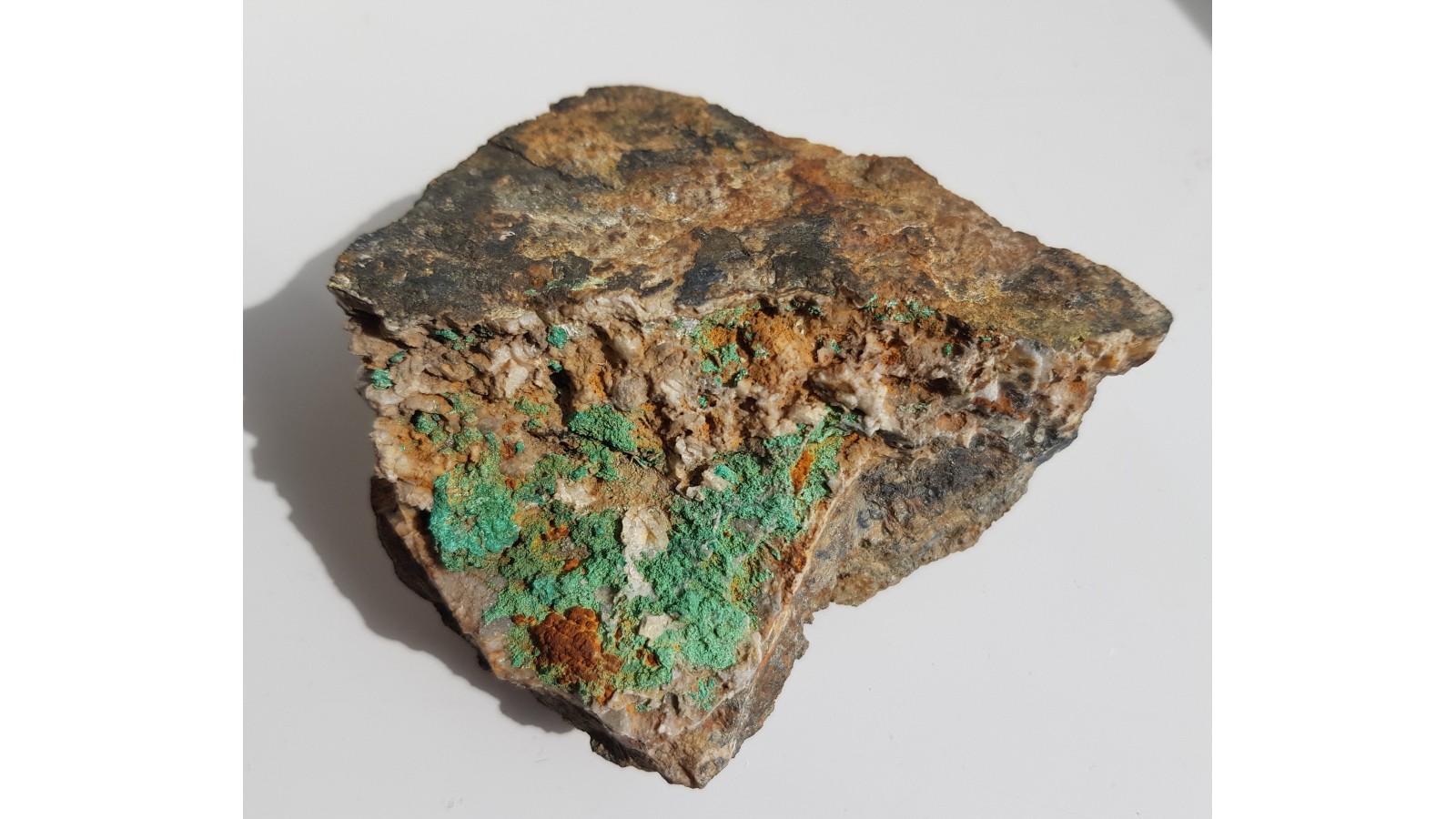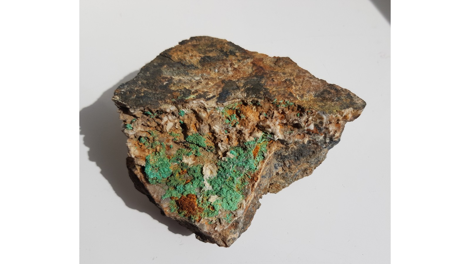 Grube naskorupienia malachitu w żyle kruszcowej z kopalni Dorothea w Janowicach Wlk. (pole złożowe Miedzianki-Ciechanowic). Estetyczny okaz, bez obróbki, cięcia, w pełni naturalny. Lokalizacja wyeksploatowana. Rzadkość, polecam.