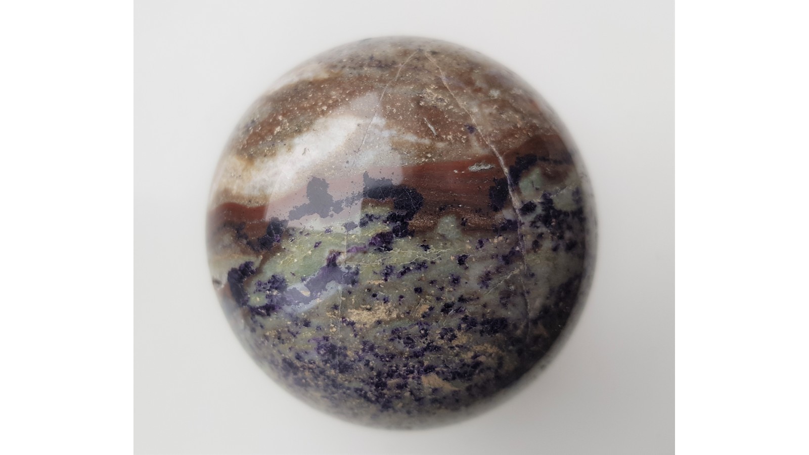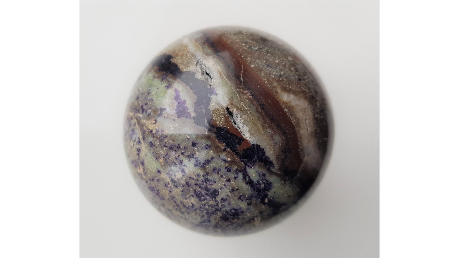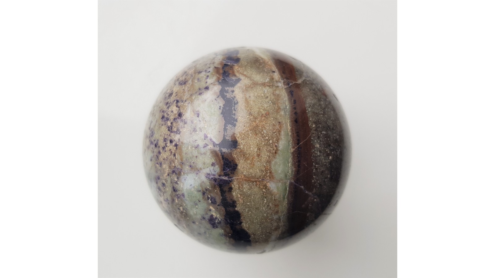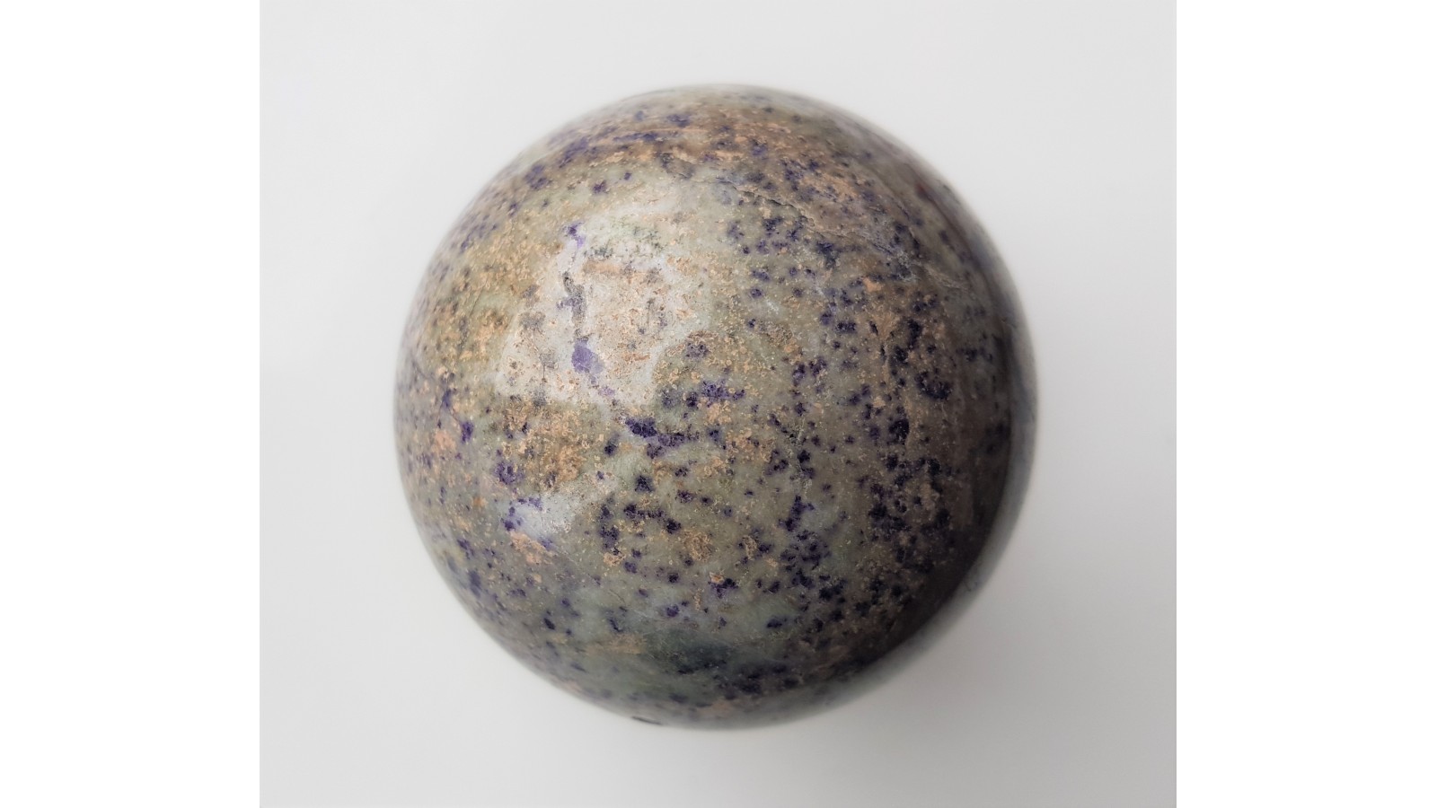 Kula ze skały ze złoża w Kletnie przesycona antozonitem (ciemnofioletowym fluorytem). Niemal bez spękań. Ciekawy deseń z uwagi na strefy wykształcone pasmowo, smugowo oraz bardziej "nakrapiane". Idealny poler. Polecam.