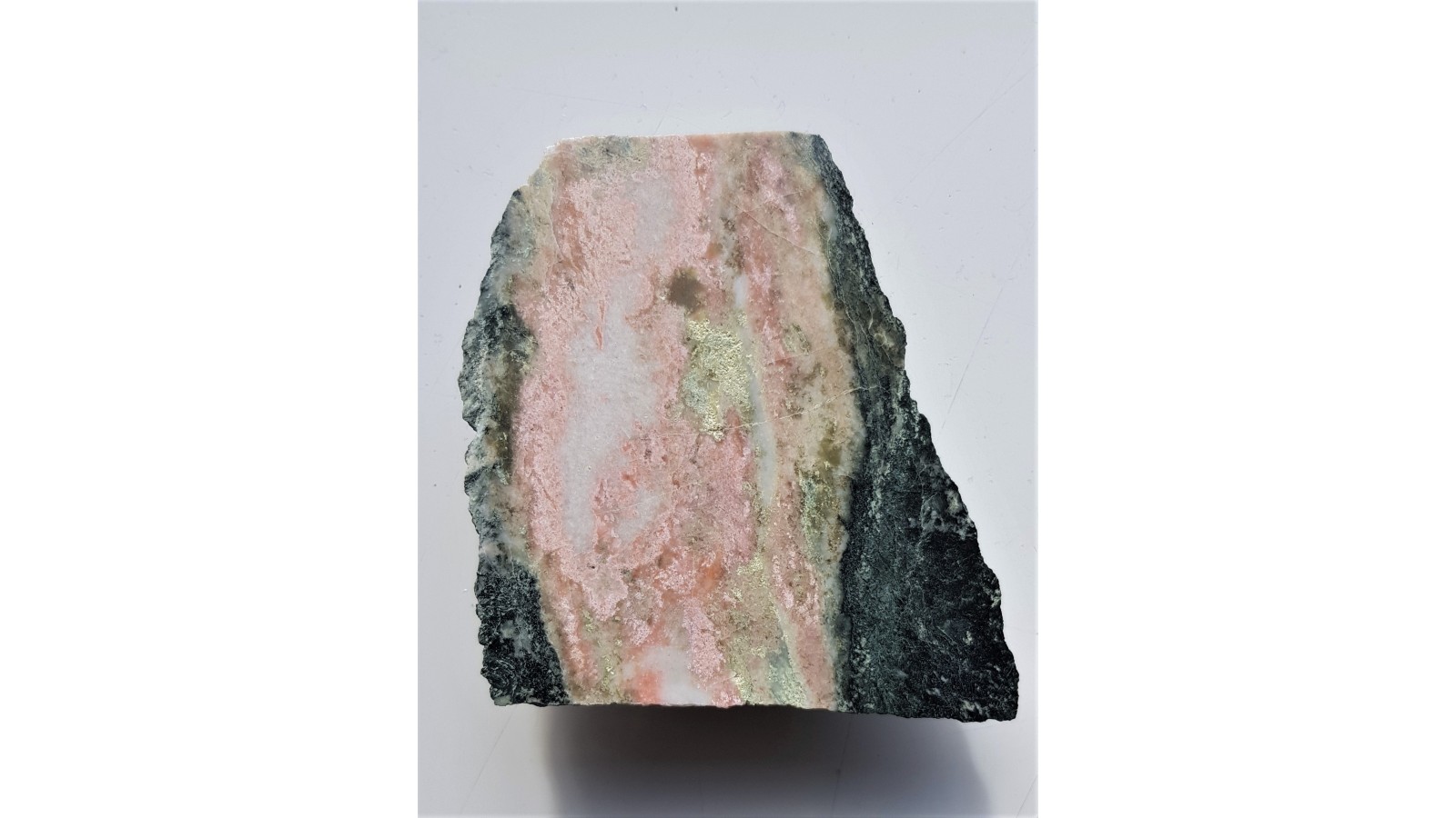 Polerowany okaz różowego rodingitu w formie budiny w amfibolicie z okolic Sobótki k. Wrocławia. Dotychczas nieopisywane wystąpienie. Lokalna ciekawostka. Okaz polerowany jednostronnie, strona przeciwna naturalna. Ze strefy kontaktu z granitami okolic Sobótki. Polecam.