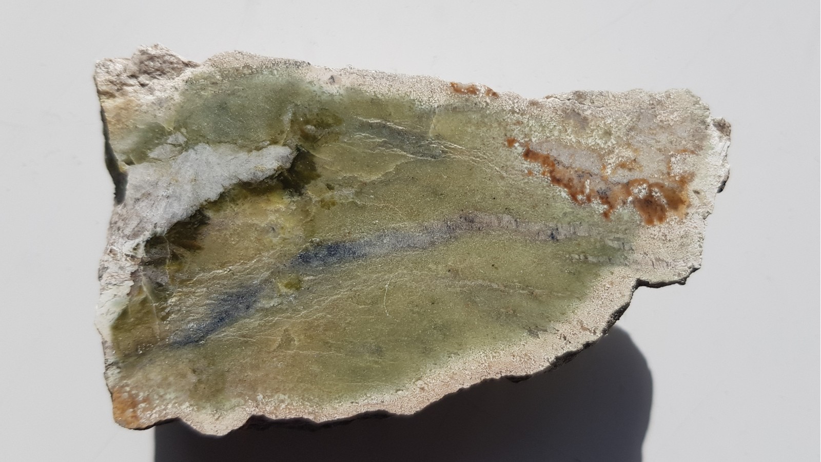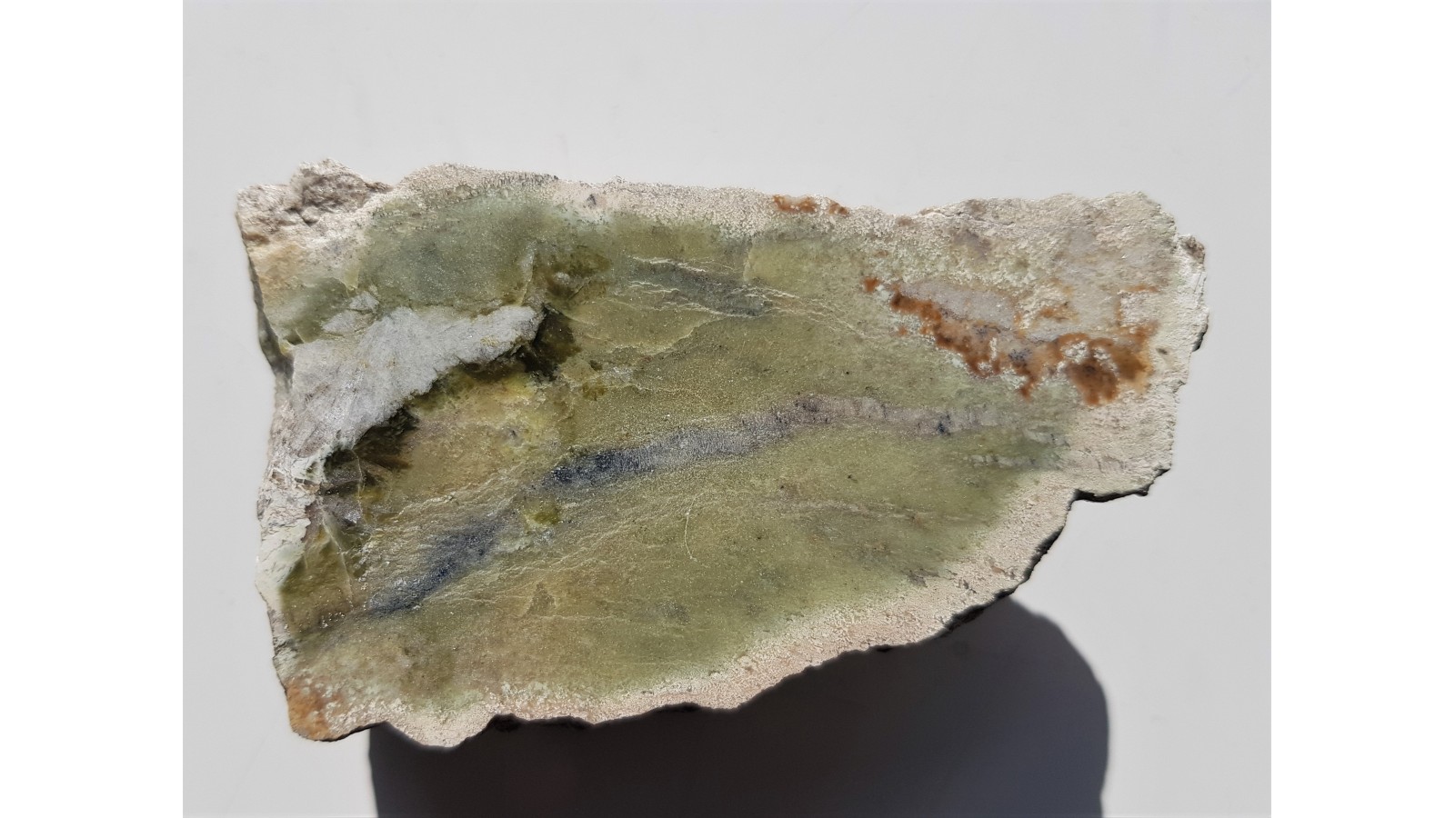 Ofikalcyt - skała węglanowa, kalcytowo-dolomitowa z przerostami minerałów serpentynowych z nowego stanowiska - Góry Gromnik k. Strzelina. Na zgładzie widoczne strefy czystego serpentynitu oraz "wachlarze" kryształów białego diopsydu. Skała pochodzi ze strefy kontaktowej skał węglanowych z granitem intruzji Strzelińskiej. Okaz polerowany jednostronnie, strona przeciwna naturalna. Polecam.