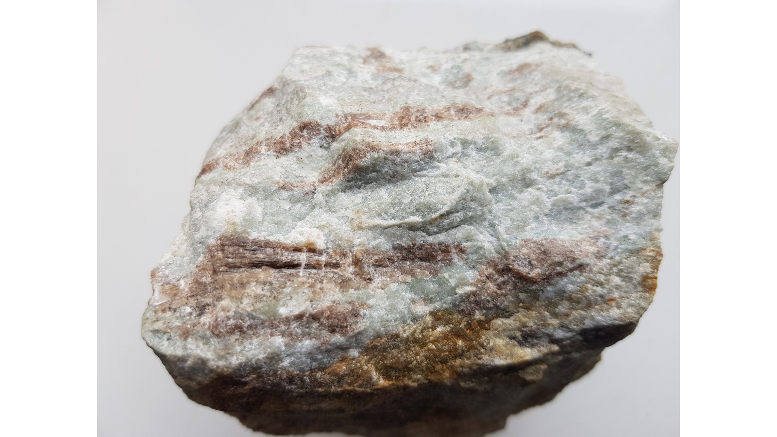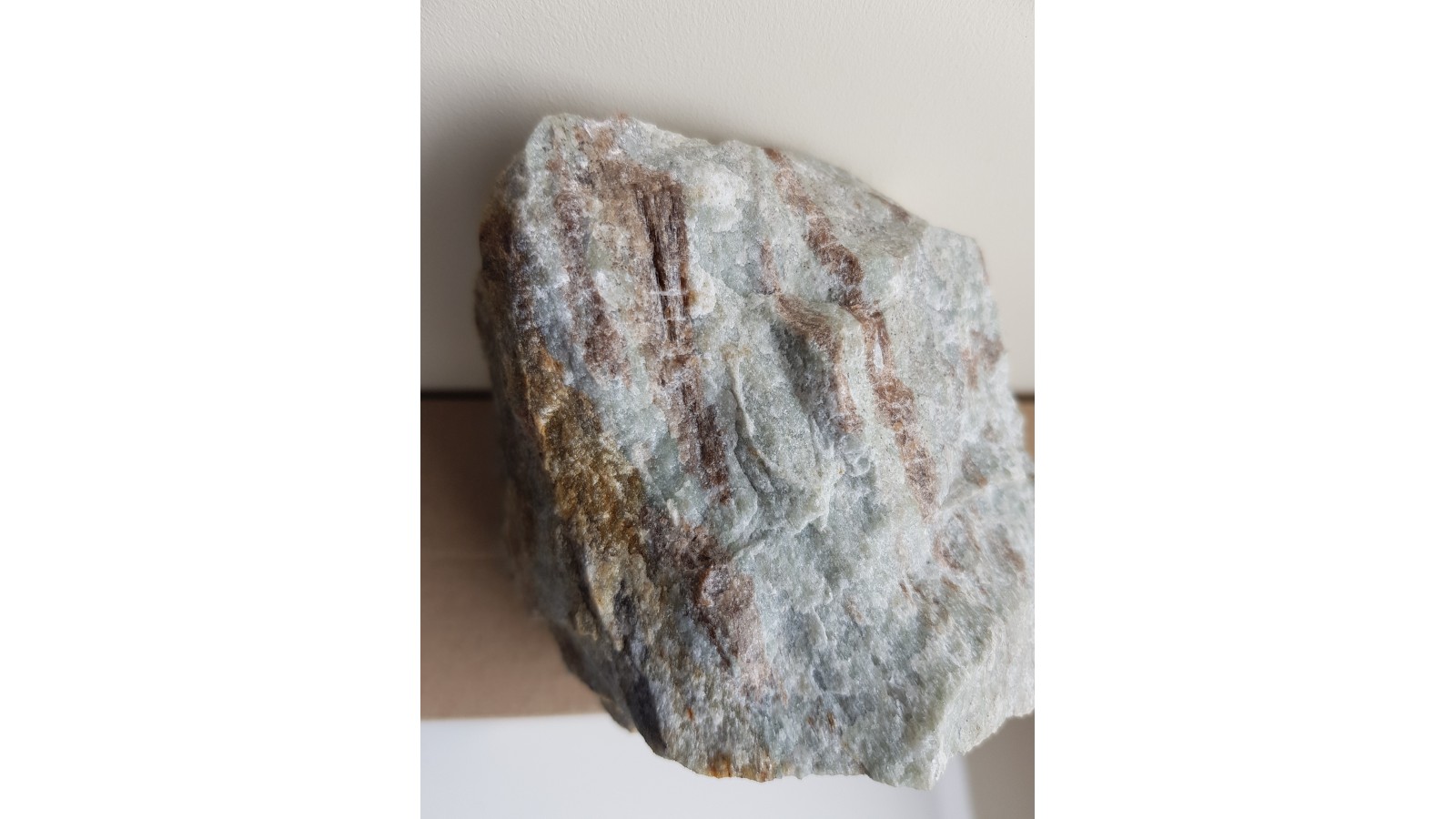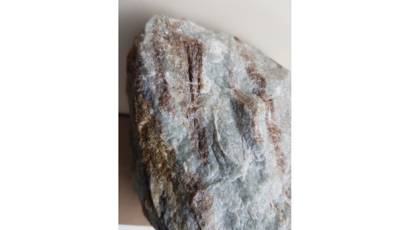 Wiązki kryształów wezuwianu barwy brązowej wrośnięte w jasną skałę wapniowo-krzemianową z Samborowiczek k. Strzelina. Kryształy wykazują pionowe prążkowanie, ściany z połyskiem. Pod lupą przeświecające. Okaz bardzo estetyczny, kontrast barwny między kryształami wezuwianu i skałą otaczającą. Wezuwiany krystalizowały w obrębie warstwewek bądź gniazd wezuwianowych w skale. Polecam.