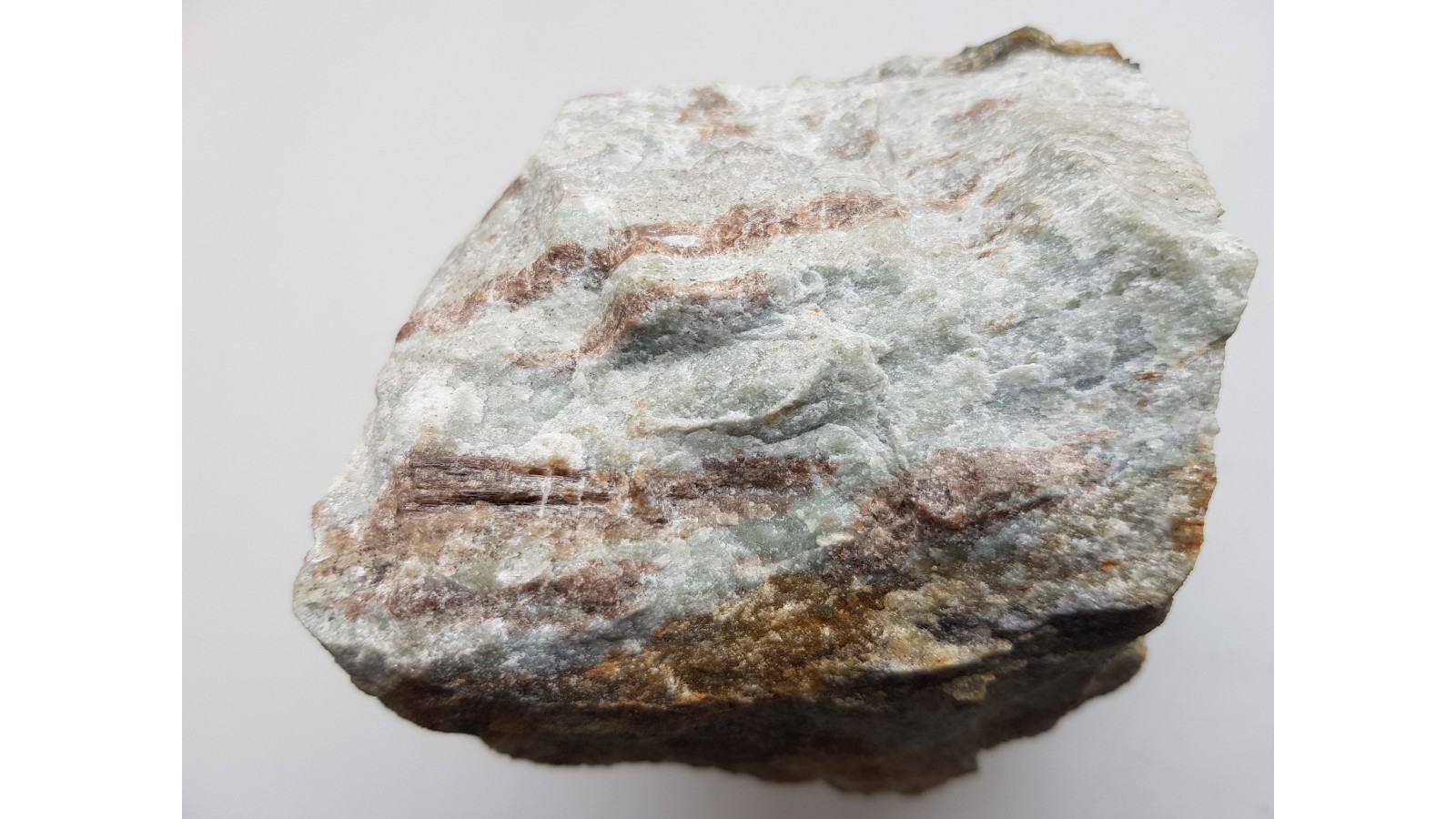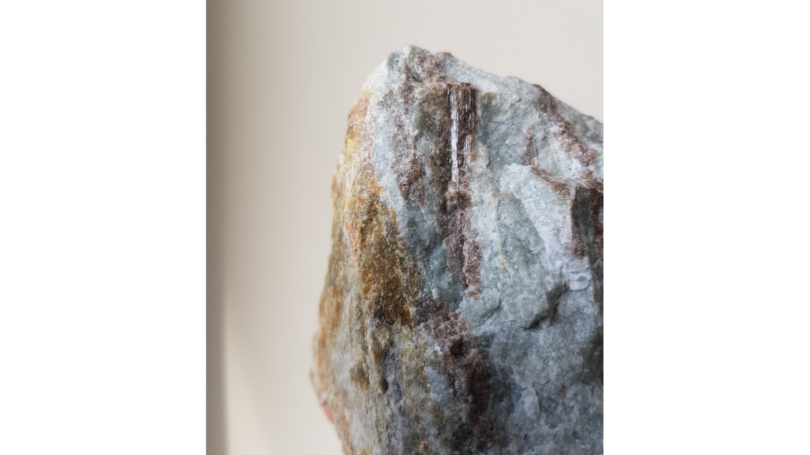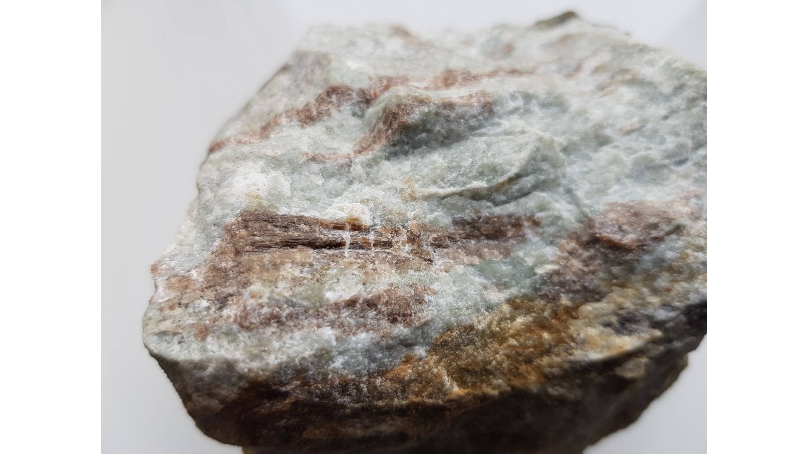 Wiązki kryształów wezuwianu barwy brązowej wrośnięte w jasną skałę wapniowo-krzemianową z Samborowiczek k. Strzelina. Kryształy wykazują pionowe prążkowanie, ściany z połyskiem. Pod lupą przeświecające. Okaz bardzo estetyczny, kontrast barwny między kryształami wezuwianu i skałą otaczającą. Wezuwiany krystalizowały w obrębie warstwewek bądź gniazd wezuwianowych w skale. Polecam.