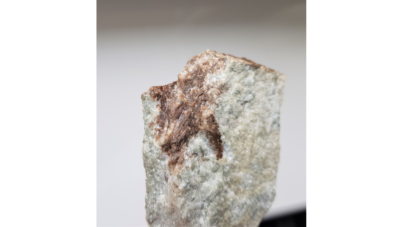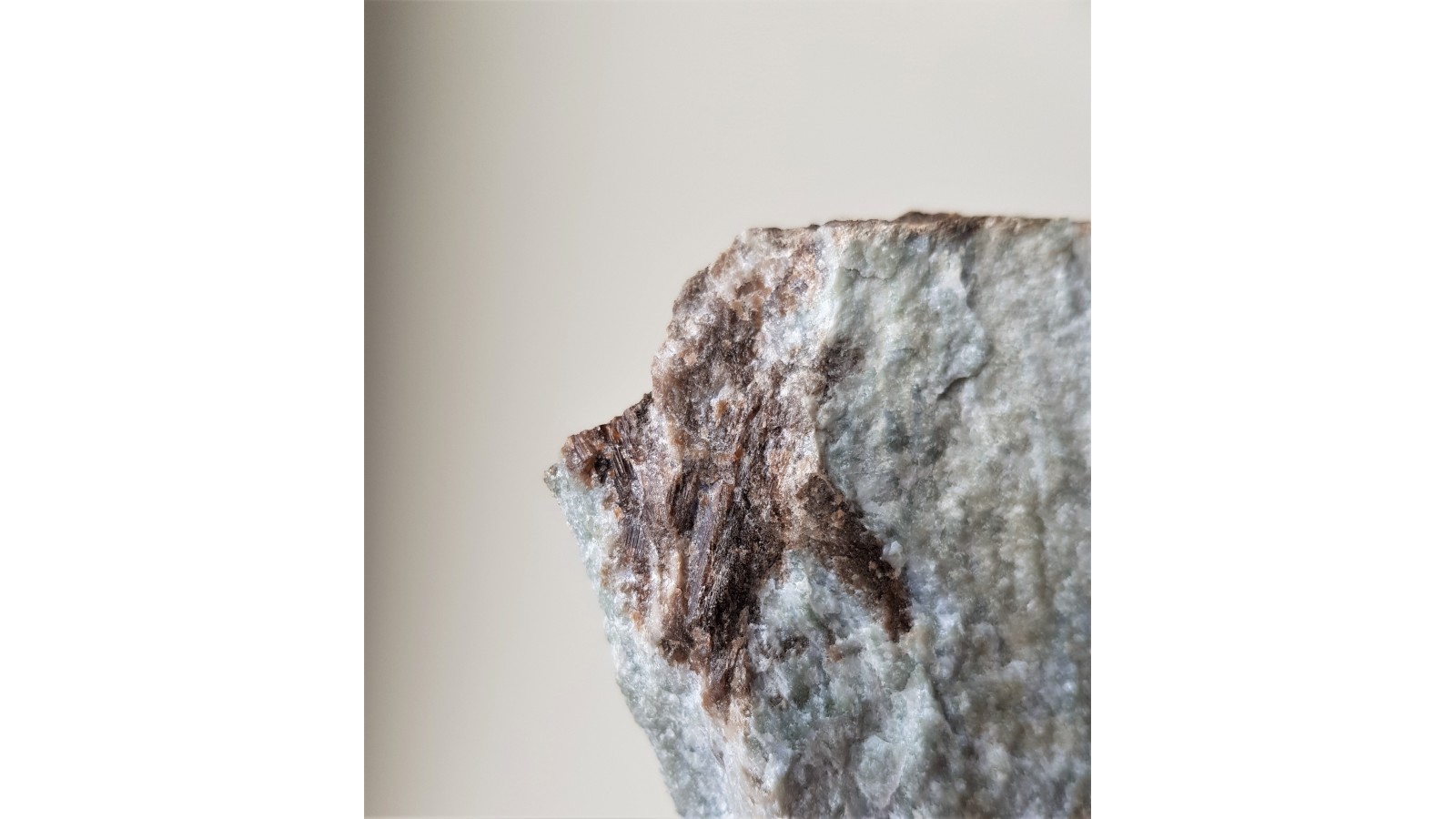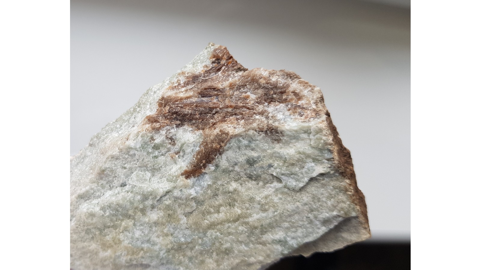 Wiązki kryształów wezuwianu barwy brązowej wrośnięte w jasną skałę wapniowo-krzemianową z Samborowiczek k. Strzelina. Kryształy wykazują pionowe prążkowanie, ściany z połyskiem. Widoczne przerosty wachlarzowatych skupień minerału. Pod lupą przeświecające. Okaz bardzo estetyczny, kontrast barwny między kryształami wezuwianu i skałą otaczającą. Wezuwiany krystalizowały w obrębie warstwewek bądź gniazd wezuwianowych w skale. Polecam.