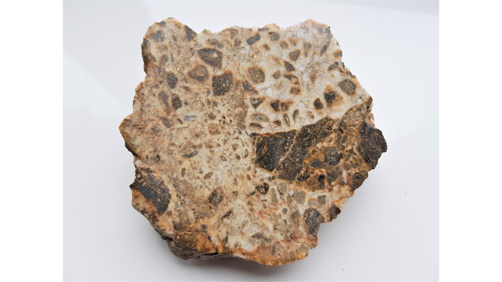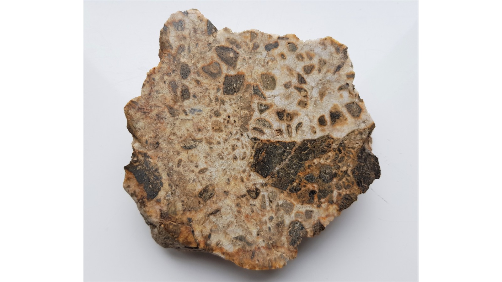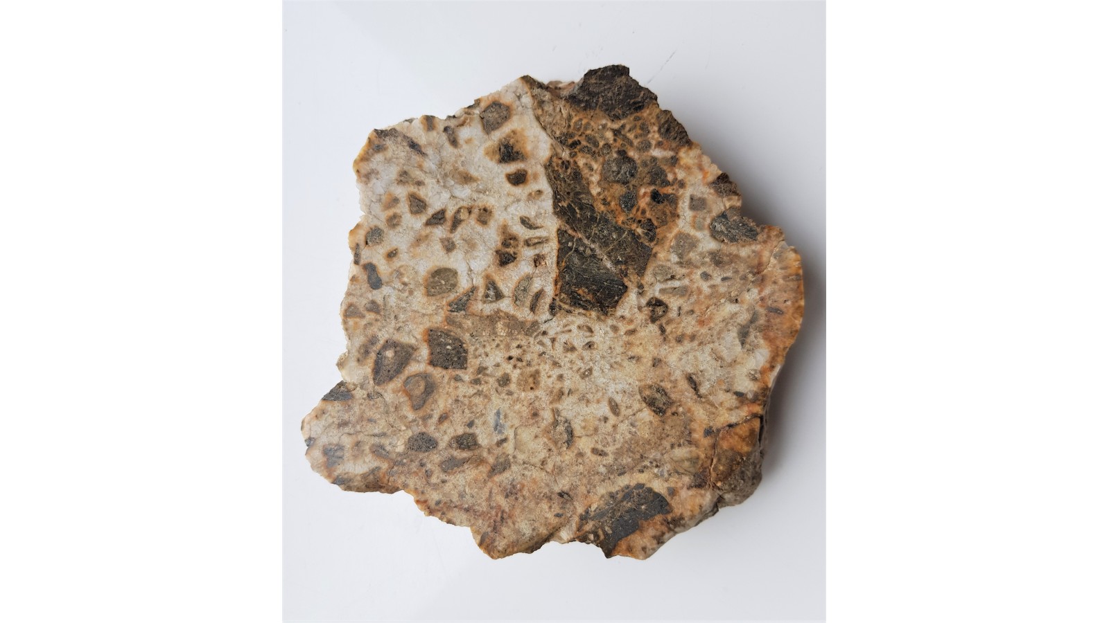 Okaz polerowany brekcji z Gębczyc k. Strzelina. Na zgładzie widoczne są klasty (okruchy) brązowej skały metamorficznej, w której także obserwować można ostrokrawędziste kwarce, zaś jej wygląd wskazuje na metaszarowakę bądź paragnejs (gnejs powstały z przeobrażenia skał osadowych). Fragmenty tej skały obrasta mleczny kwarc, który jednocześnie spaja całą brekcję. Okaz jest reprezentantem strefy intruzji granitów strzelińskich we wcześniejszą osłonę metamorficzną, która tutaj jest widoczna jako fragmenty metaszarowaki. Fragmenty skał osłony spaja kwarc będący pochodną intruzji granitów. Okaz polerowany jednostronnie, idealny poler, strona przeciwna naturalna, bez cięcia. Okaz petrologiczno-geologiczny z obszaru intruzji karbońskich granitów strefy Strzelina. Polecam.