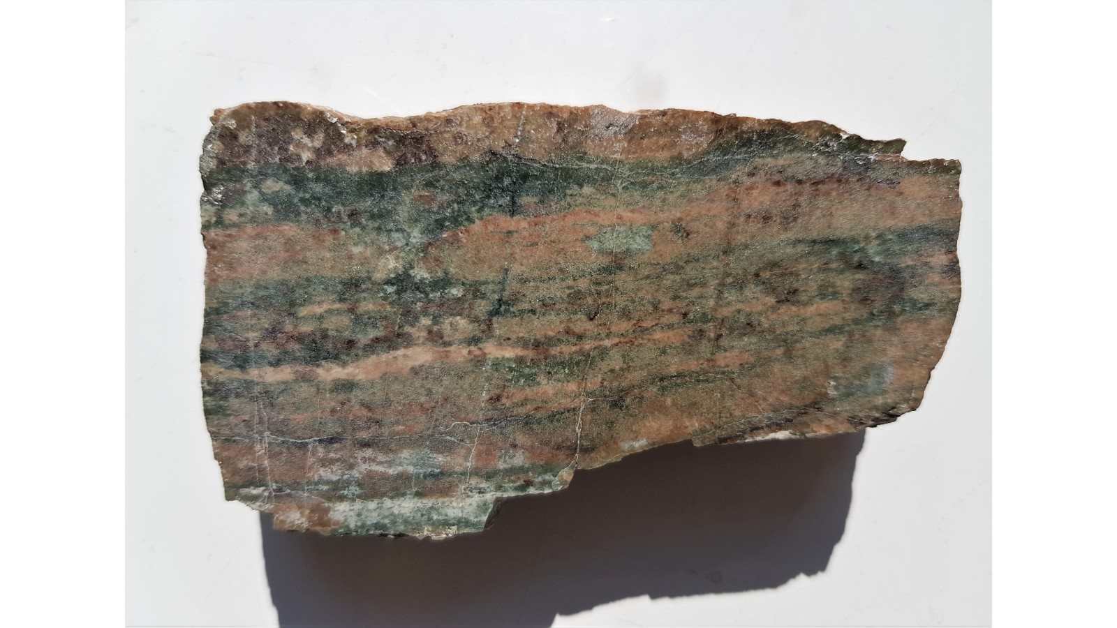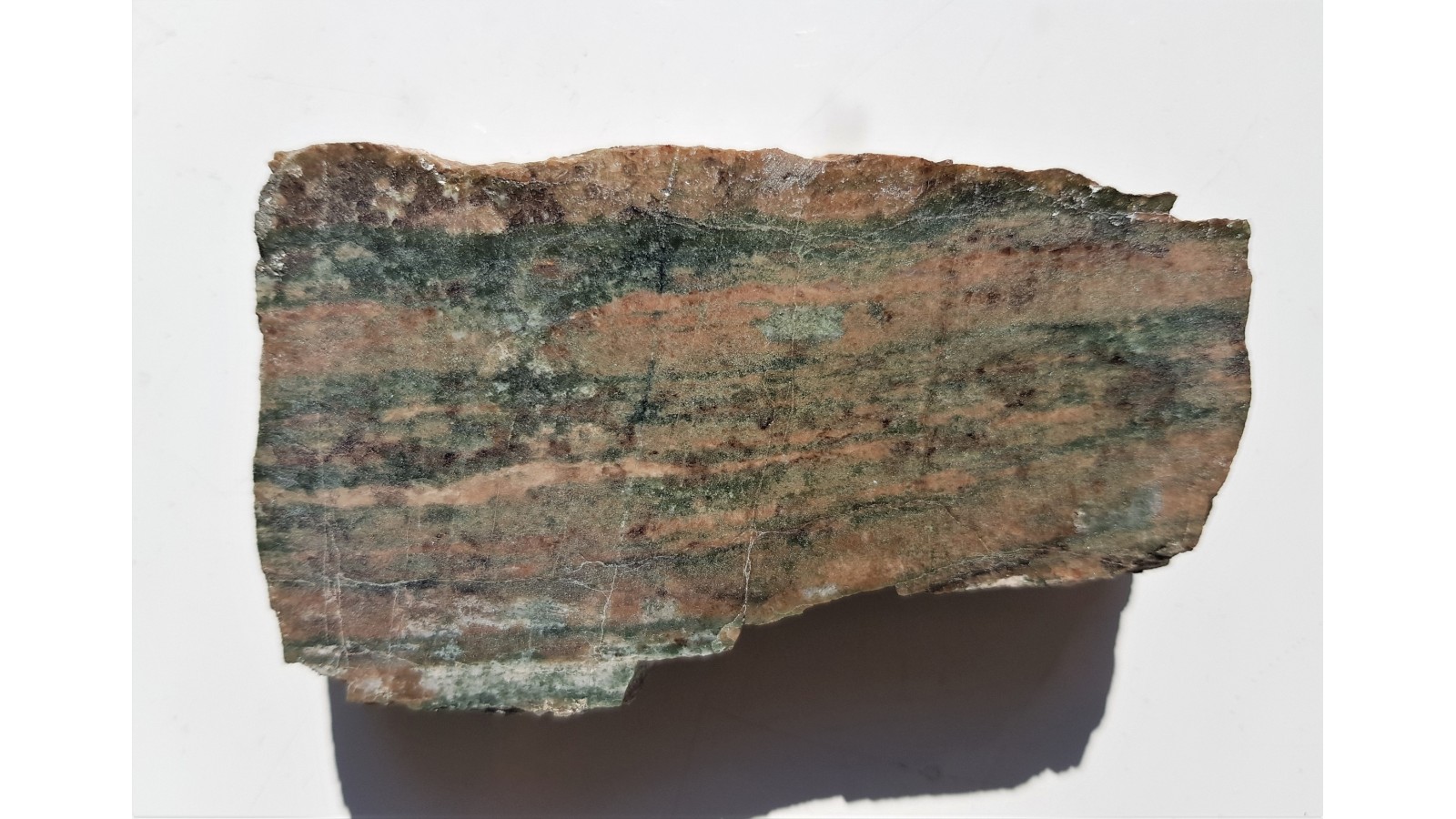Polerowany okaz skały wapniowo-krzemianowej z Samborowiczek k. Strzelina. Widoczne laminy barwy jasnobrązowej złożone z wezuwianu oraz granatów a także zielonej, złożone głównie z piroksenów i amfiboli. Okaz polerowany jednostronnie, strona przeciwna naturalna, nie cięta. Polecam.