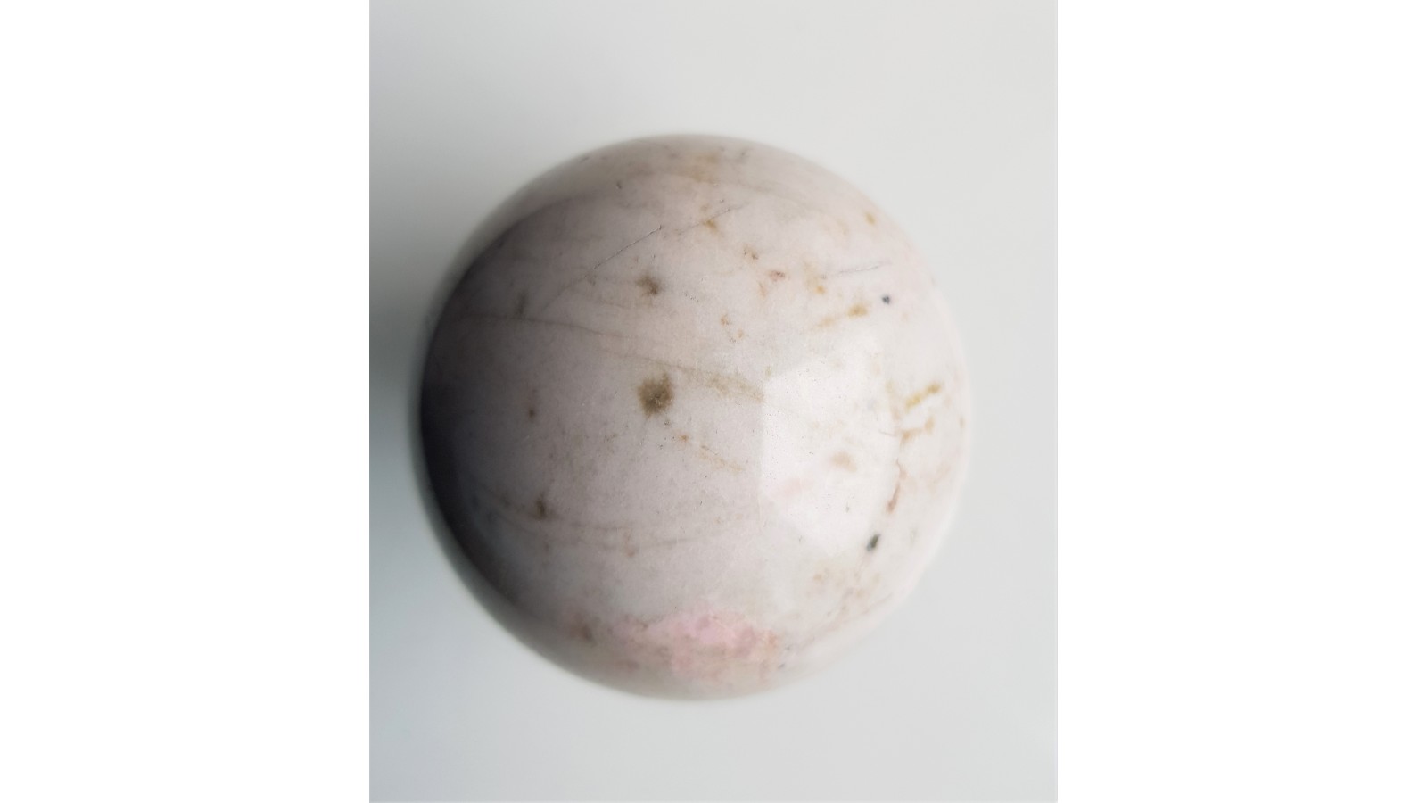 Kula z rodingitu z nieznanej szerzej lokalizacji w obrębie amfibolitów w okolicy Sobótki k. Wrocławia. Kula z bardzo ciężkiego materiału, zapewne z granatami, wygląd porcelanowy z różowymi strefami, bardzo masywna, bez spękań. Idealny poler. Wyjątkowo piękna skała i wykonanie. Bardzo estetyczny okaz z unikatowego materiału. Polecam.
