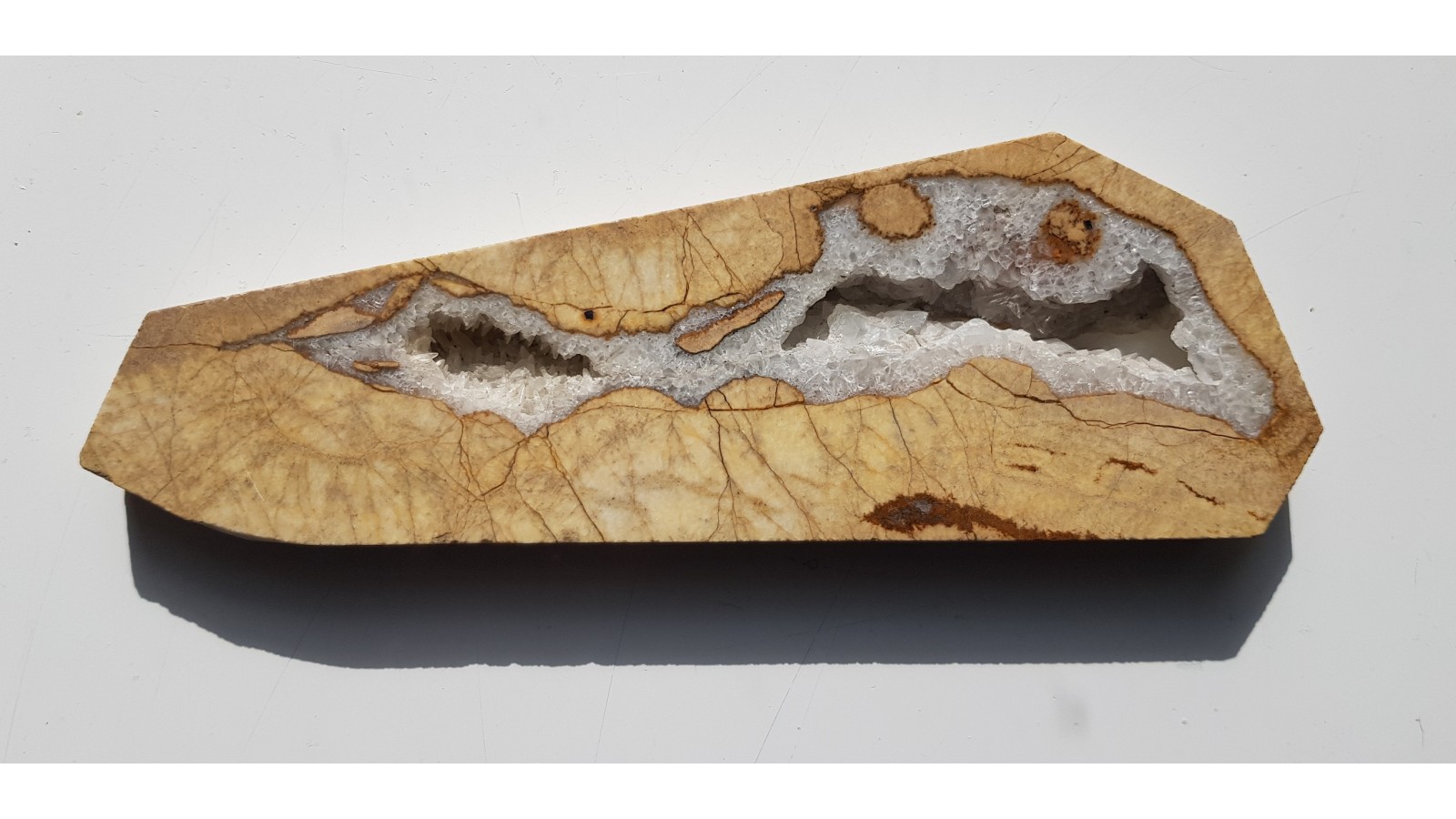 Ozdobny dolomit z kawerną wypełnioną kryształami kalcytu, sformatowany do celów ozdobnych oraz z powierzchnia polerowaną. Dolomit ze złoża Sławniowice w południowej części województwa opolskiego. Polecam.