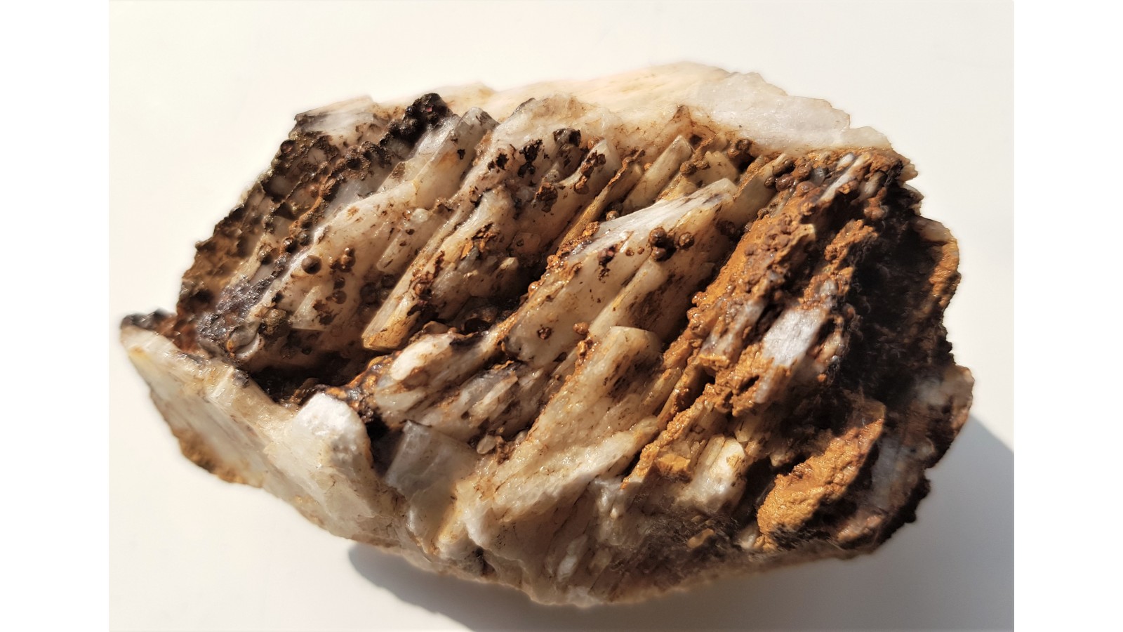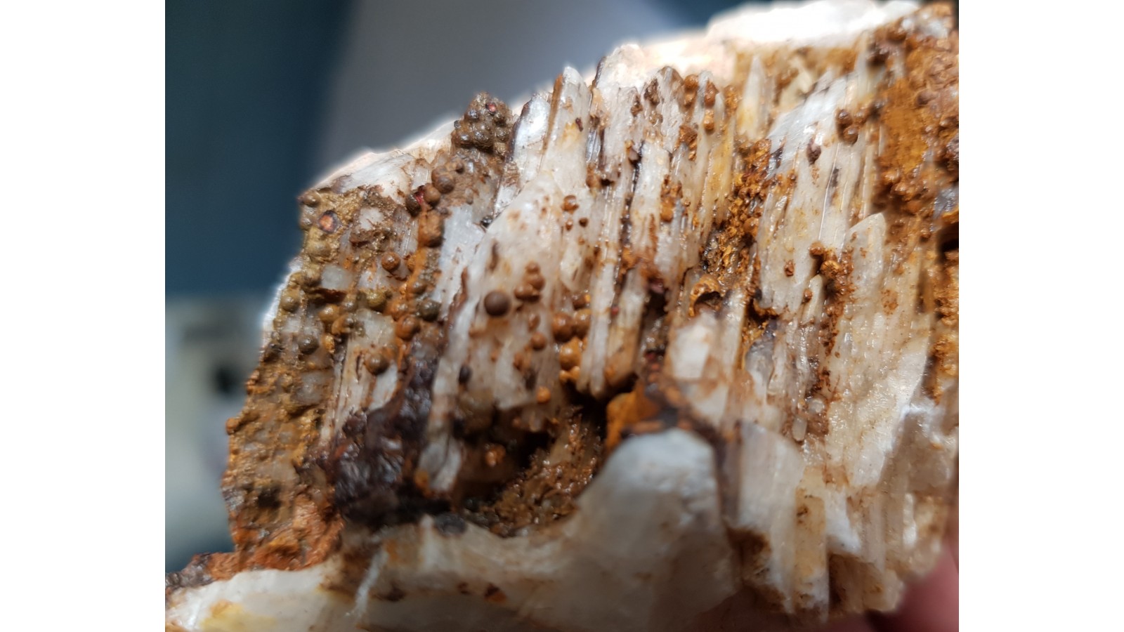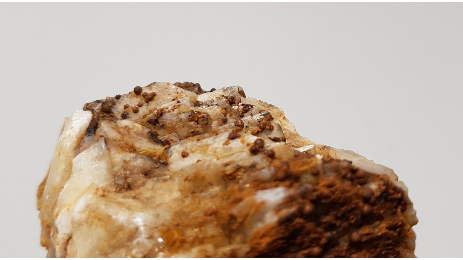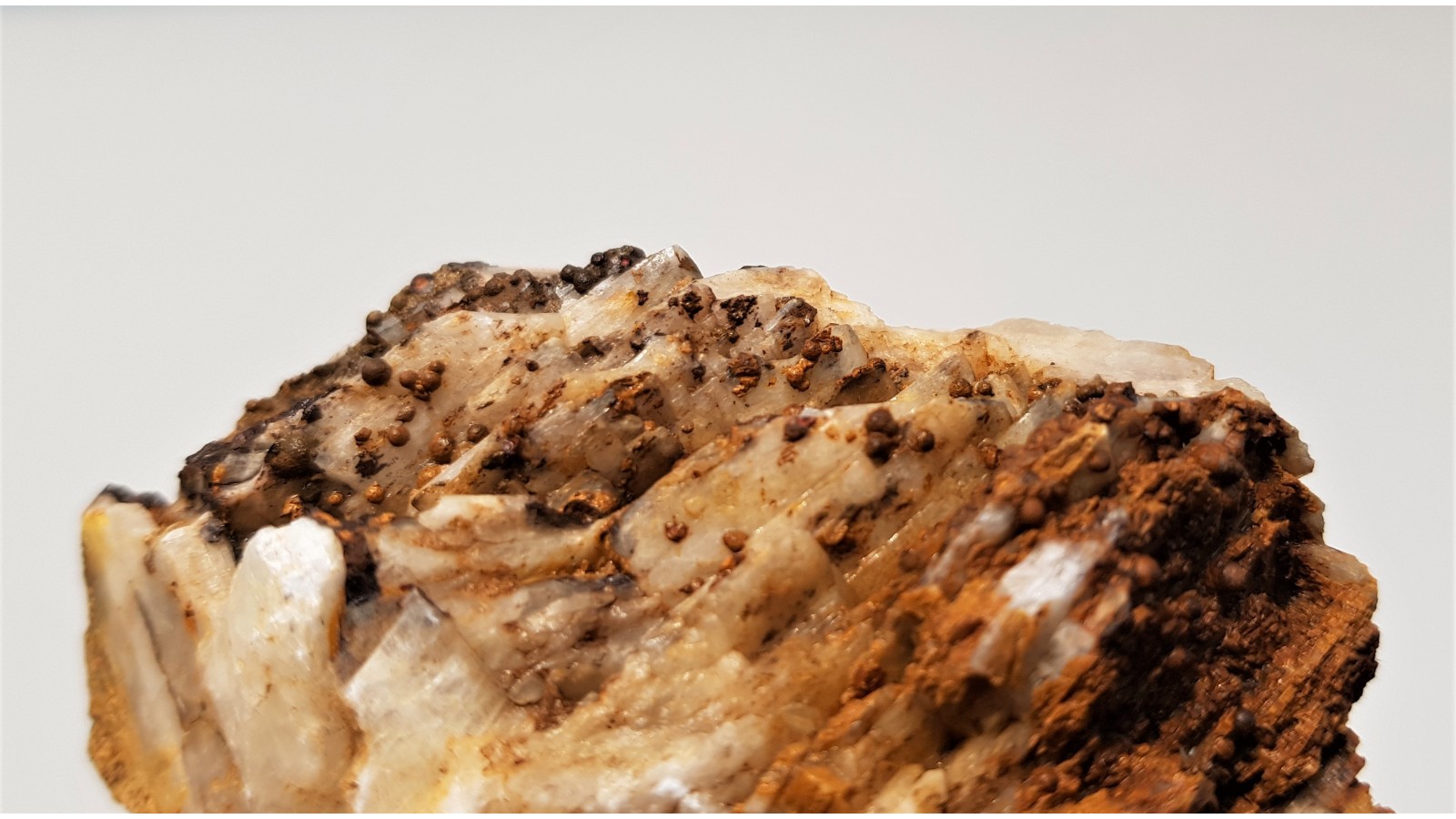 Szczotka kryształów barytu wykształconych grzebieniowo z kuleczkami limonitu z Boguszowa-Gorc. Kryształy barytu z połyskiem, zdecydowana większość całych. Okaz sprzed wielu lat, obecnie lokalizacja całkowicie "nieproduktywna", zamknięta. Rzadkość, polecam.