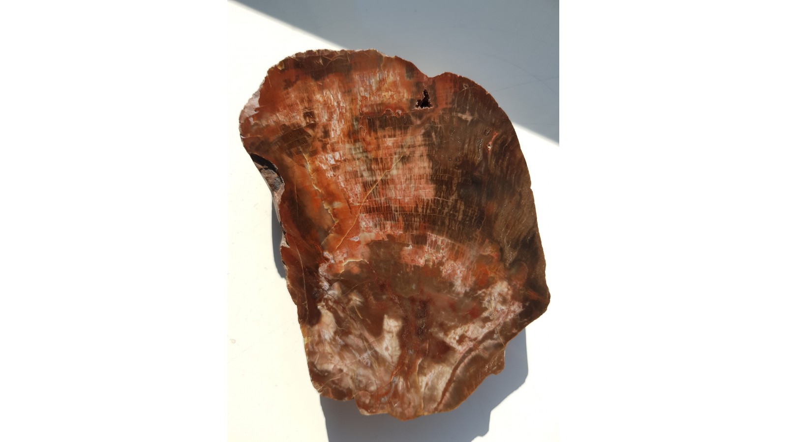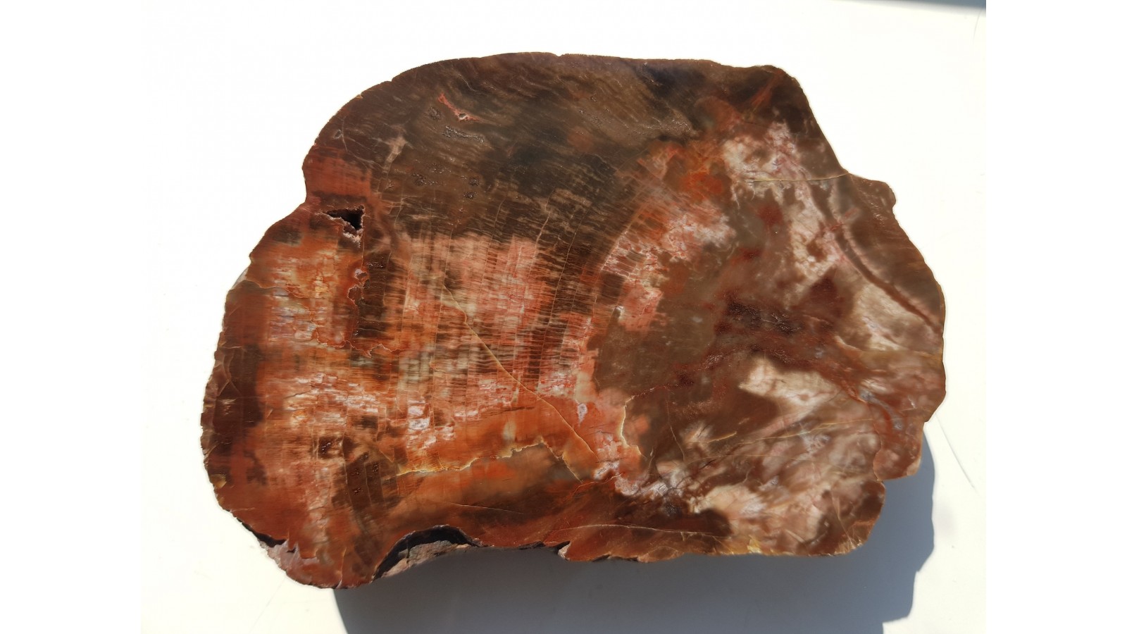 Piękne, wyraziste drewno skrzemieniałe, czerwono-brązowe z wyrazistą budową wewnętrzną z aluwiów Nysy Kłodzkiej z okolic Kamieńca Ząbkowickiego. Fragmeny przekroju pnia sięgający centrum. Strona przeciwna po cięciu, solidny plaster. Polecam.