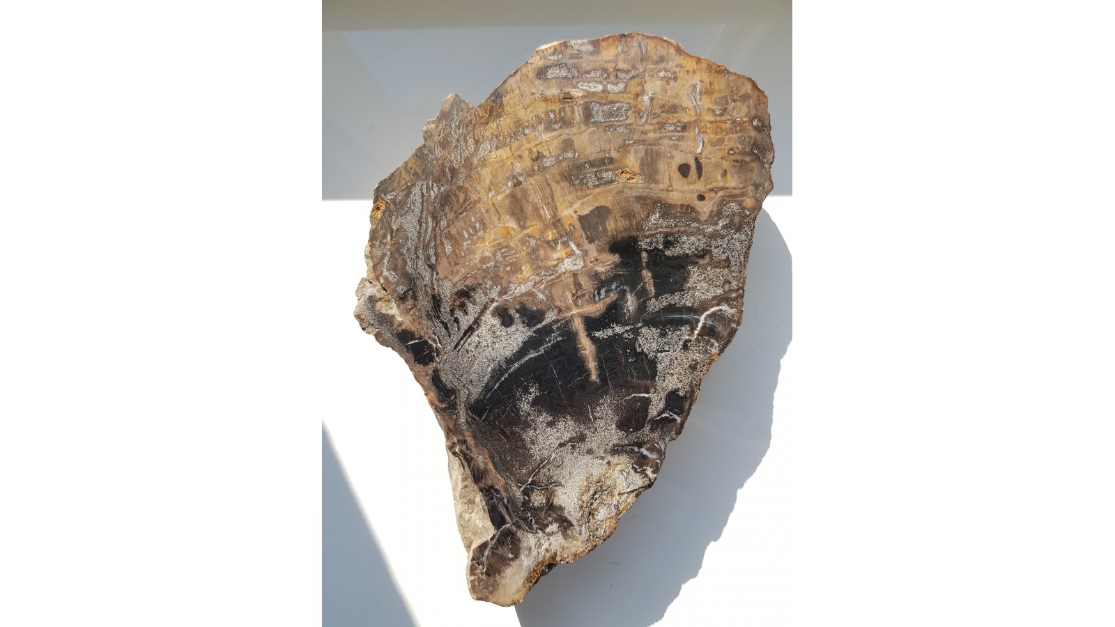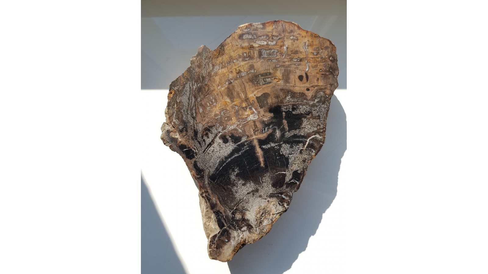 Wyjątkowo piękny, duży przekrój drewna skrzemieniałego pochodzący ze zlepieńców karbonu/permu z rowu Świerzawy (fragment depresji północnosudeckiej). Przekrój sięga centrum pnia. Idealny poler, bardzo estetyczny okaz, wyrazista barwa. Strona przeciwna po cięciu. Solidny plaster. Polecam.
