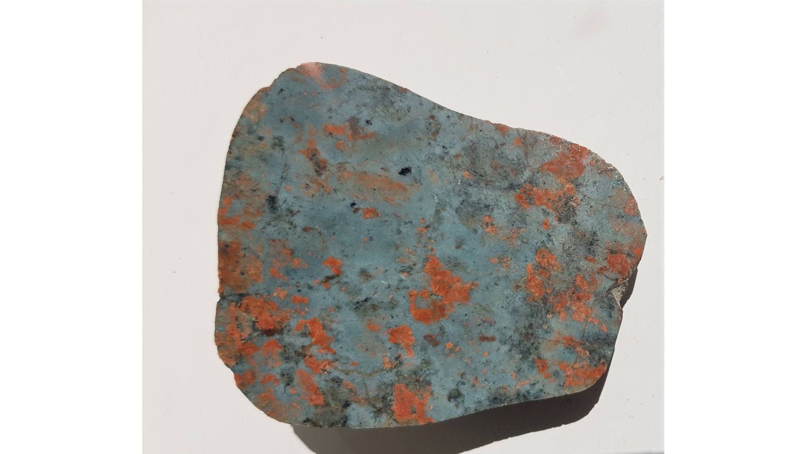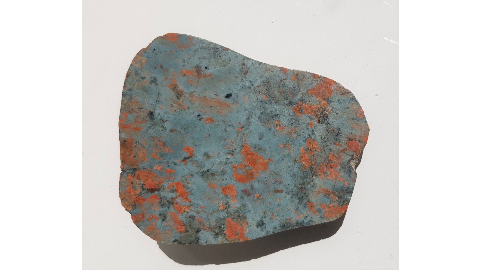 Wyjątkowa skała ozdobna o żywej i intensywnej barwie niebieskiej z pomarańczowymi pietnami. Skała masywna, niespękana, idealny poler. Wyjątkowy eratyk z województwa lubuskiego. Polecam.