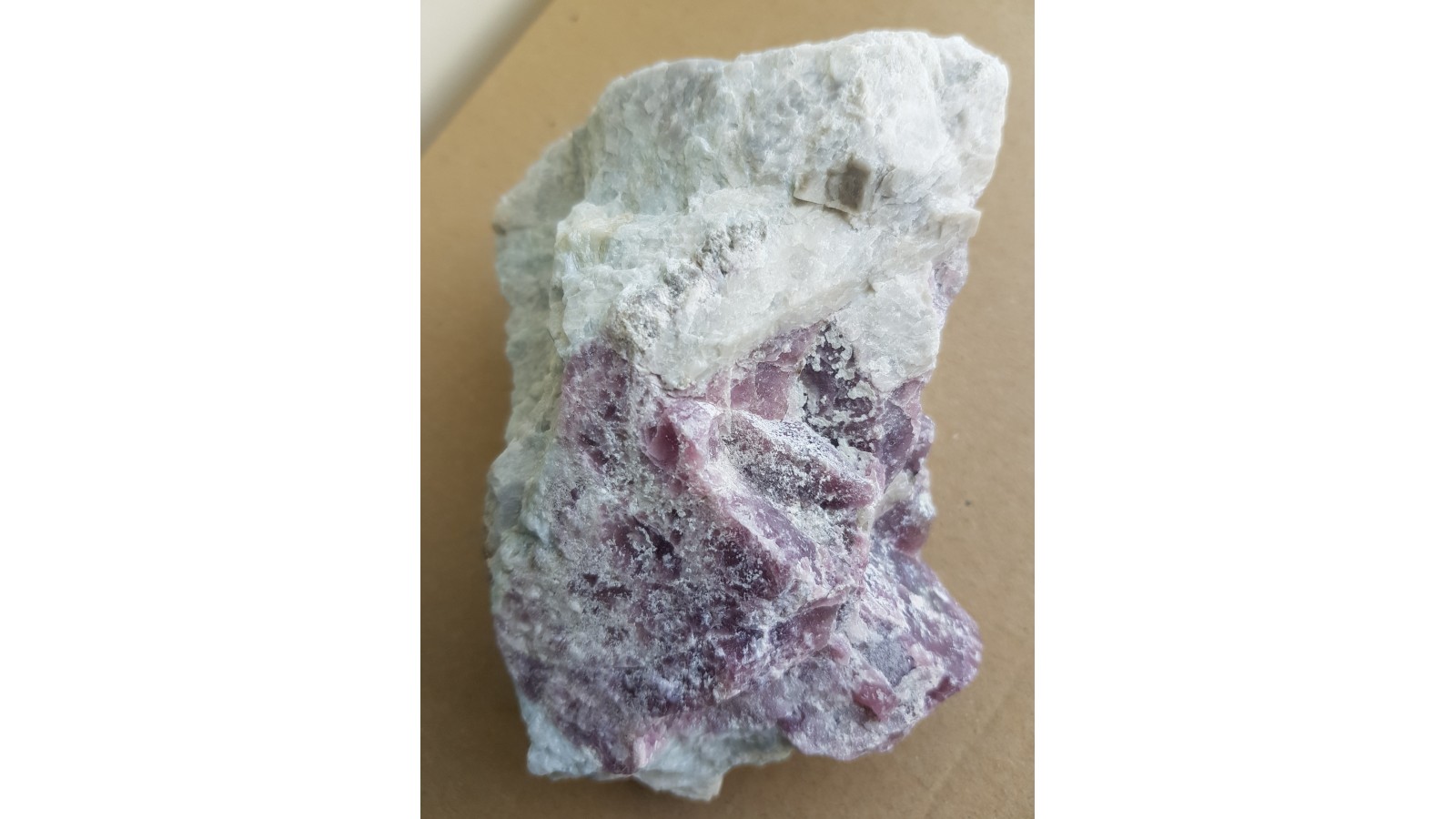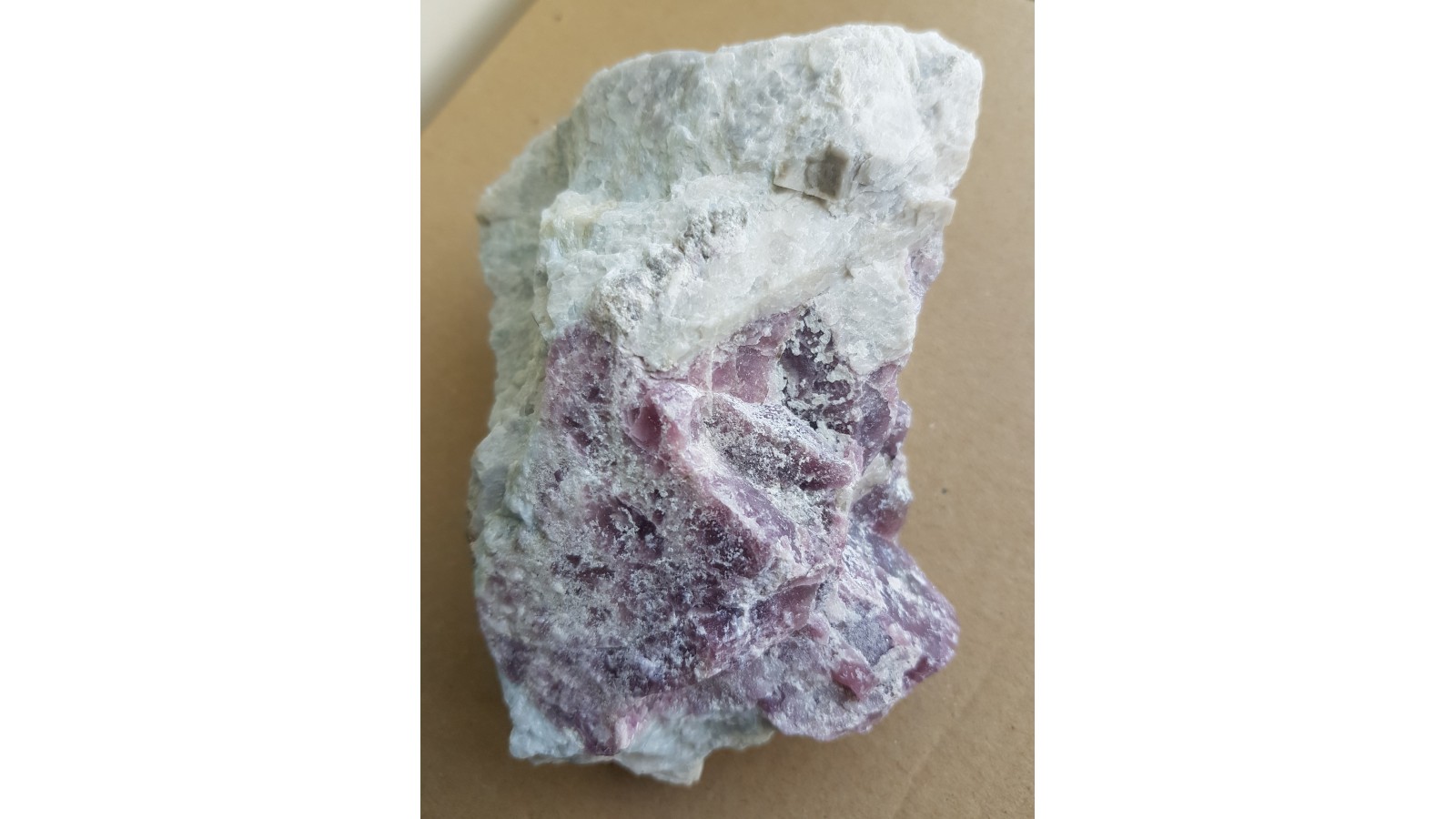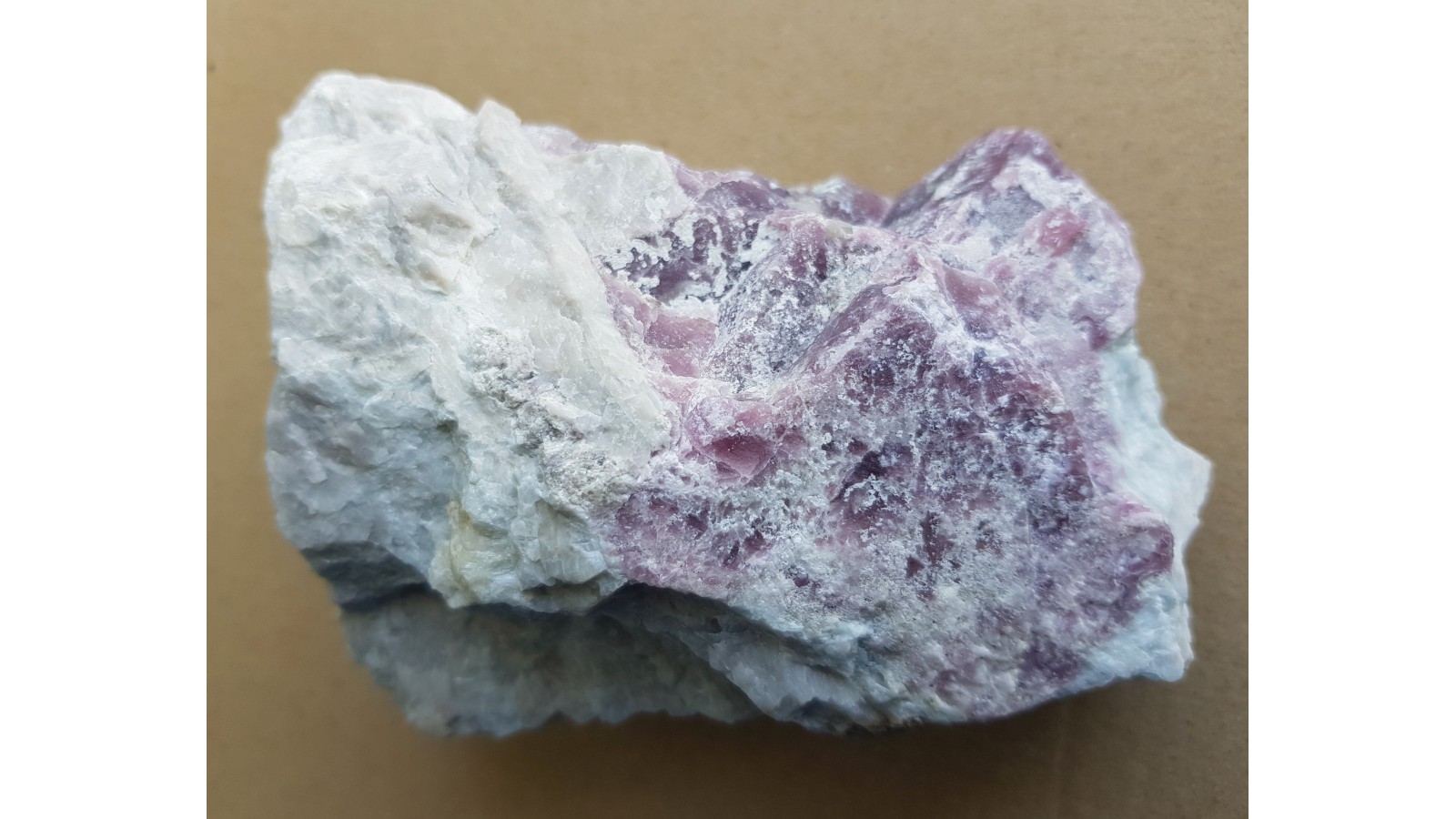 Masywna, intensywnie zabarwiona na kolor fioletowoczerwony, nieco przeświecająca odmiana lepidolitu w pegmatycie litowym z Piławy Górnej. Okaz naturalny, bez obróbki. Polecam.