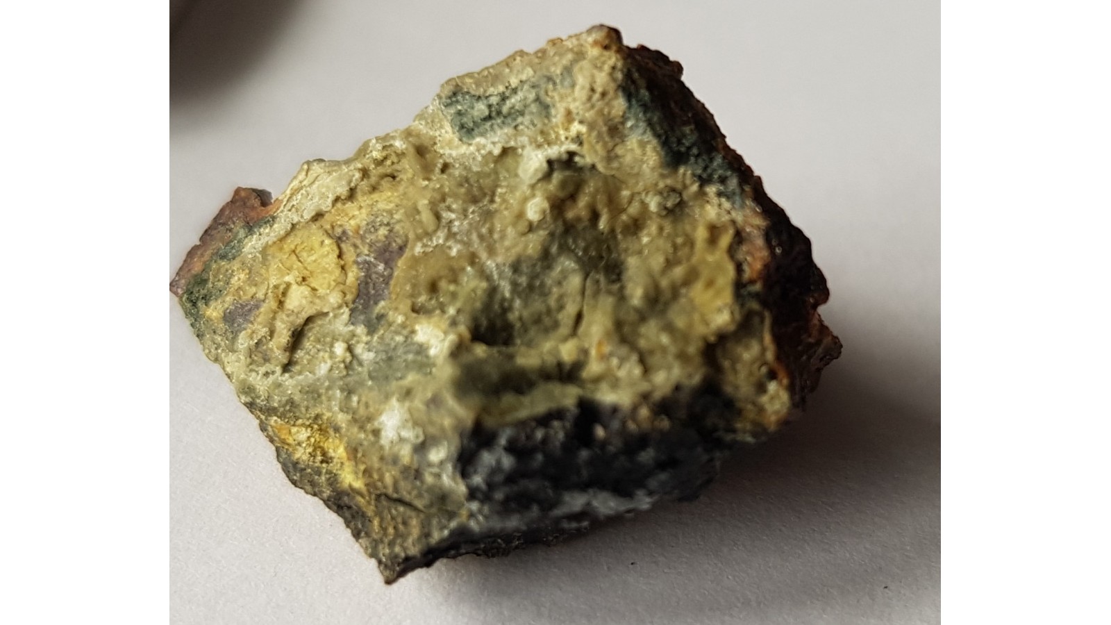 Rzadki, wtórny arsenian żelaza ze złoża w Złotym Stoku w postaci naciekowej na fragmencie rudy. Barwa zielona, budowa kolomorficzna. Bardzo rzadki minerał strefy hipergenicznej w Sudetach. Niewielki okaz, ciekawostka mineralogiczna. Polecam.