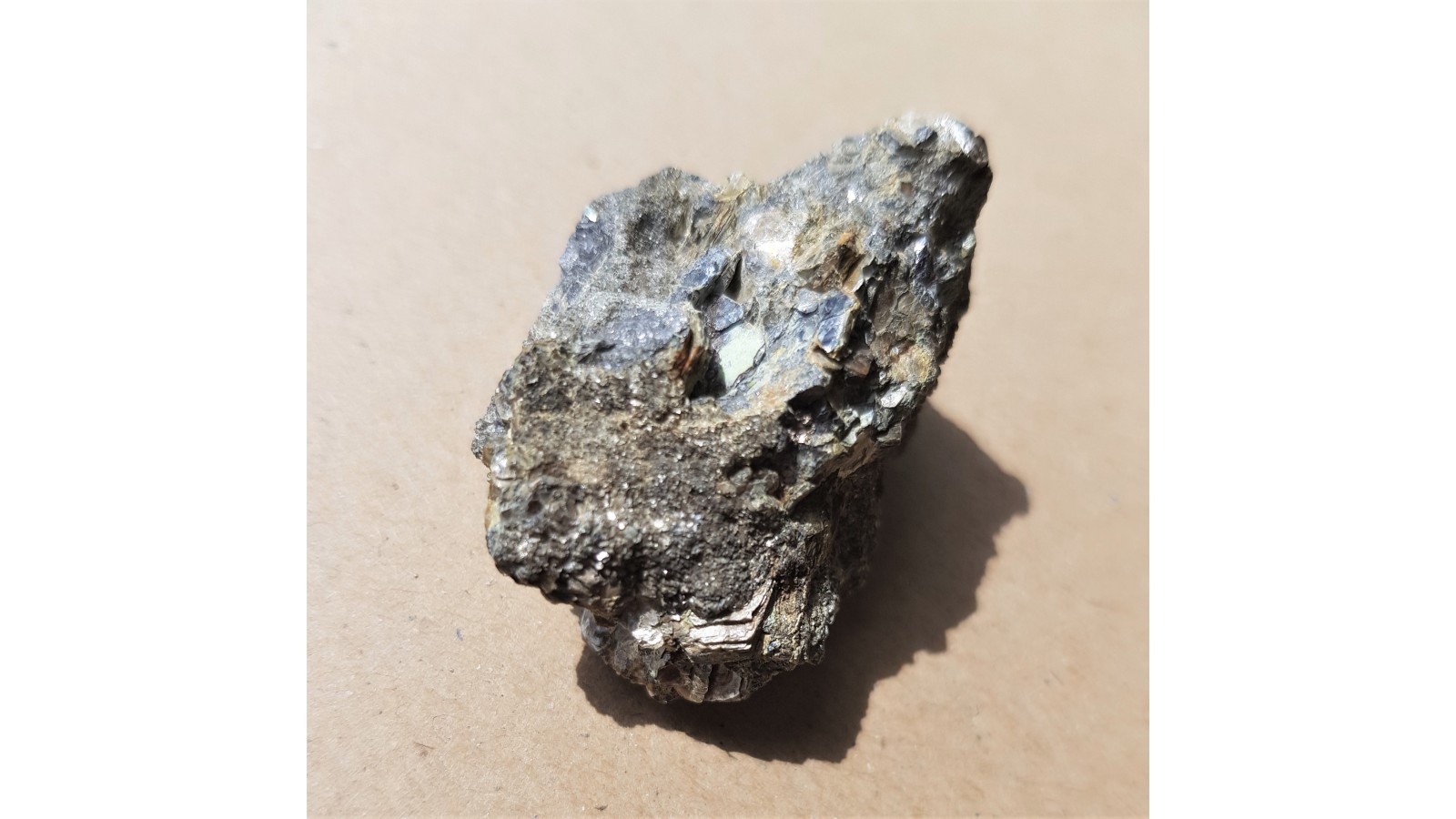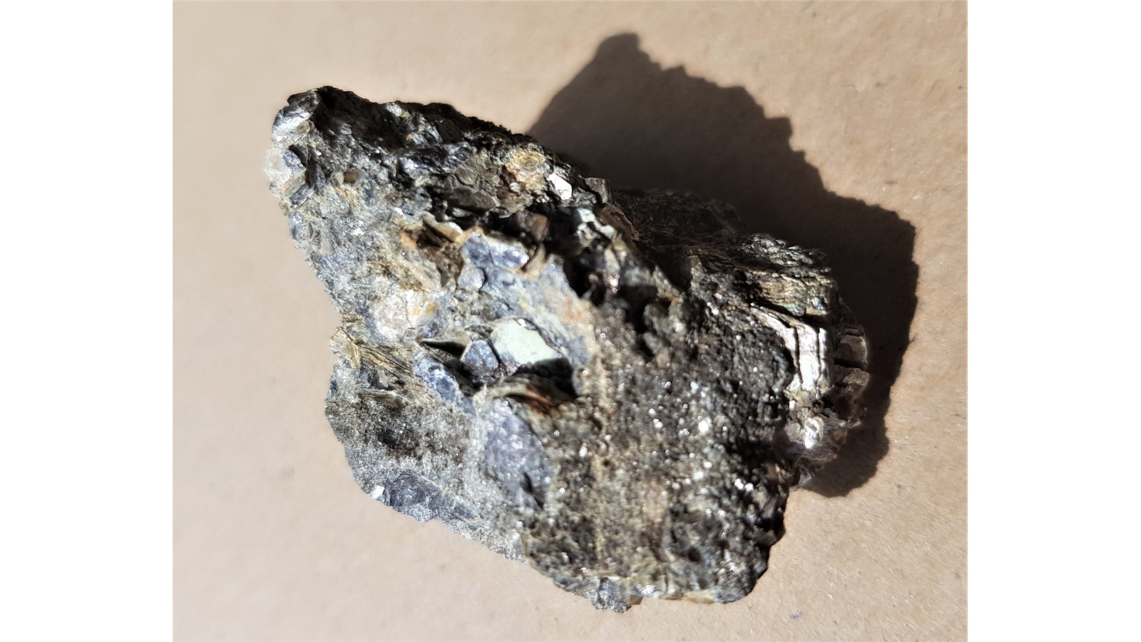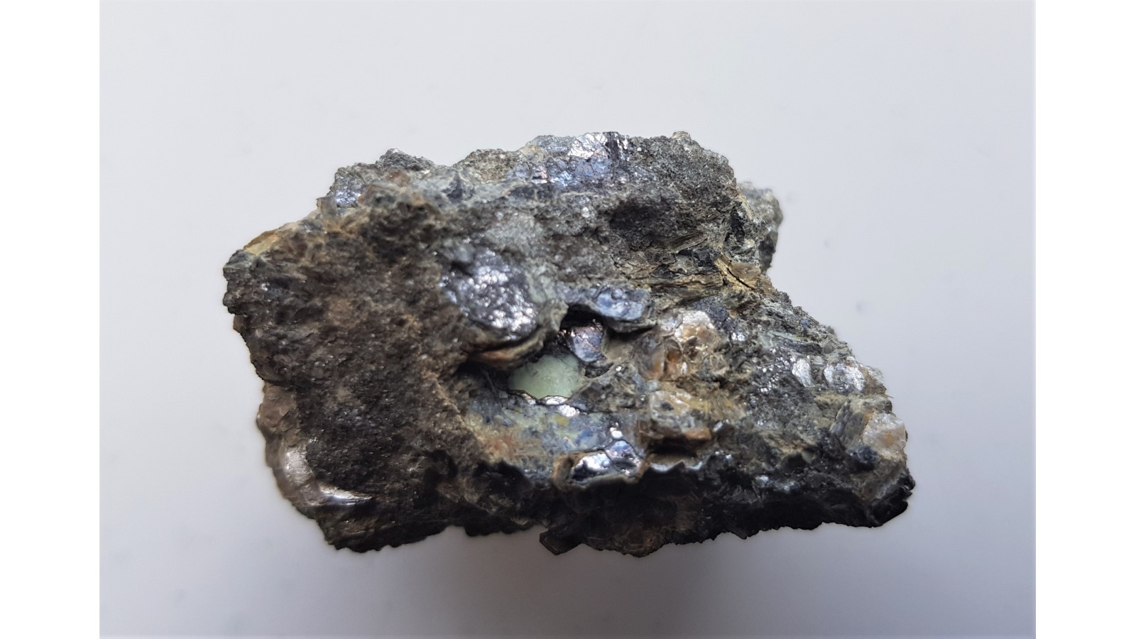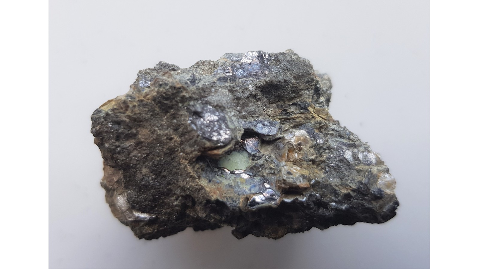 Okaz bizmutu rodzimego oraz bismitu (tlenek bizmutu częściowo pokrywający skupienia bizmutu rodzimego) w żyle flogopitowej z Rędzin k. Kamiennej Góry. Wystąpienie historyczne, całkowicie wyeksploatowane. Unikat. Bryłka bardzo ciężka, bizmut rodzimy doskonale widoczny. Okaz bez jakiejkolwiek obróbki. Polecam.
