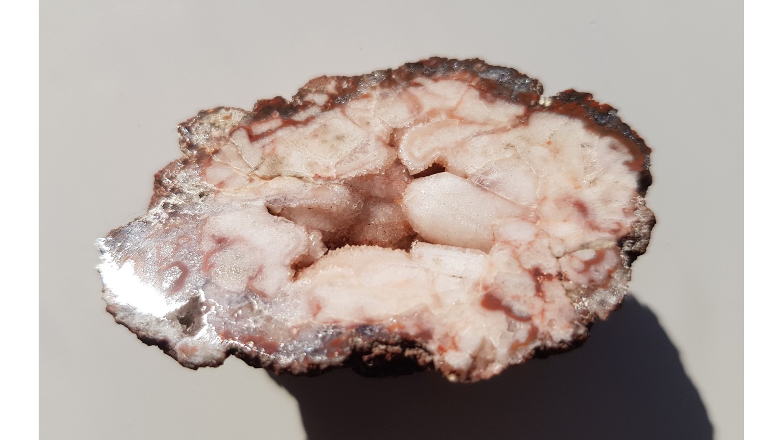 Geodka z mlecznymi kryształami kwarcu pokrytymi drobniutkimi, skrzącymi się małymi kwarcami o silnym połysku, z mało znanej lokalizacji w Czadrowie k. Kamiennej Góry. Poler z jednej strony, z przeciwnej naturalna powierzchnia geody. Polecam.
